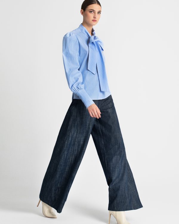 Denim shirt with bow tie and puff sleeves – Moutaki