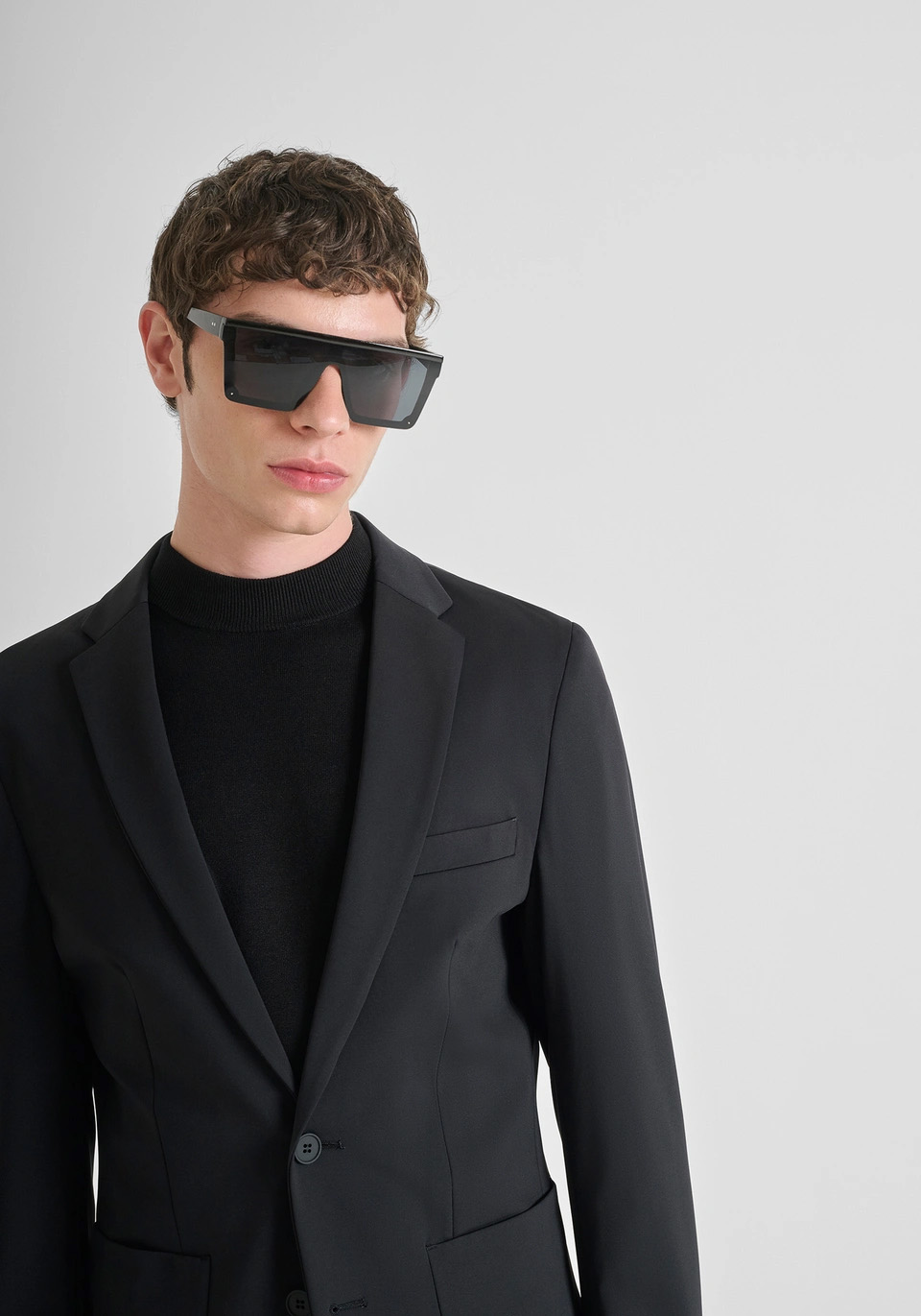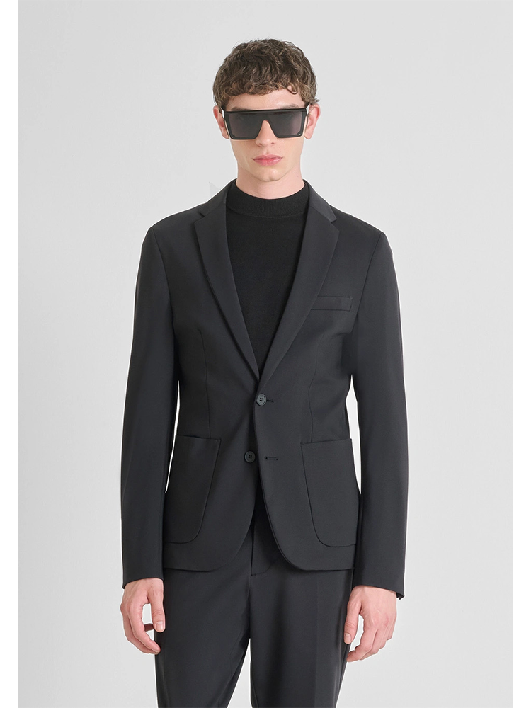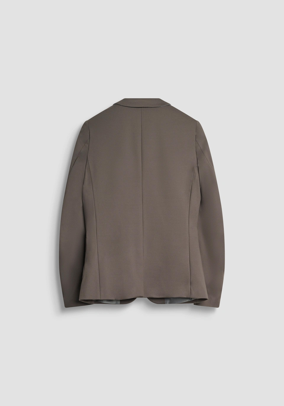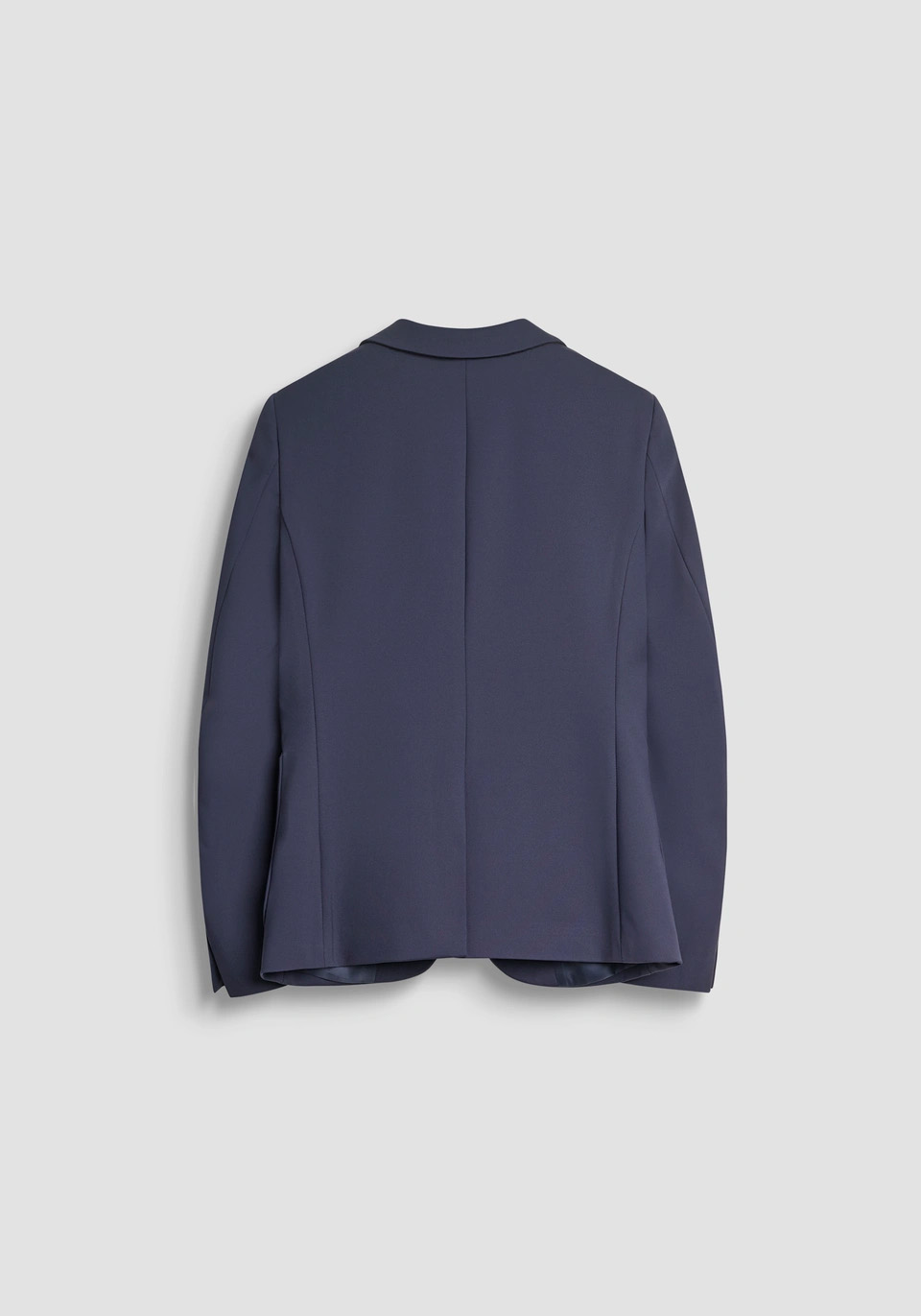 This slim fit jacket made from smooth, structured fabric. The single-breasted construction and subtle detailing emphasize its tailored elegance.