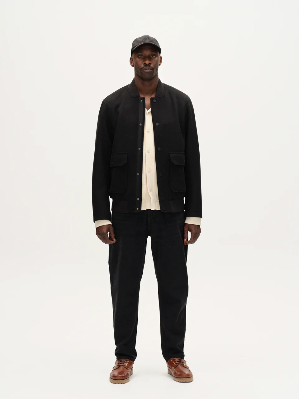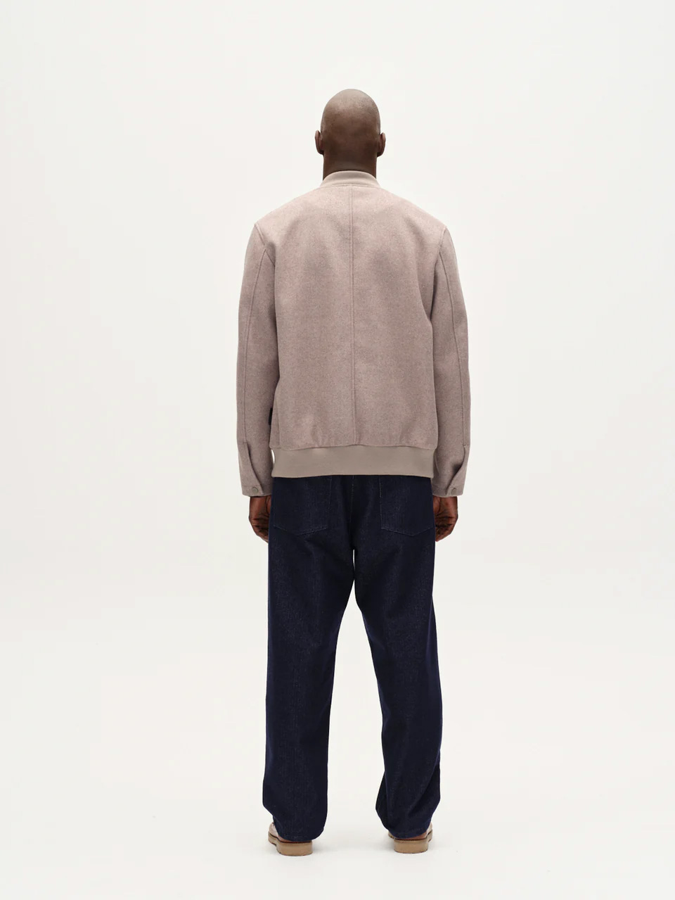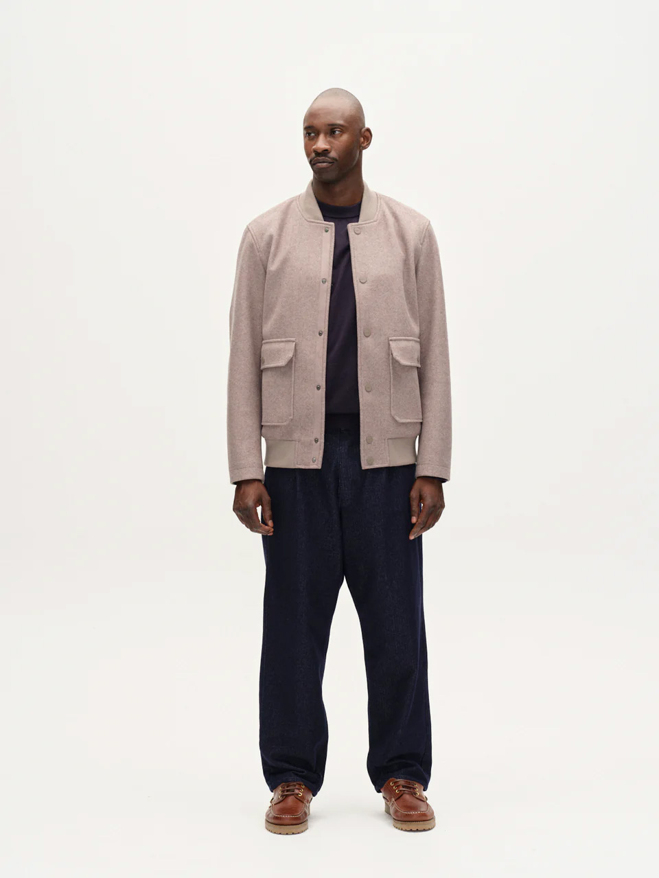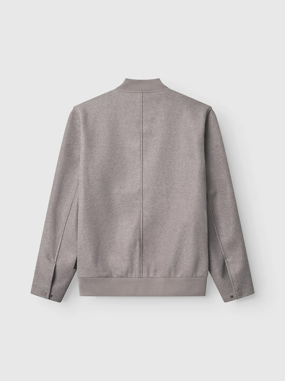 This jacket crafted in a soft wool-blend fabric, it features a collarless neckline and snap-button front closure. Two large flap pockets add a practical yet stylish touch, while the ribbed hem and cuffs provide a comfortable, tailored fit.