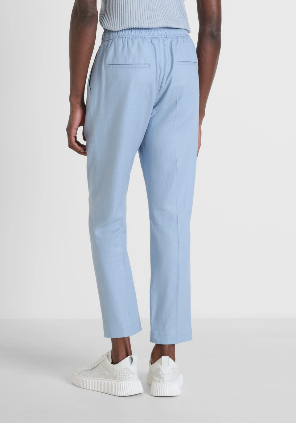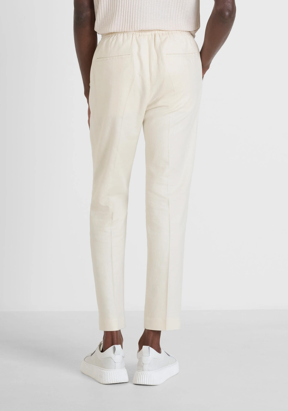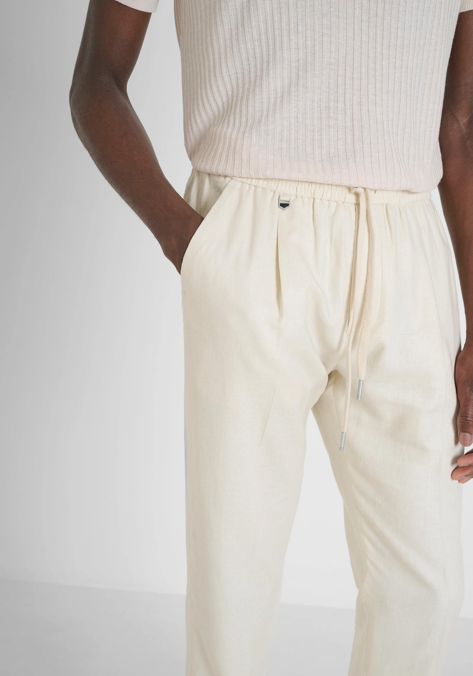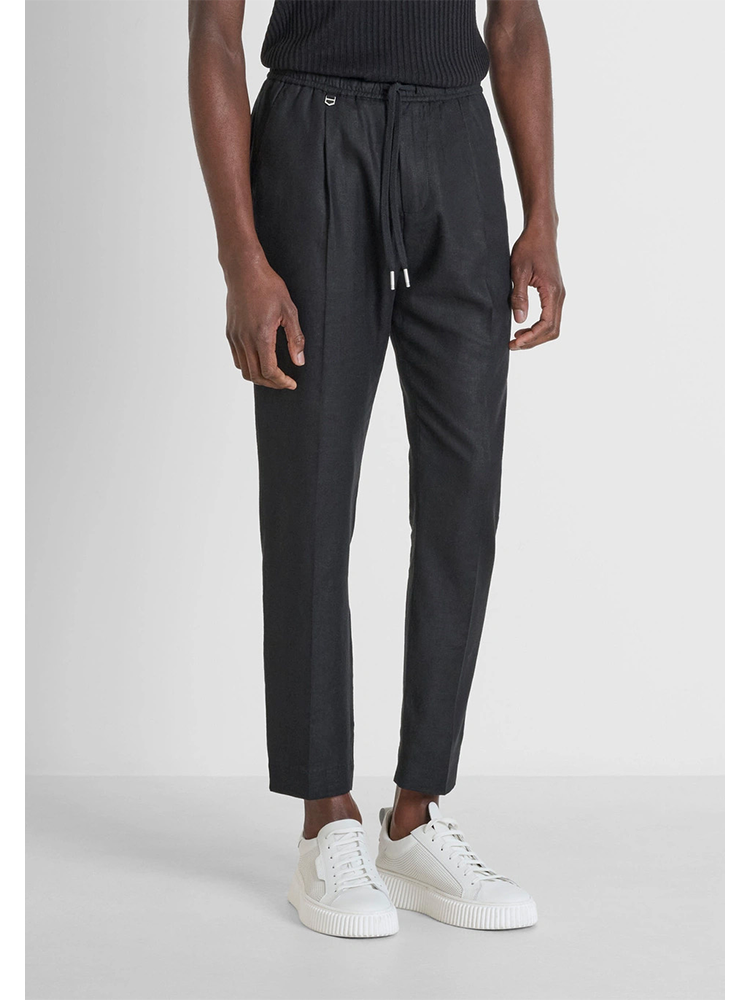 Linen-blend trousers featuring a comfortable elastic waistband and adjustable drawstring. Tapered leg, front pleats, and a cropped ankle length, they offer a sleek yet relaxed silhouette from Antomy Morato