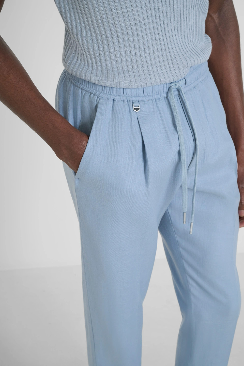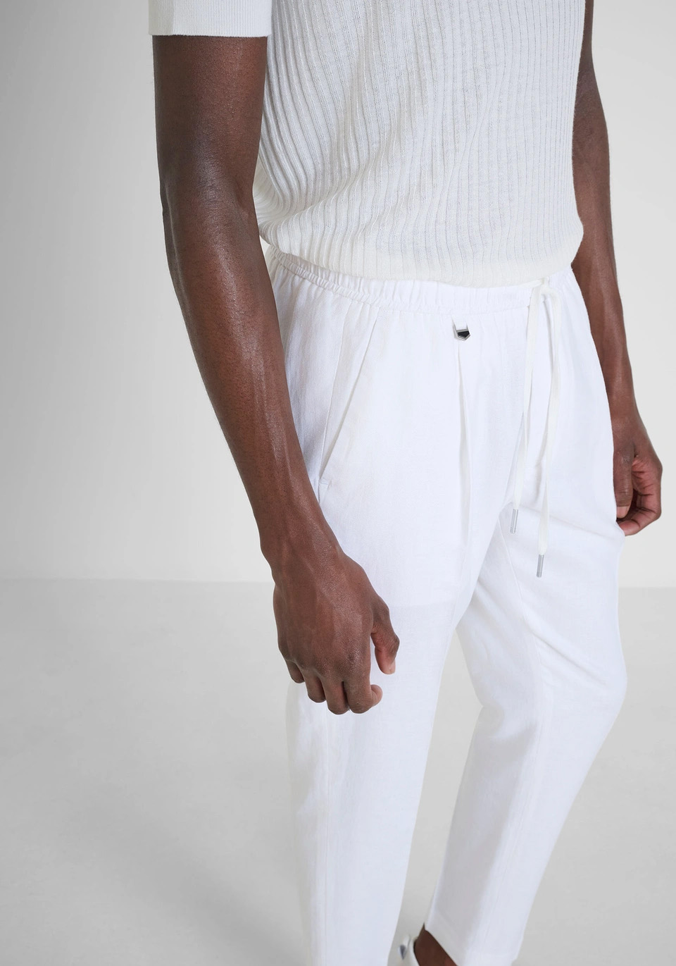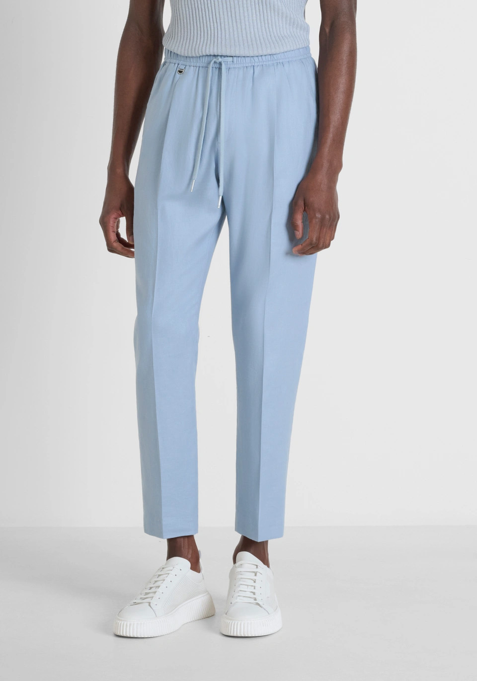 Linen-blend trousers featuring a comfortable elastic waistband and adjustable drawstring. Tapered leg, front pleats, and a cropped ankle length, they offer a sleek yet relaxed silhouette from Antomy Morato
