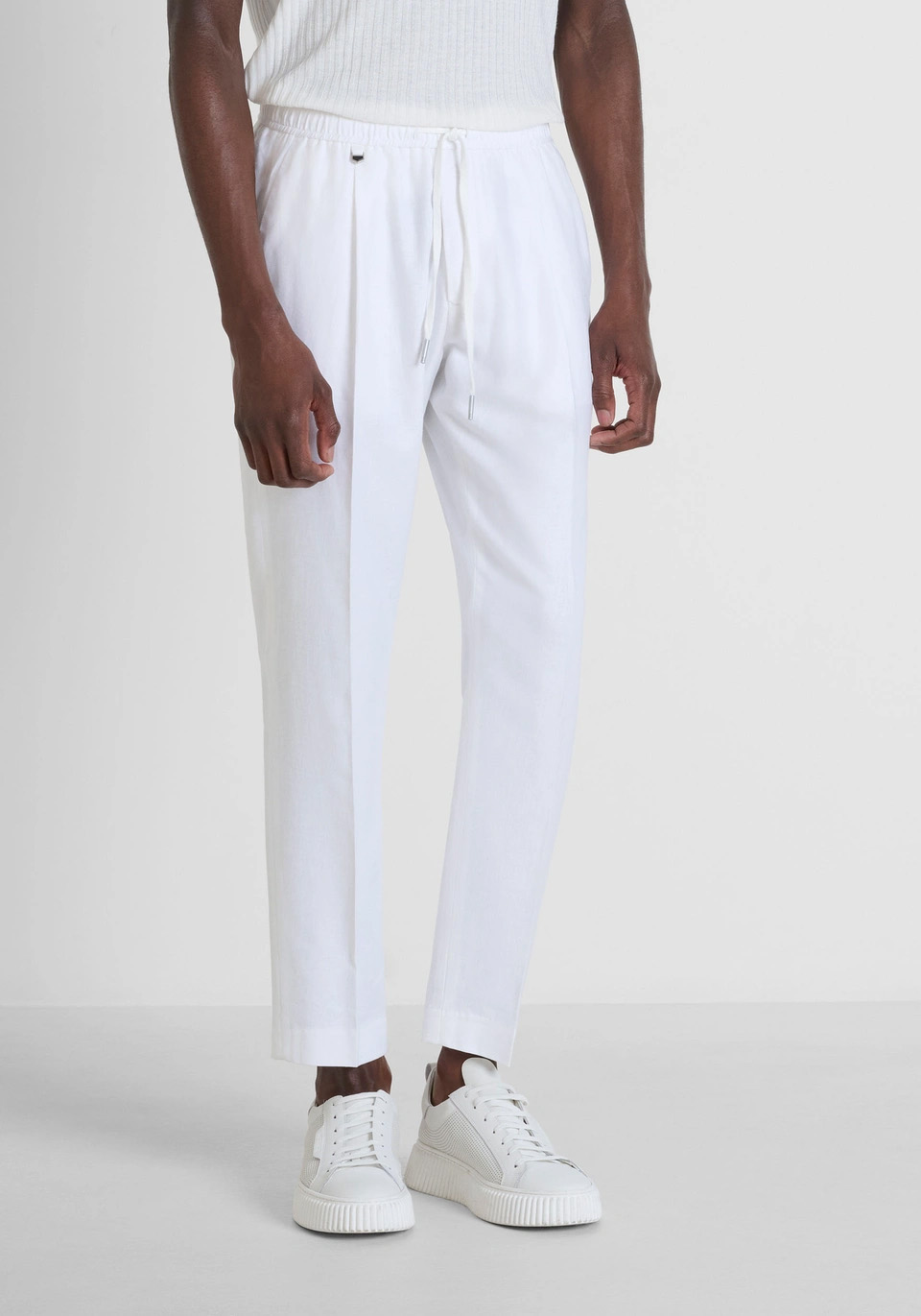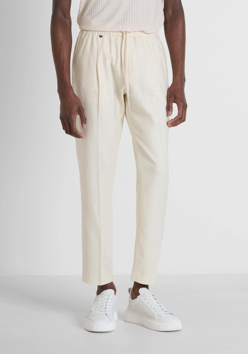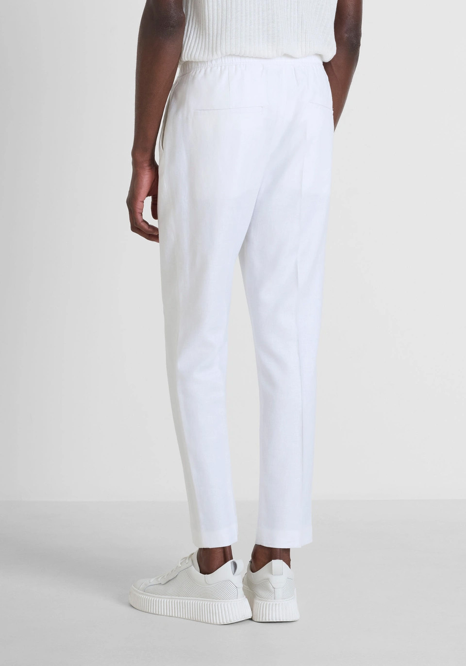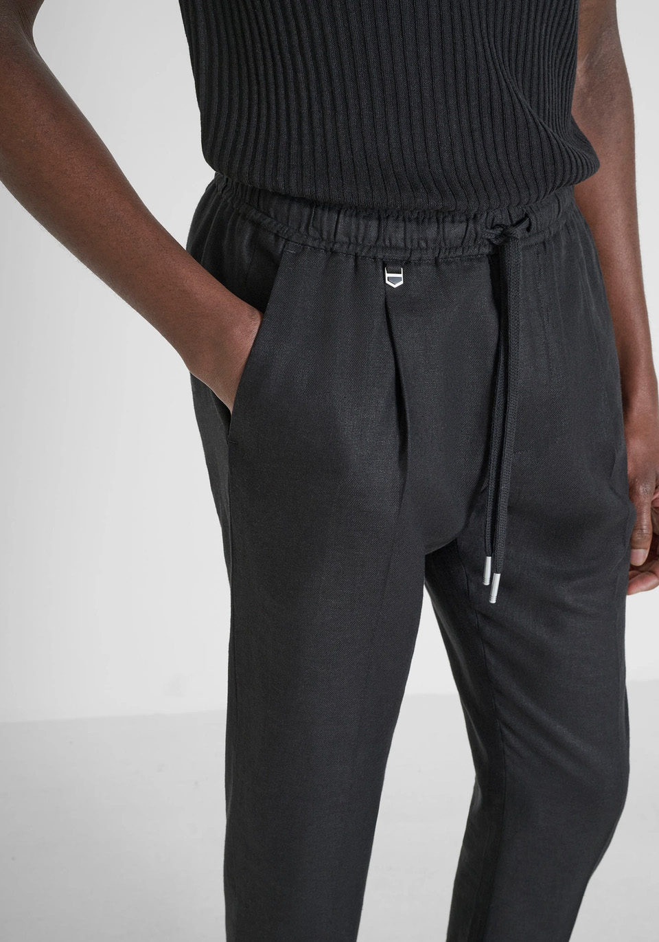 Linen-blend trousers featuring a comfortable elastic waistband and adjustable drawstring. Tapered leg, front pleats, and a cropped ankle length, they offer a sleek yet relaxed silhouette from Antomy Morato