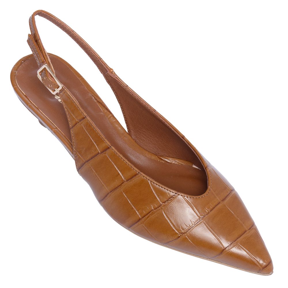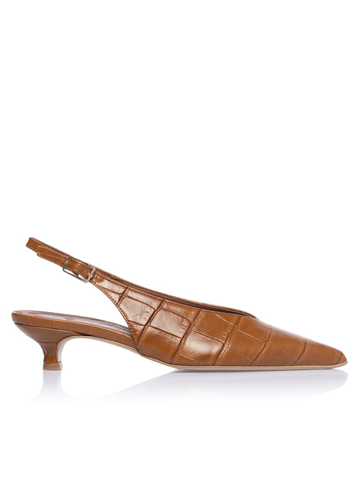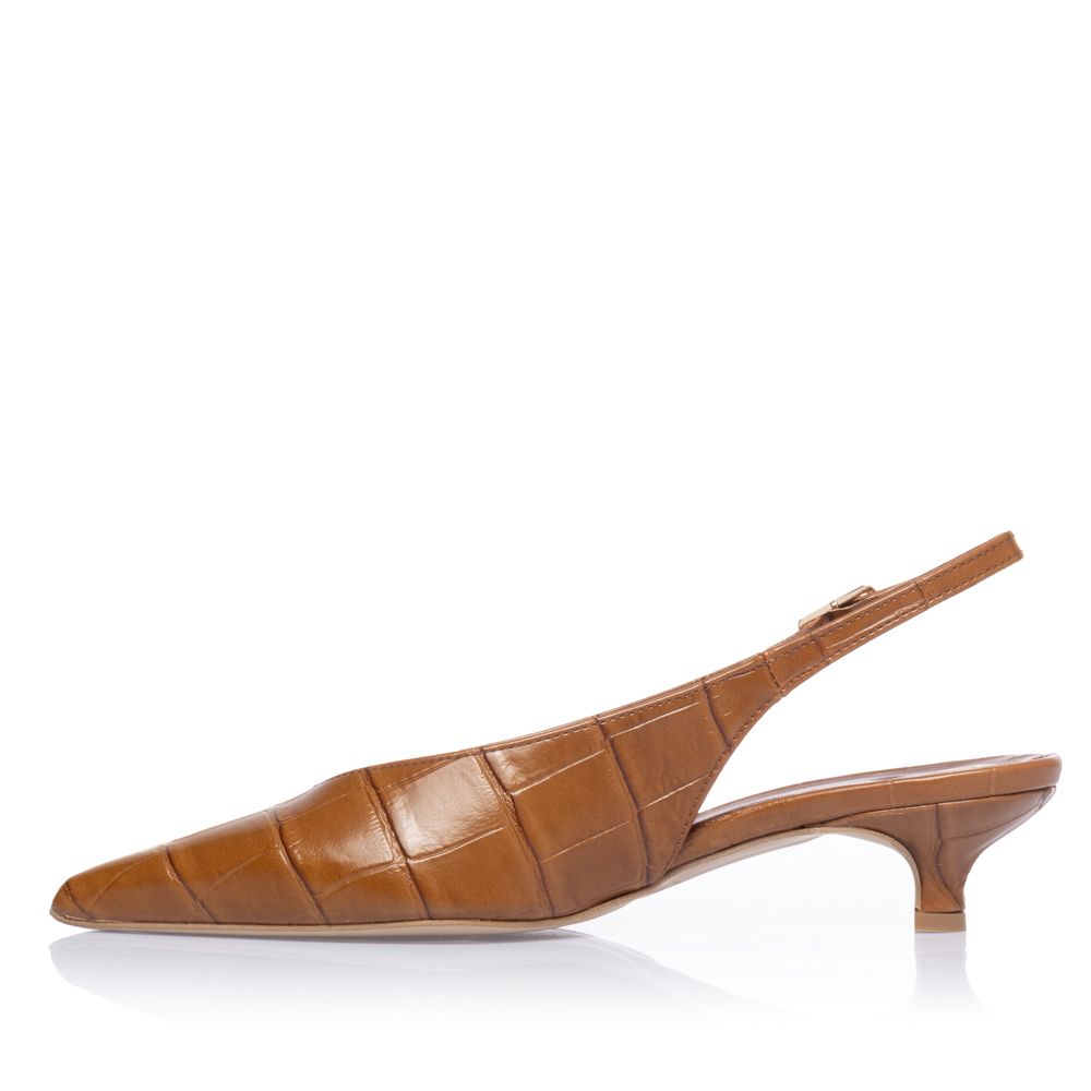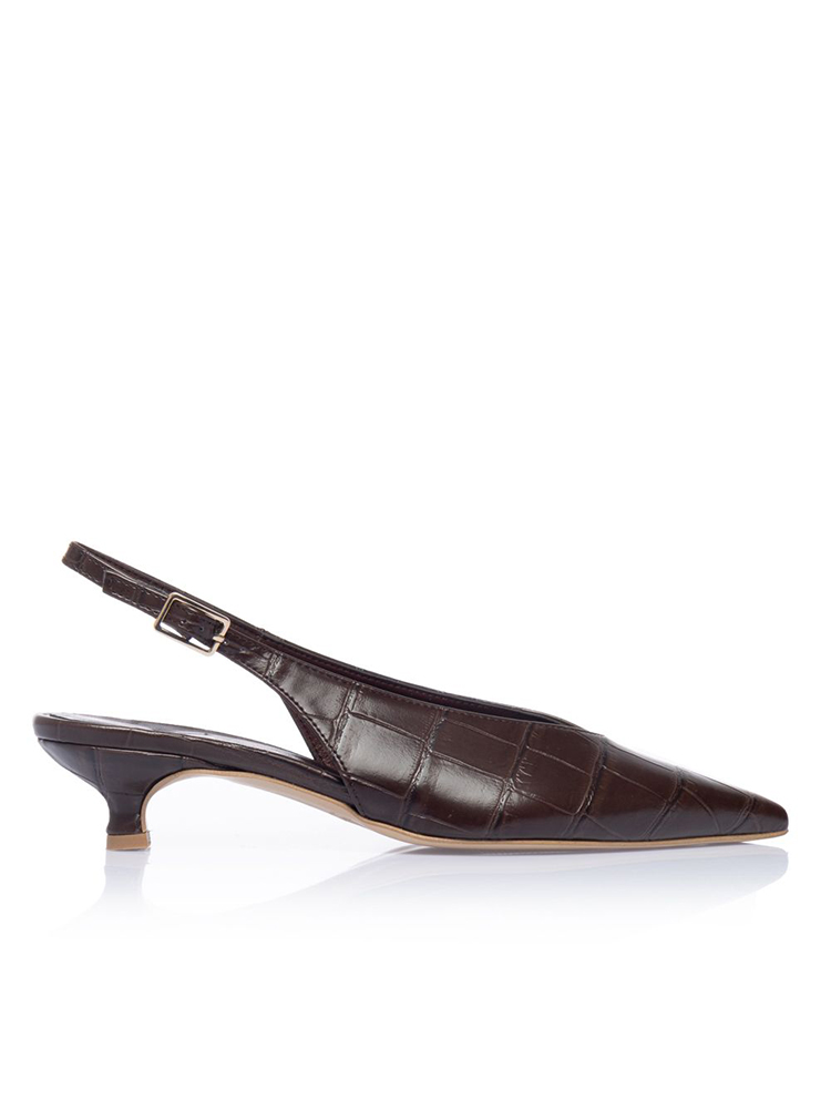 These pumps from Sante Shoes blend elegance and comfort with croco-effect eco leather, a pointed toe, and a low kitten heel. The slingback design and cushioned insole ensure an easy, polished fit for all-day wear, crafted in Greece.