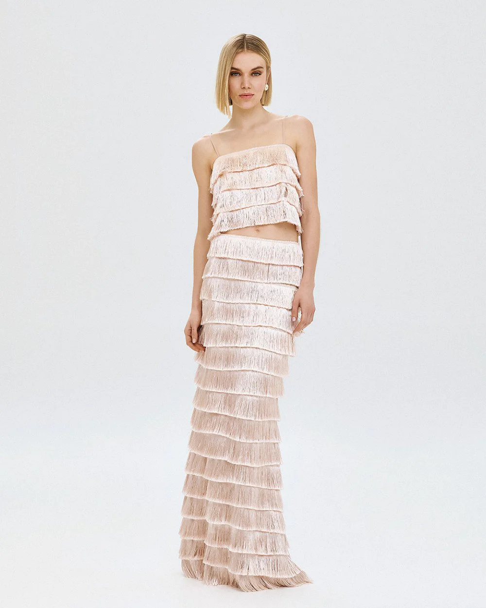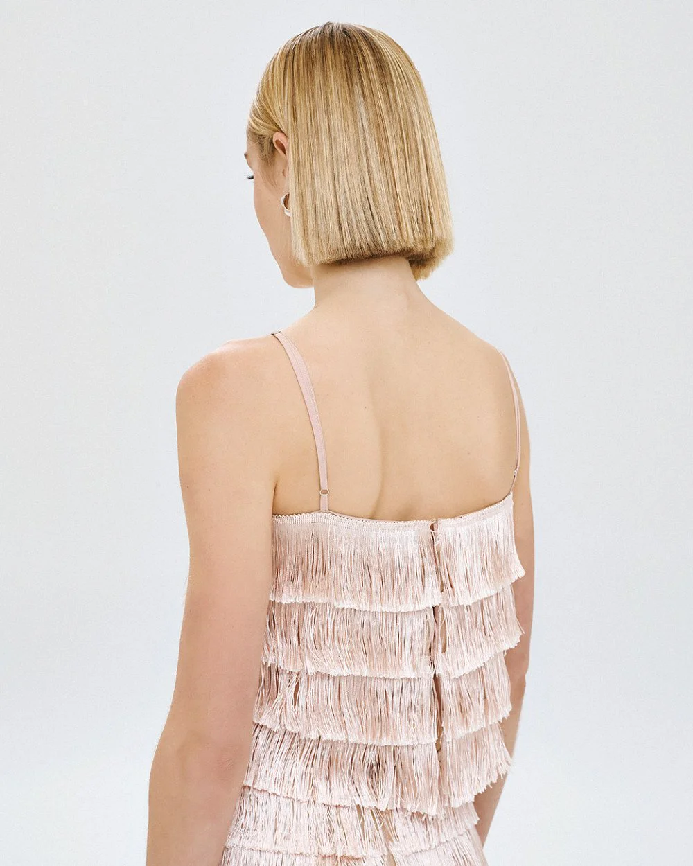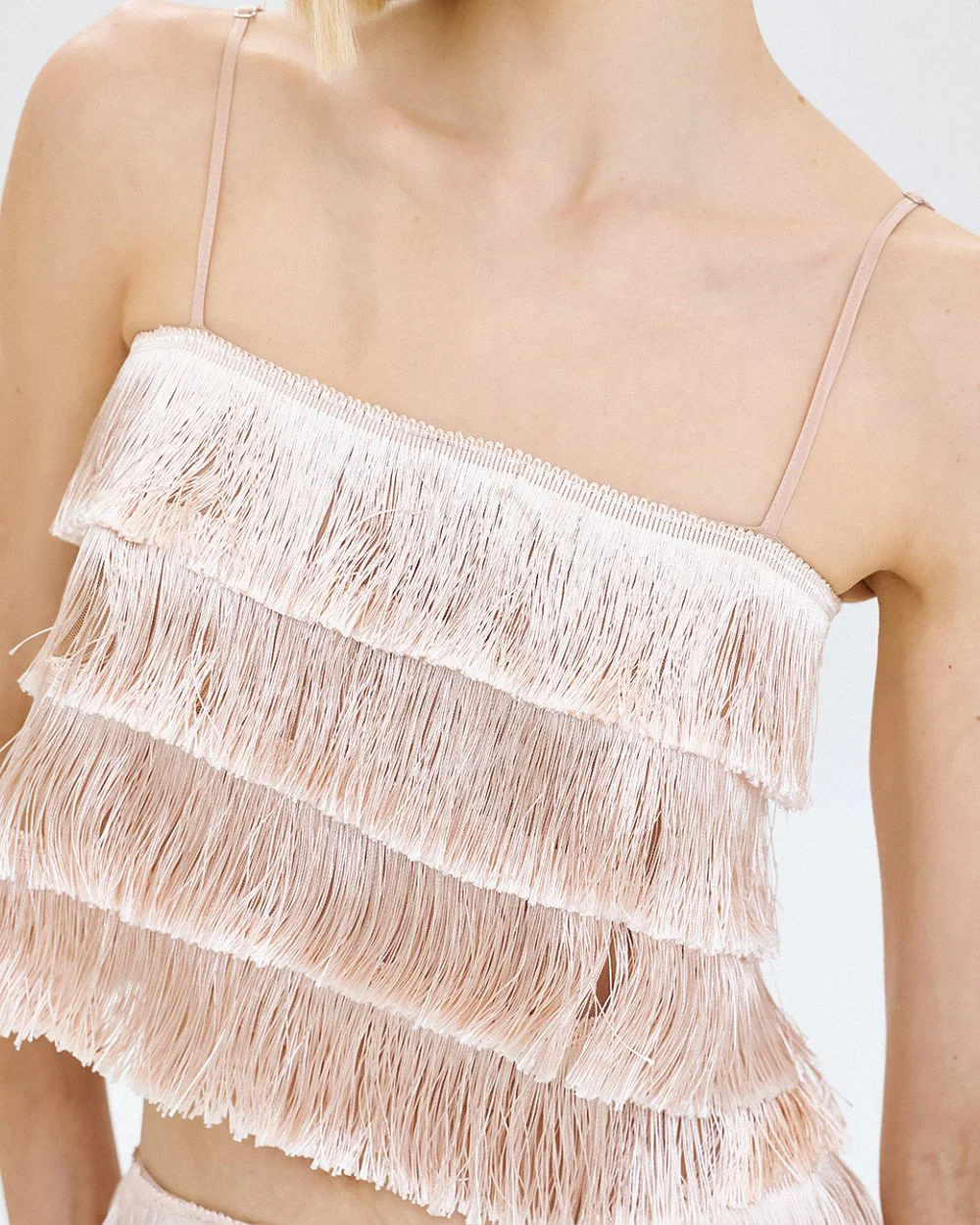 Cropped top with a square neckline and fringed layers from Access Fashion. Features thin adjustable straps and button closure at the back.