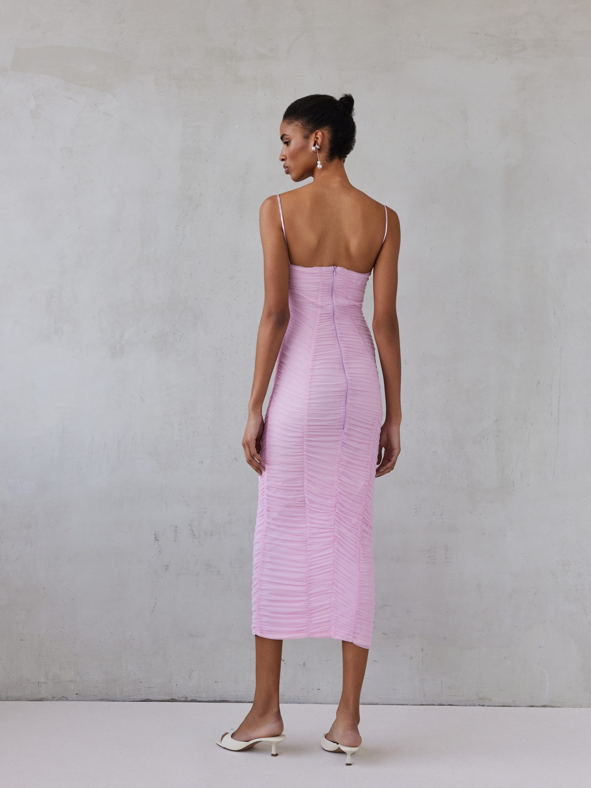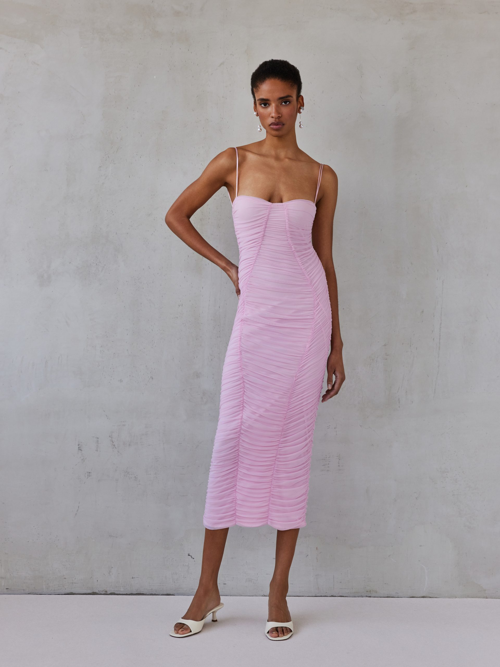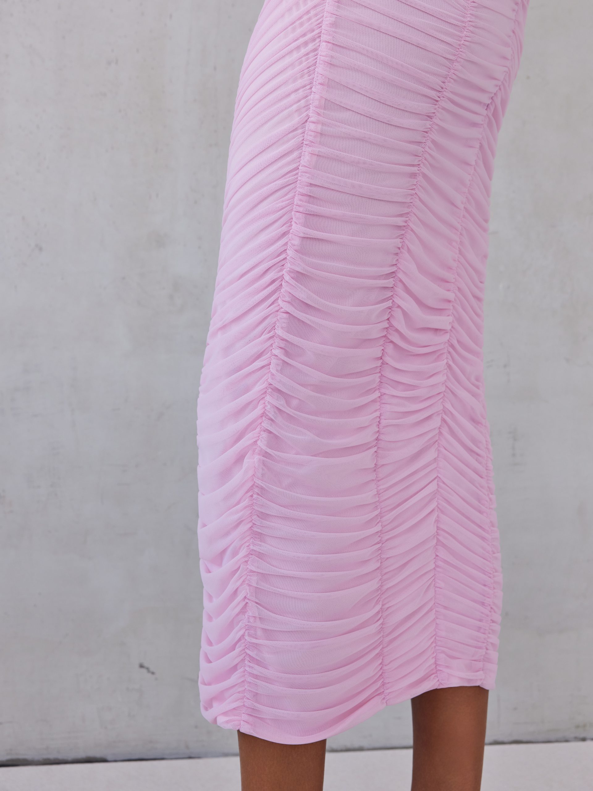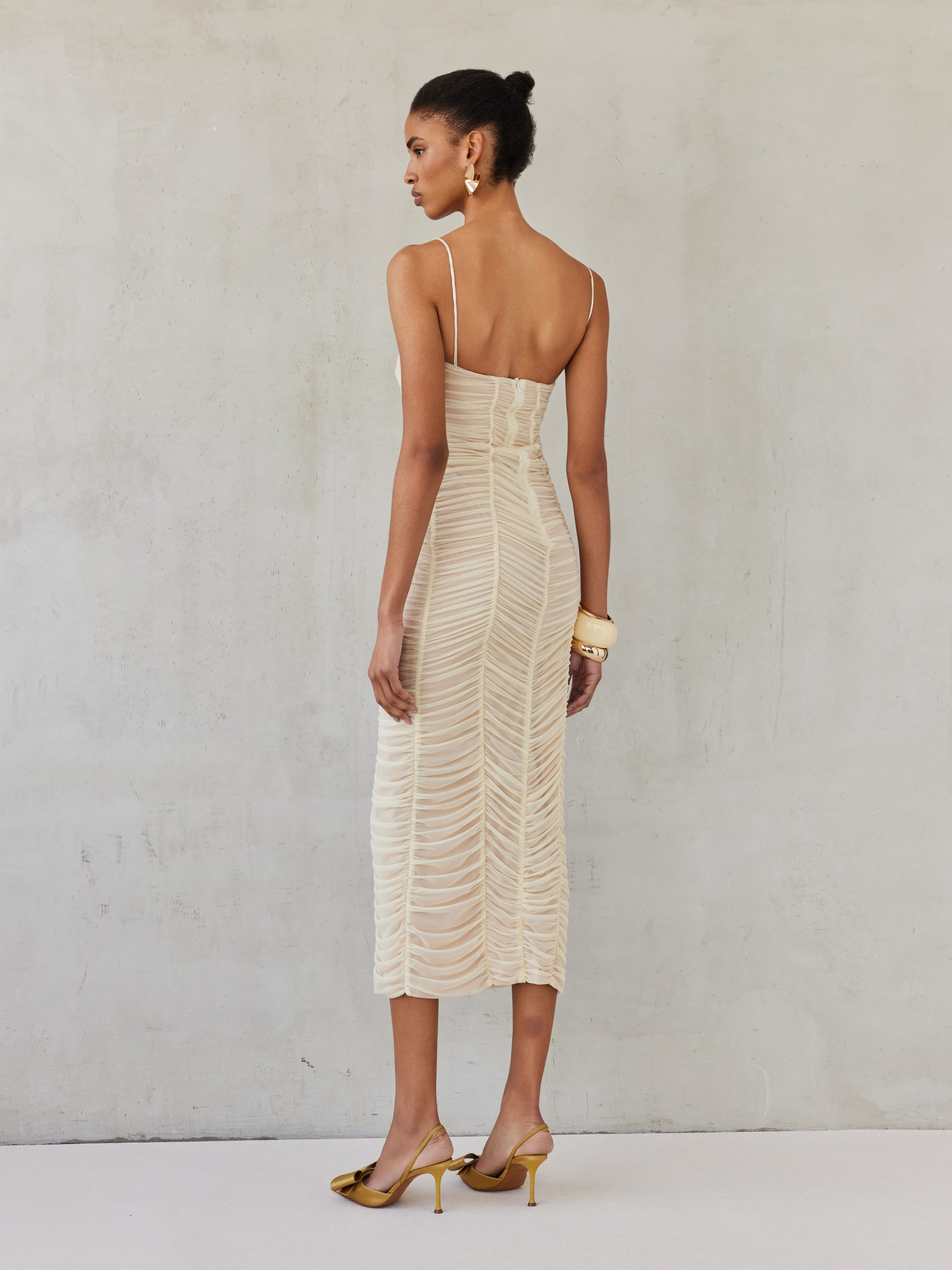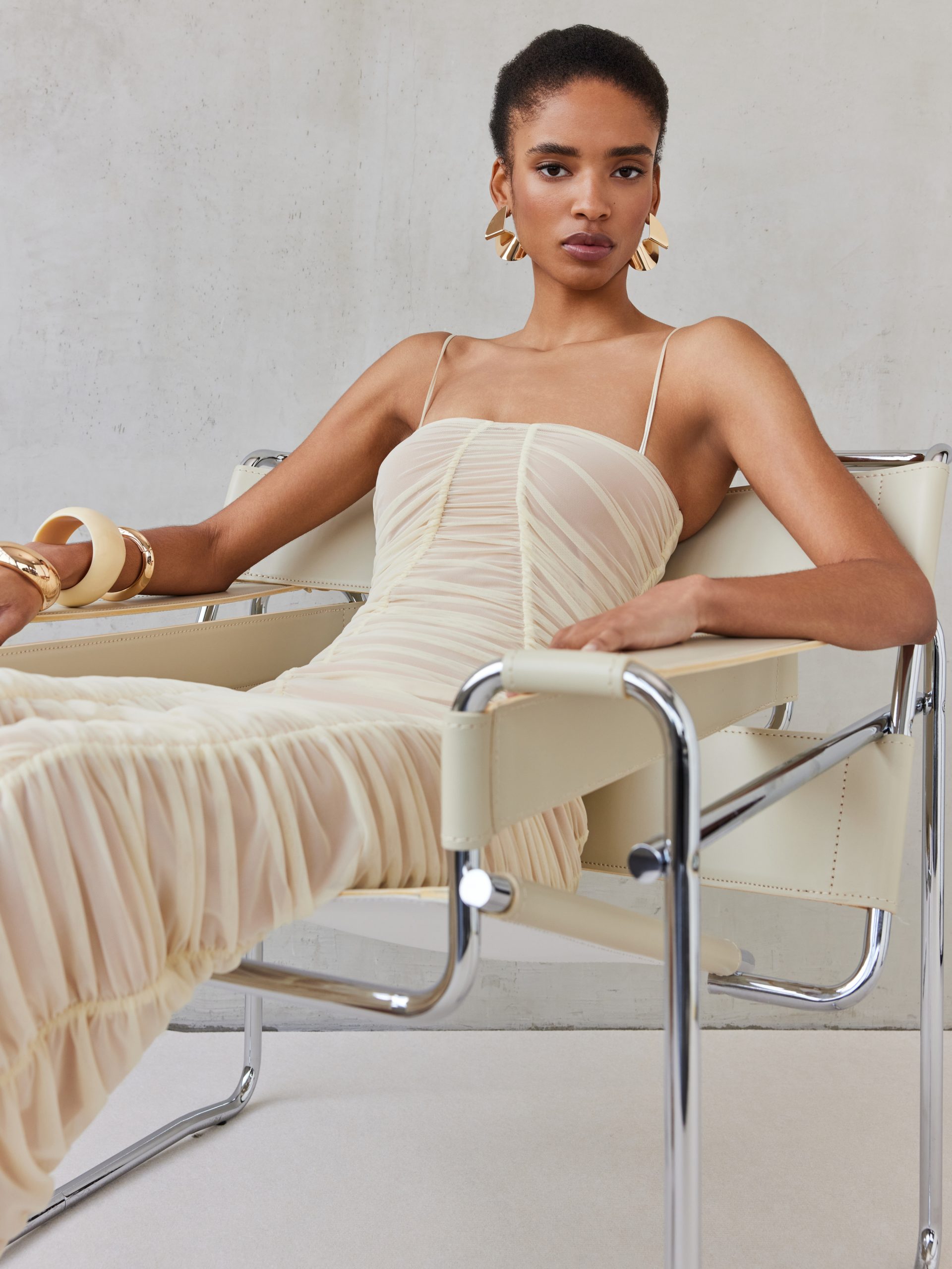 A striking, body-sculpting piece designed from Mix & Match to highlight the silhouette with elegance. The ruched tulle enhances every curve, while the sheer texture and structured bust create a refined yet alluring look—perfect for standout evening occasions.