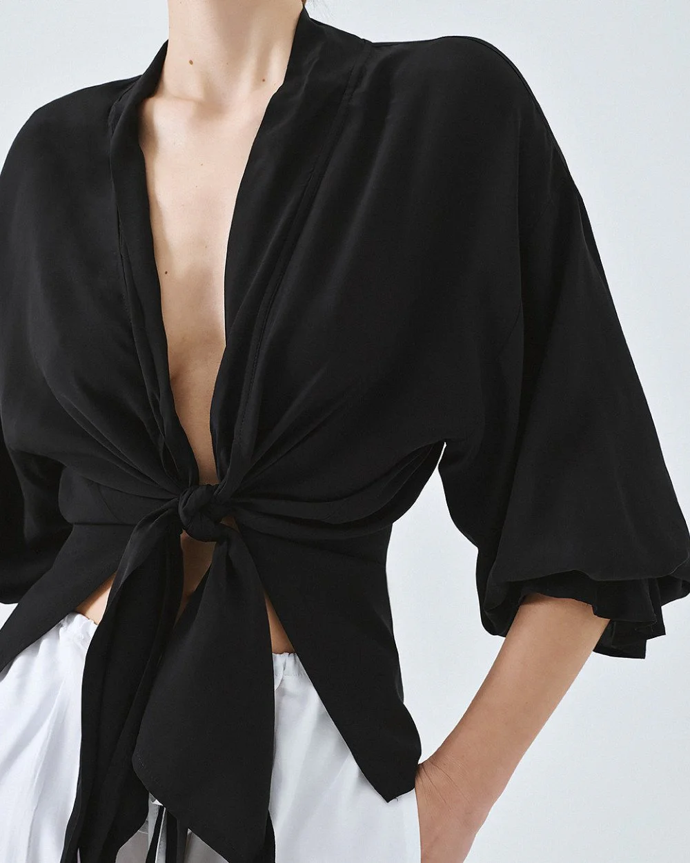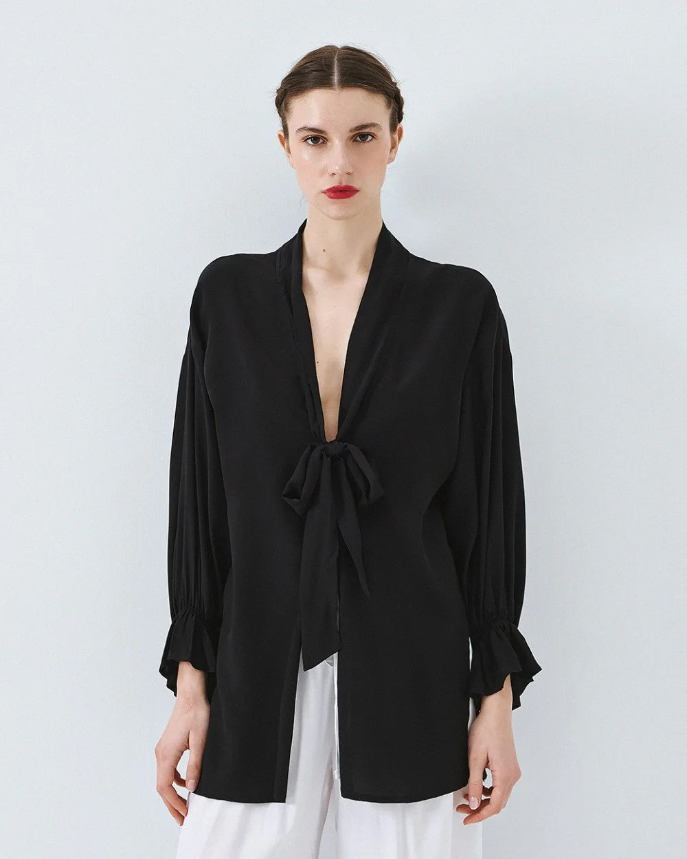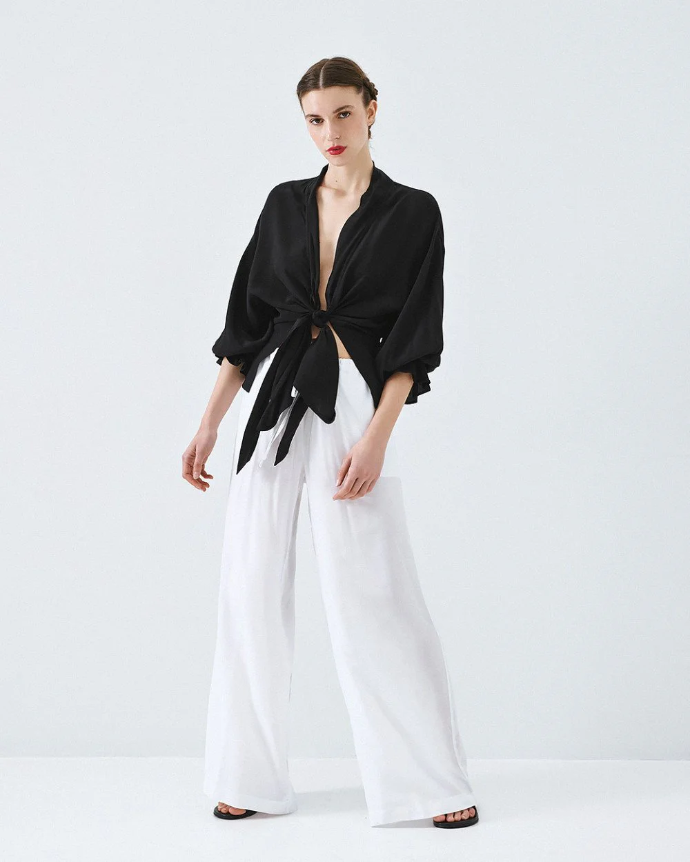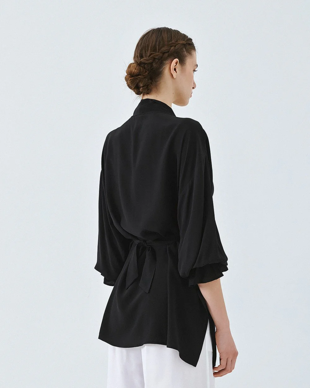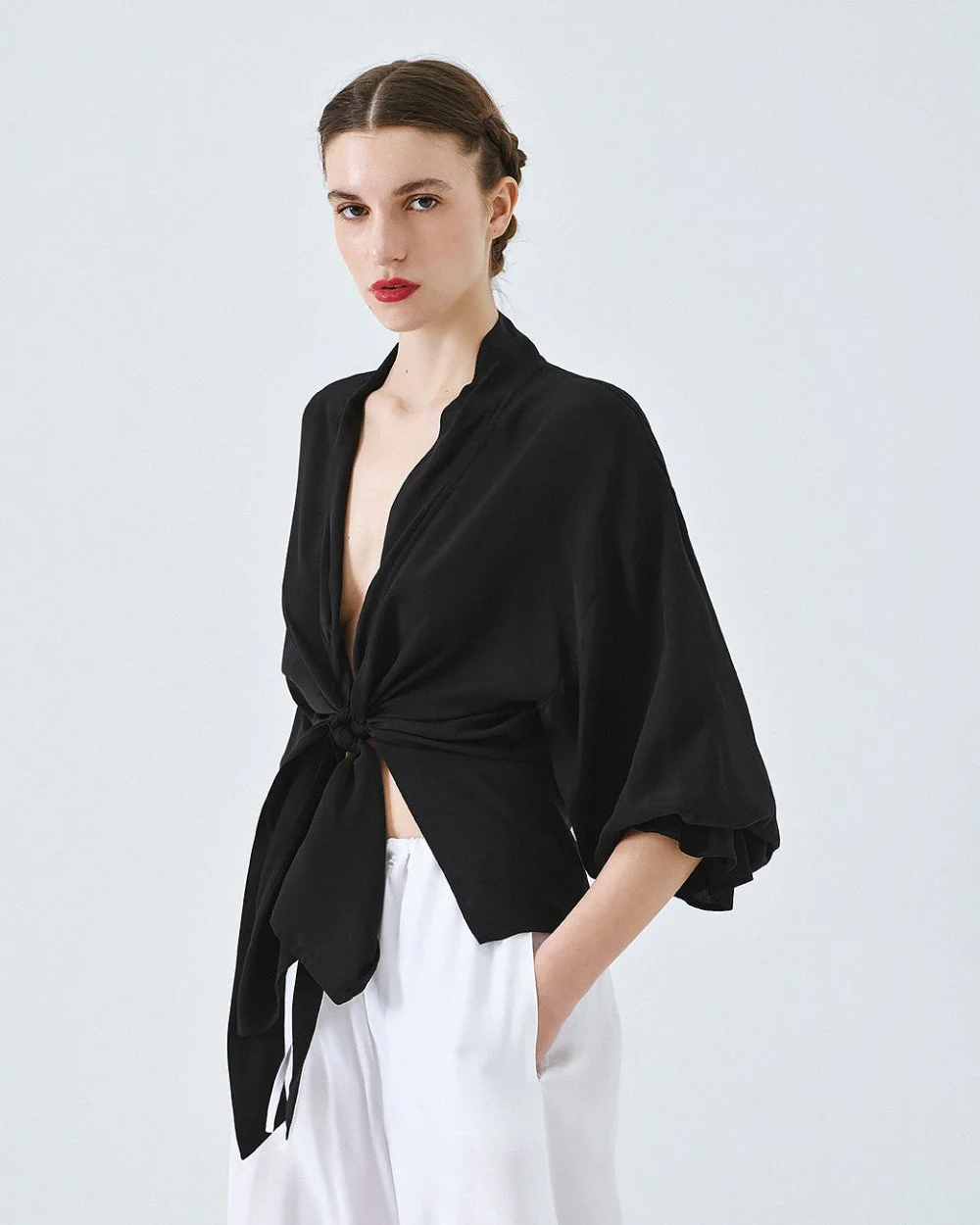 This ruffled sleeve kimono from Access Fashion offers a relaxed yet feminine silhouette, crafted from lightweight rayon. Designed with long puffed sleeves, elasticated ruffled cuffs, and side slits, it features a front tie closure for an effortless, flowy fit that elevates everyday layering.