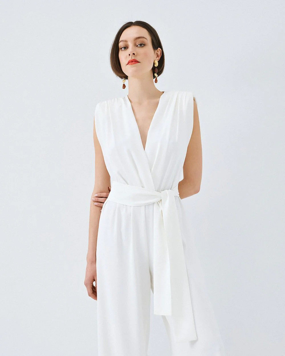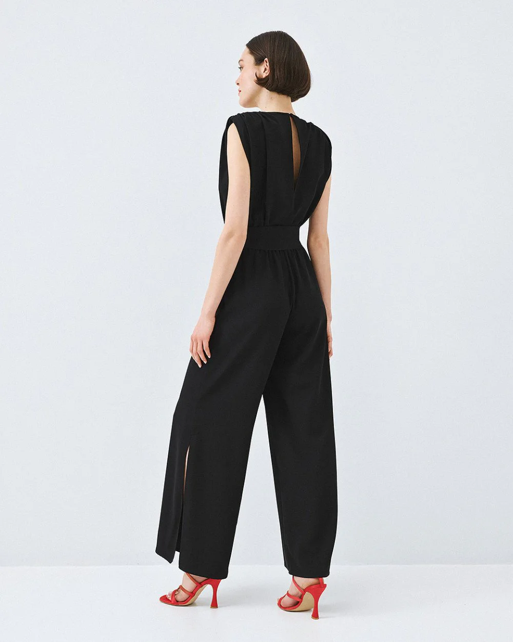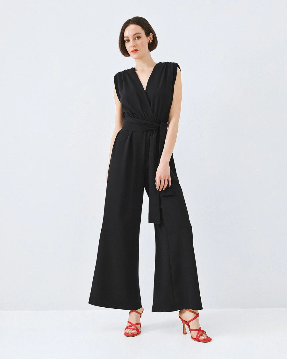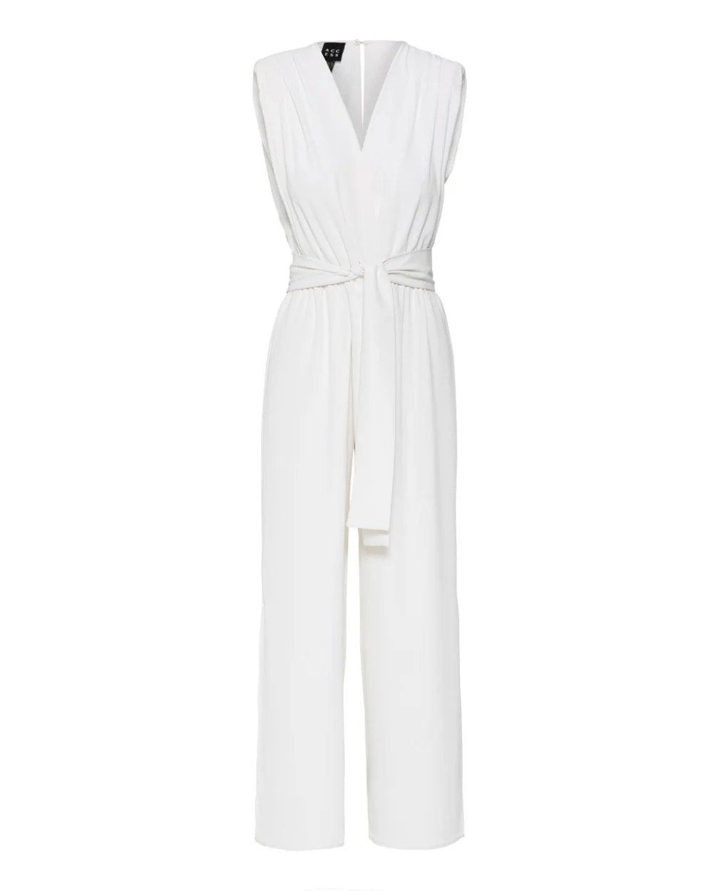 Sleeveless wrap jumpsuit from Access Fashion featuring padded shoulders, gathered details, and an elastic waistband, with a removable tie belt, side slits at the hem, and a back button closure for an effortlessly defined silhouette.