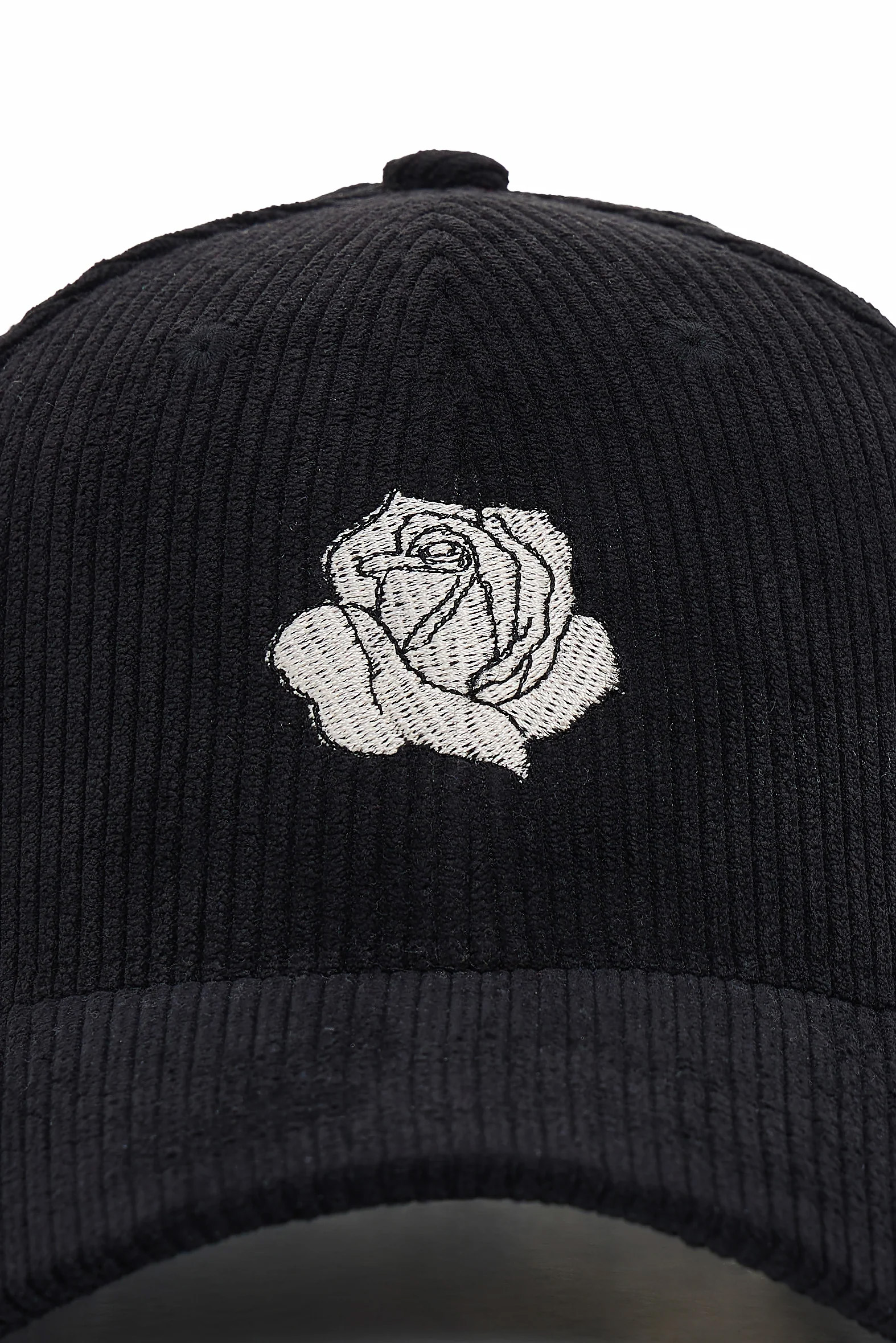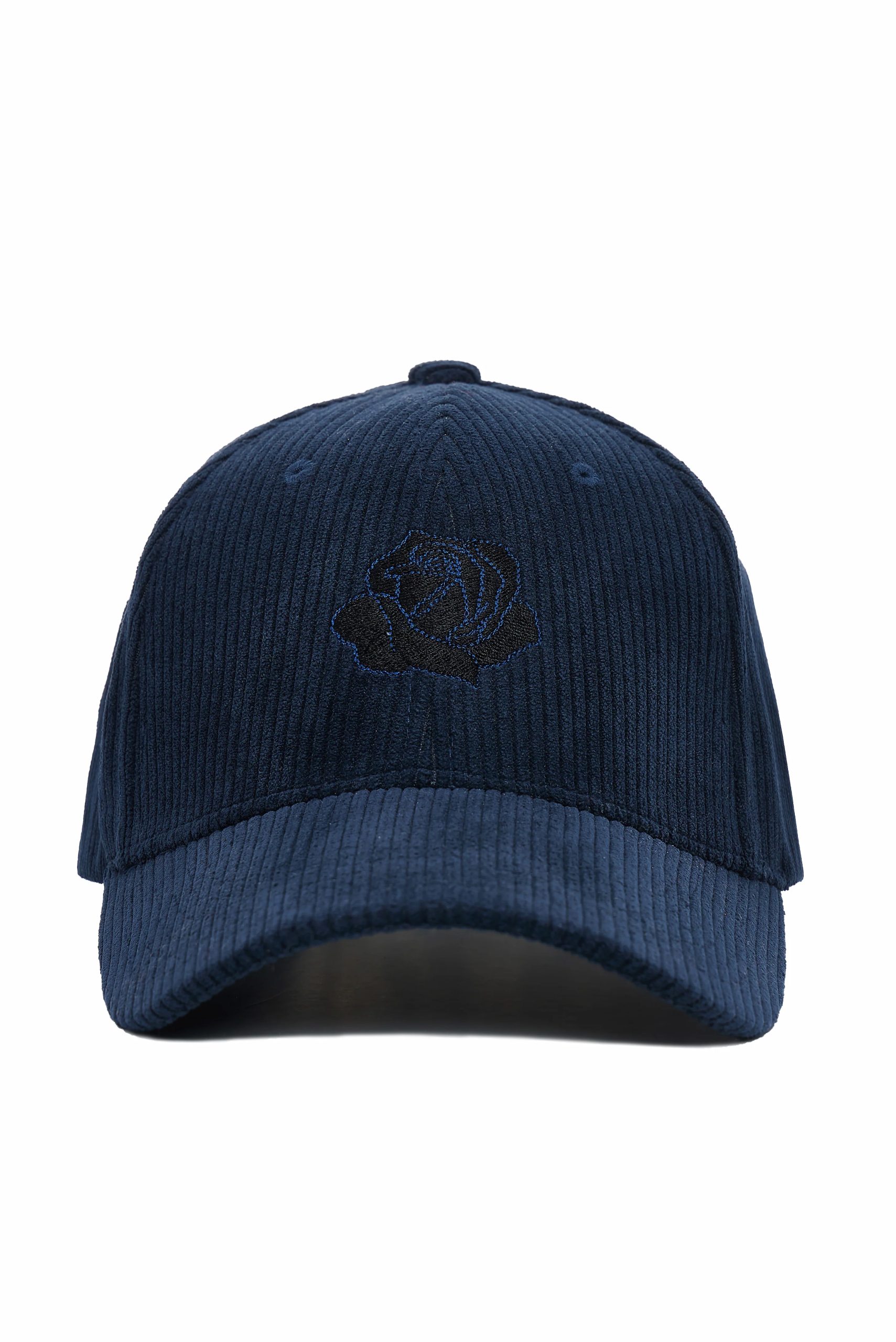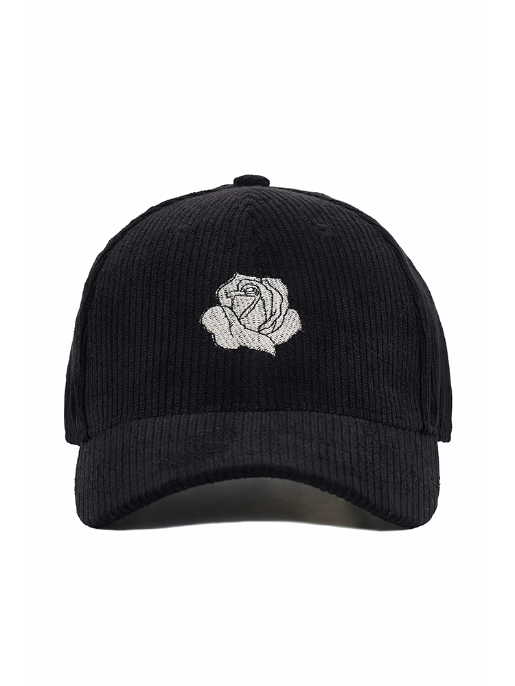 Classic cap, this design is made from soft corduroy fabric for a textured look and feel. Finished with an embroidered rose motif at the front.