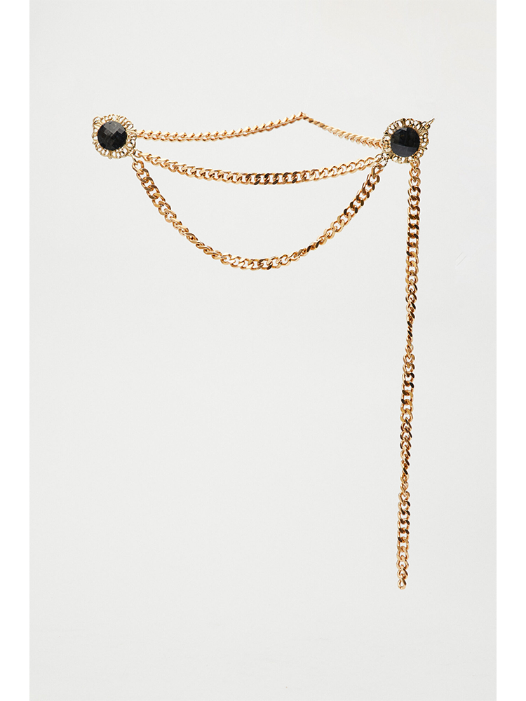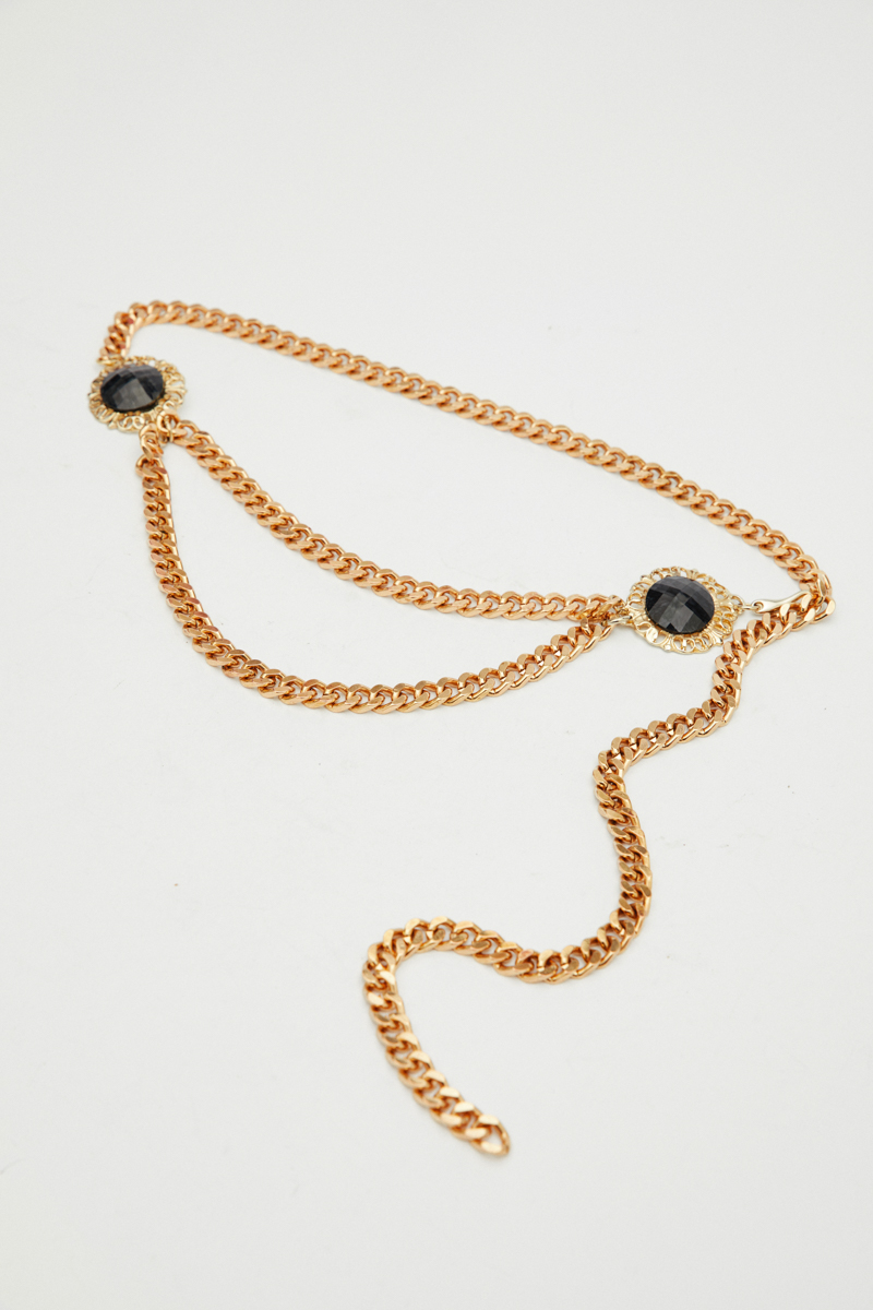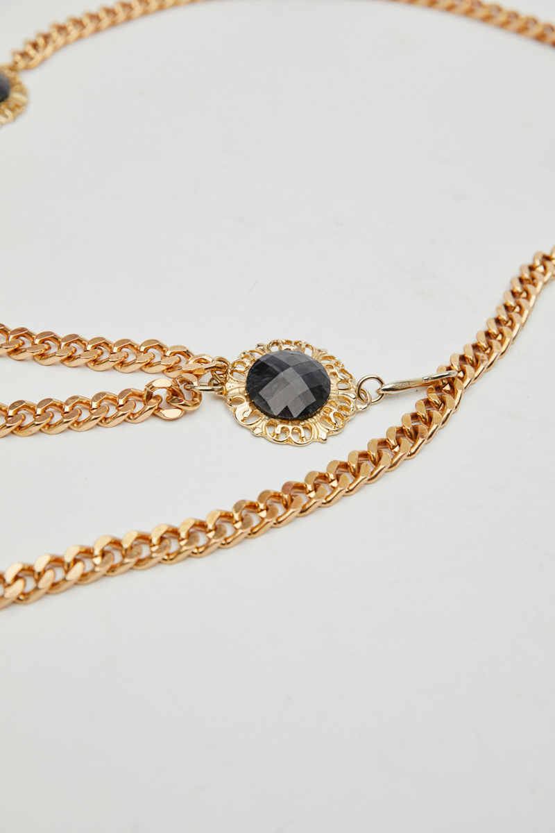 This Lory gold chain belt crafted from high-quality processed aluminum, it features a luxurious gold finish combined with two round side embellishments adorned with black semi-precious stones.