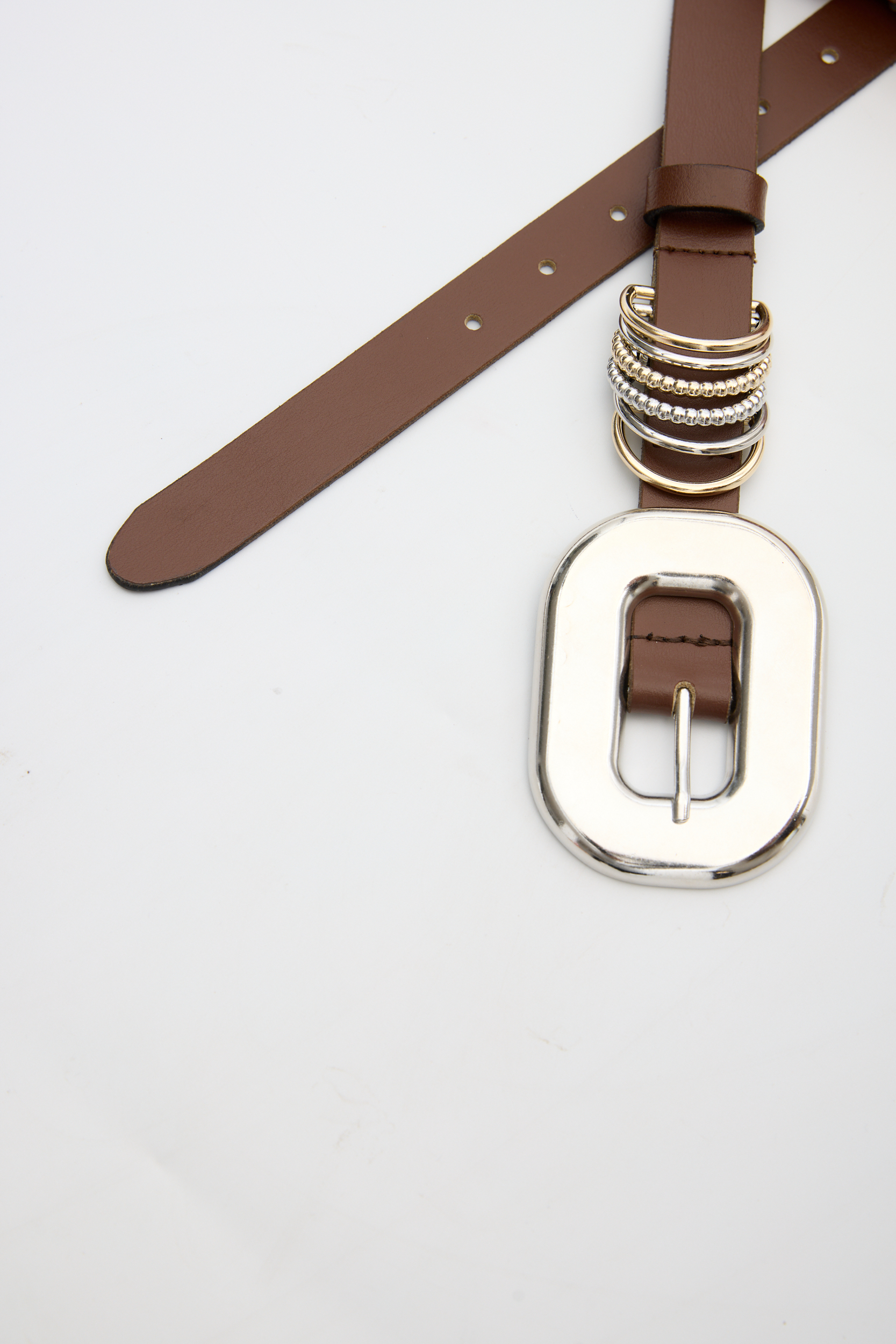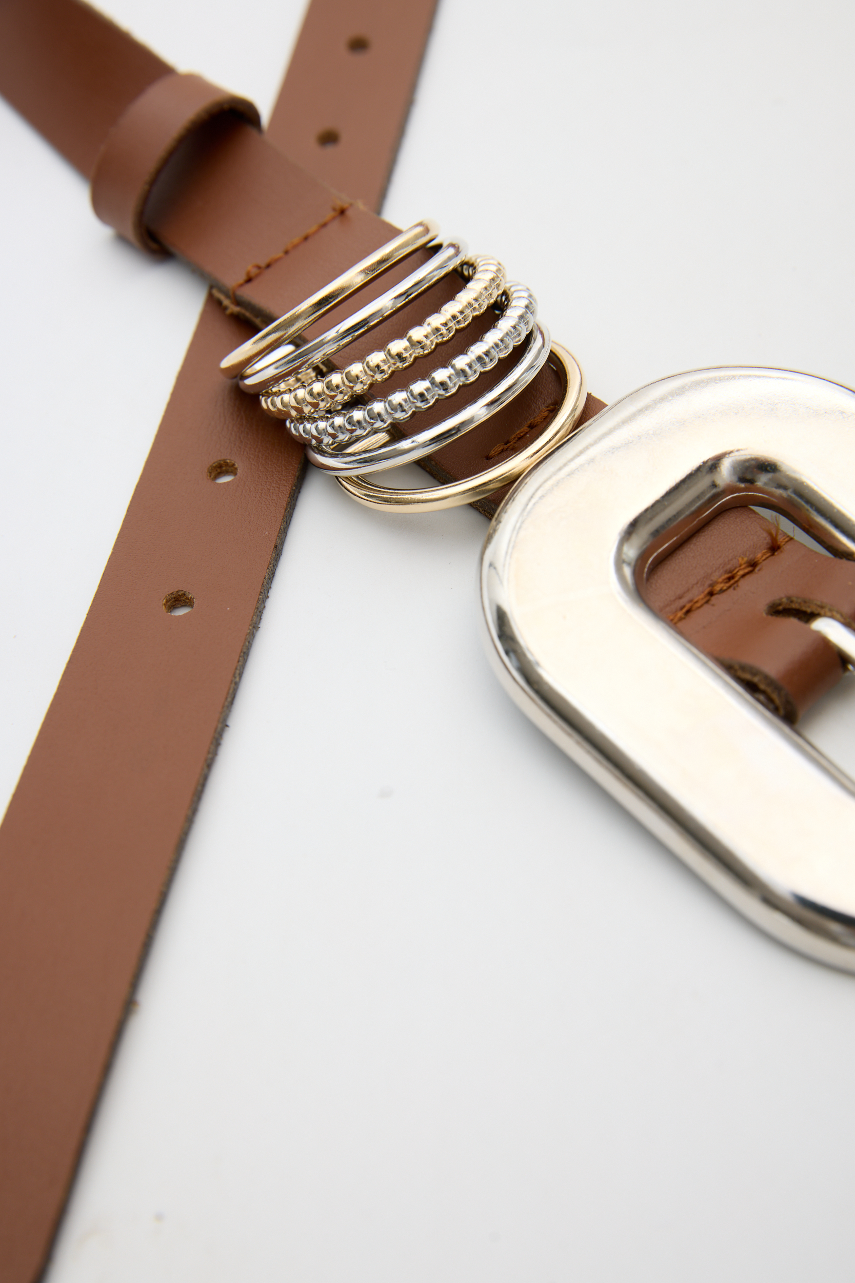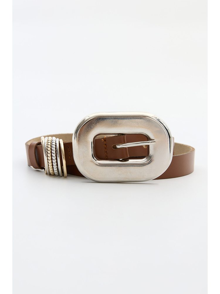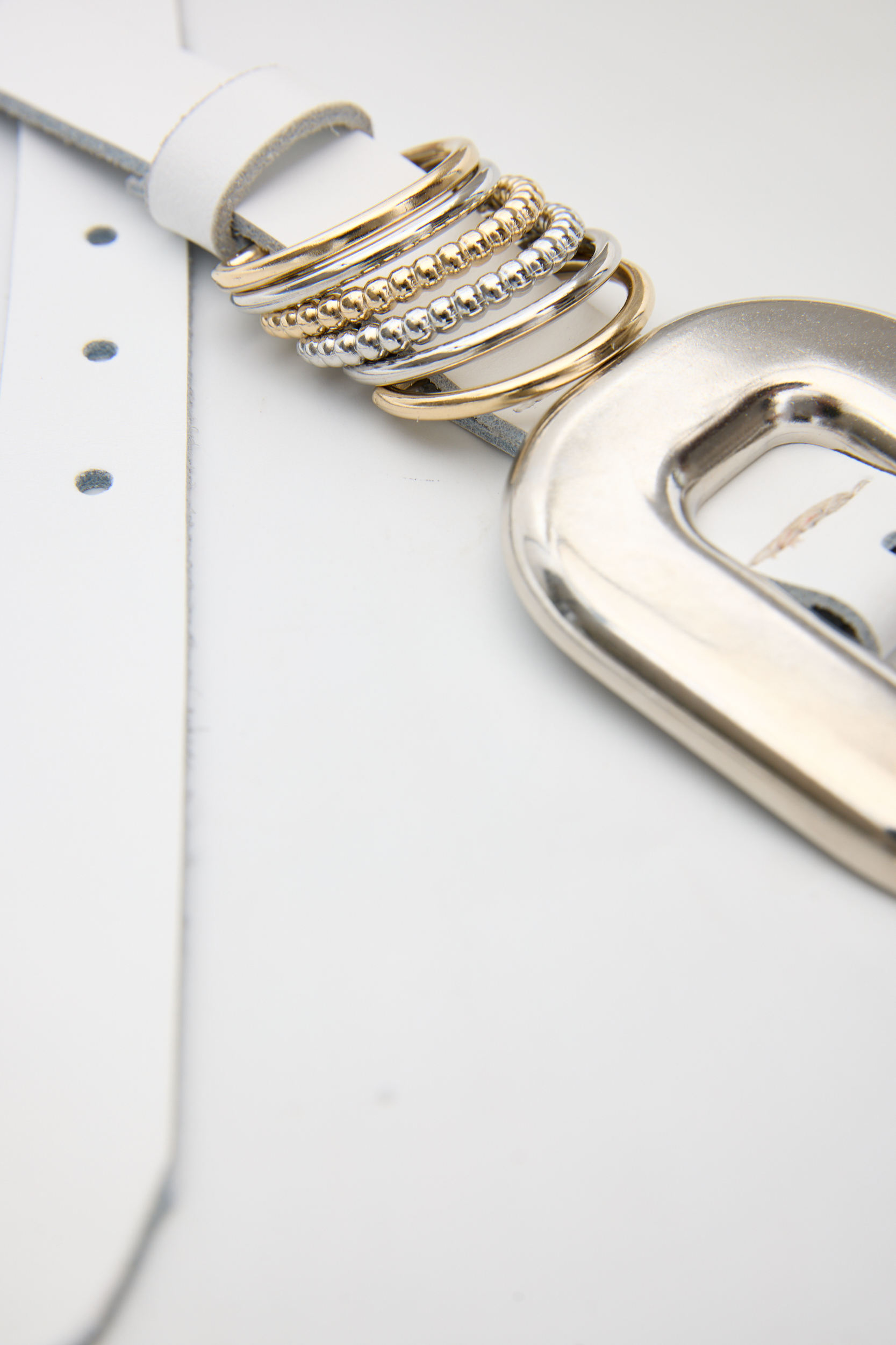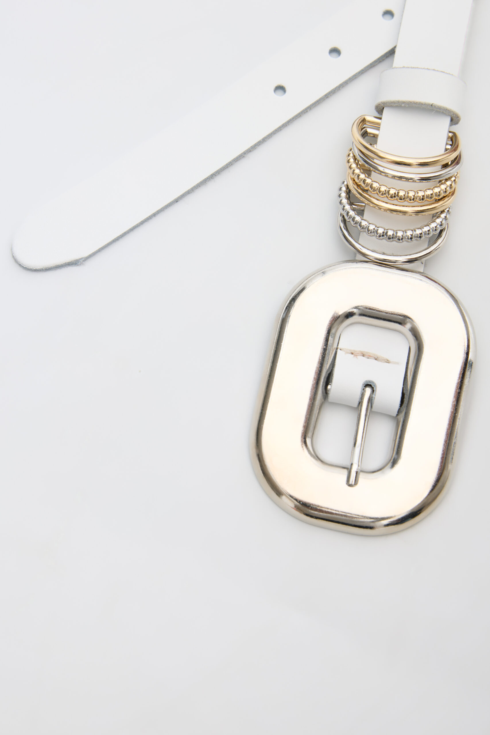 This Oval Treassure leather belt crafted from premium Italian leather. The slim 2.5 cm width makes it perfect for both trousers and high-waist styling, while the oval silver-tone buckle and mixed gold and silver decorative loops create a unique at any outfit.