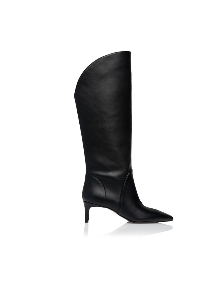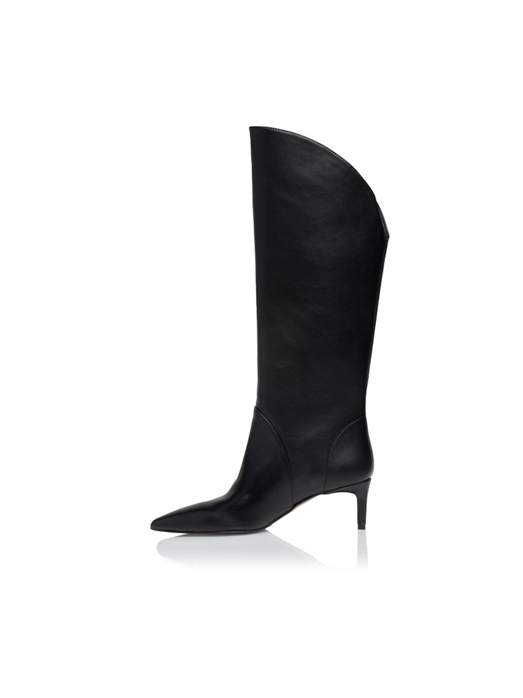 Black leather knee-high boots, feature a sleek silhouette with a pointed toe and a subtle kitten heel that adds just the right amount of height while maintaining comfort. The soft leather finish and asymmetrical top edge bring a refined, fashion-forward touch.