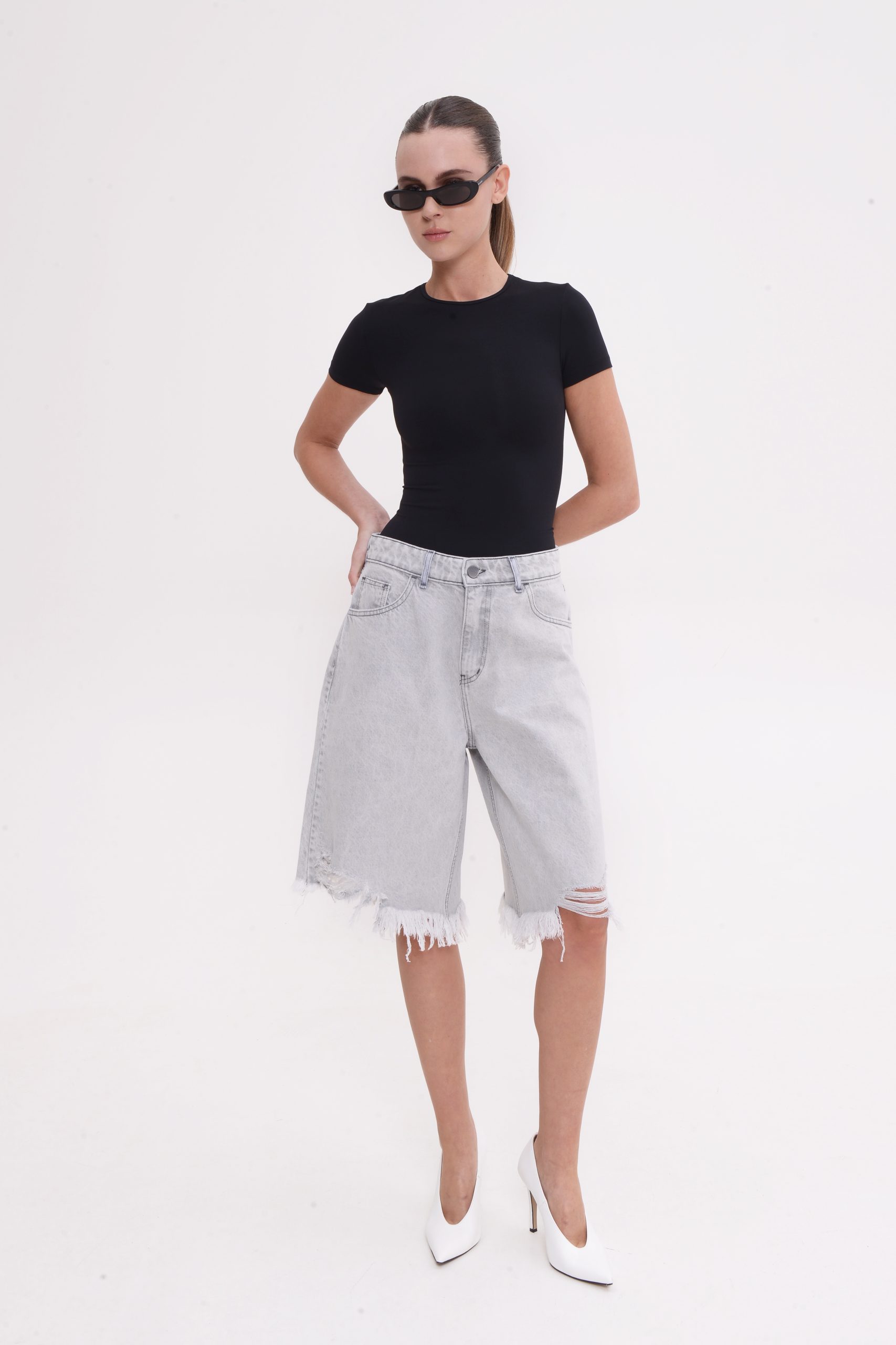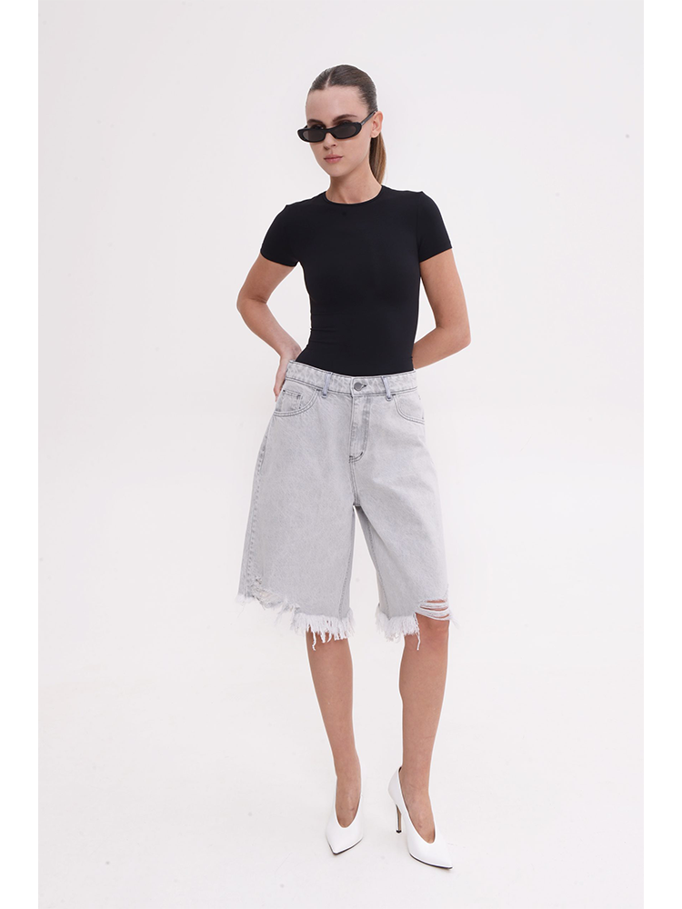 These denim bermuda shorts bring a relaxed silhouette. Designed with a mid-to-high rise fit and a loose, knee-length cut, they offer comfort style. The shorts feature subtle distressed details and a raw, frayed hem.
