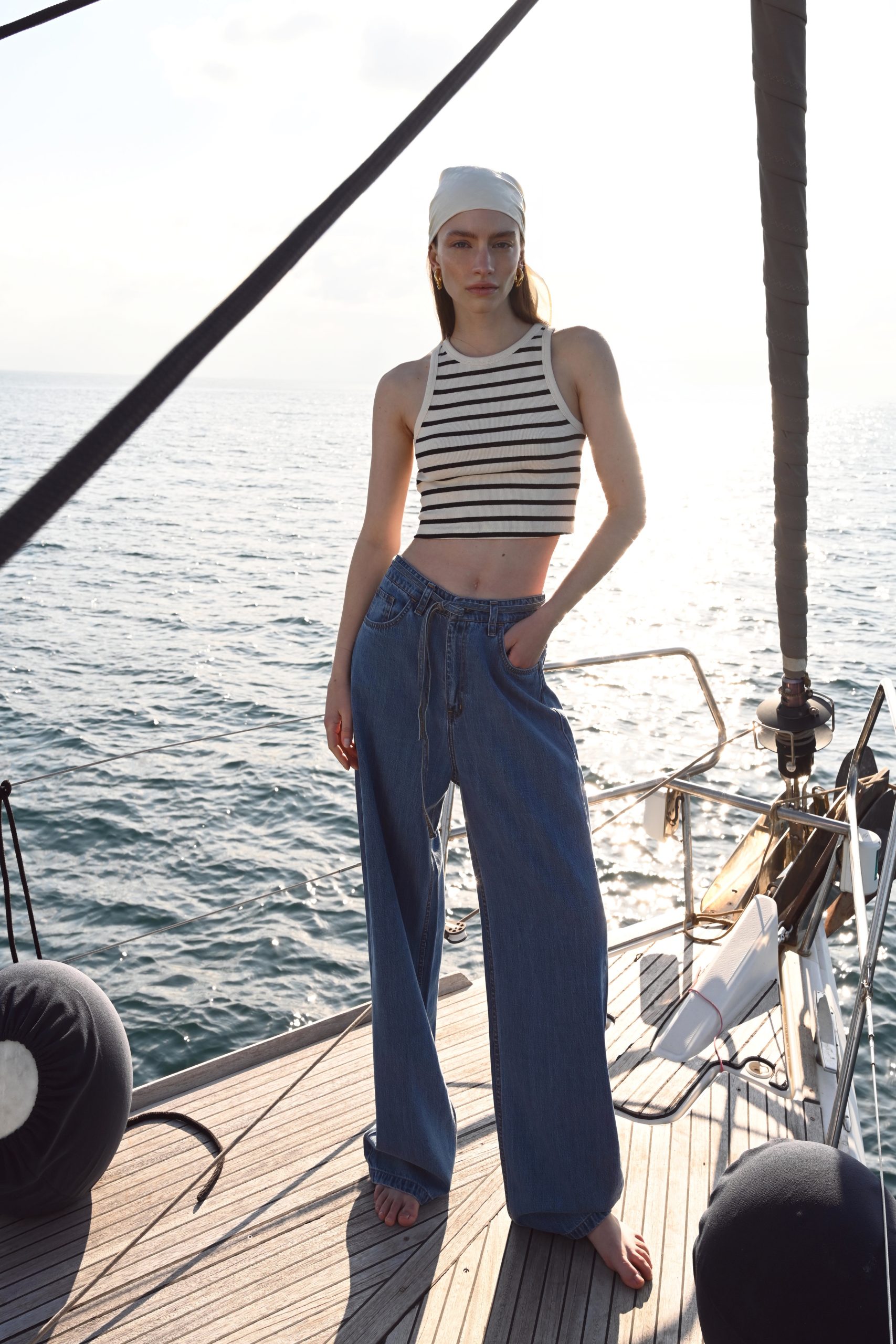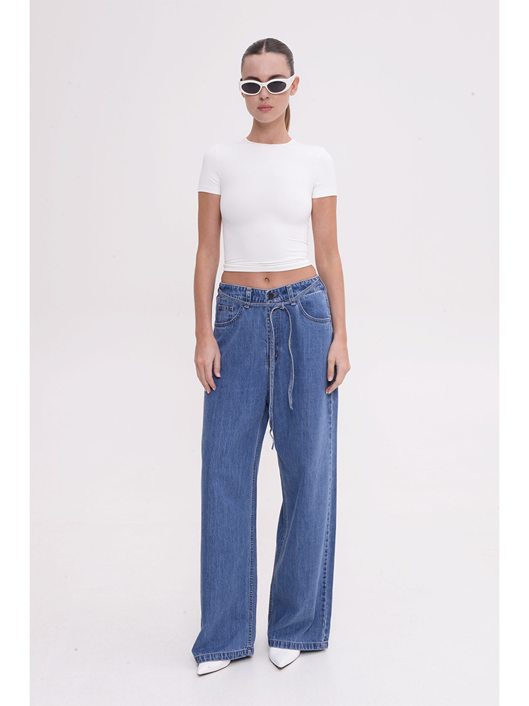 These jeans offer a relaxed look with a mid-to-high rise fit and a straight-to-wide leg silhouette. The standout feature is the adjustable drawstring waistband layered over a classic zip and button closure, giving a laid-back.