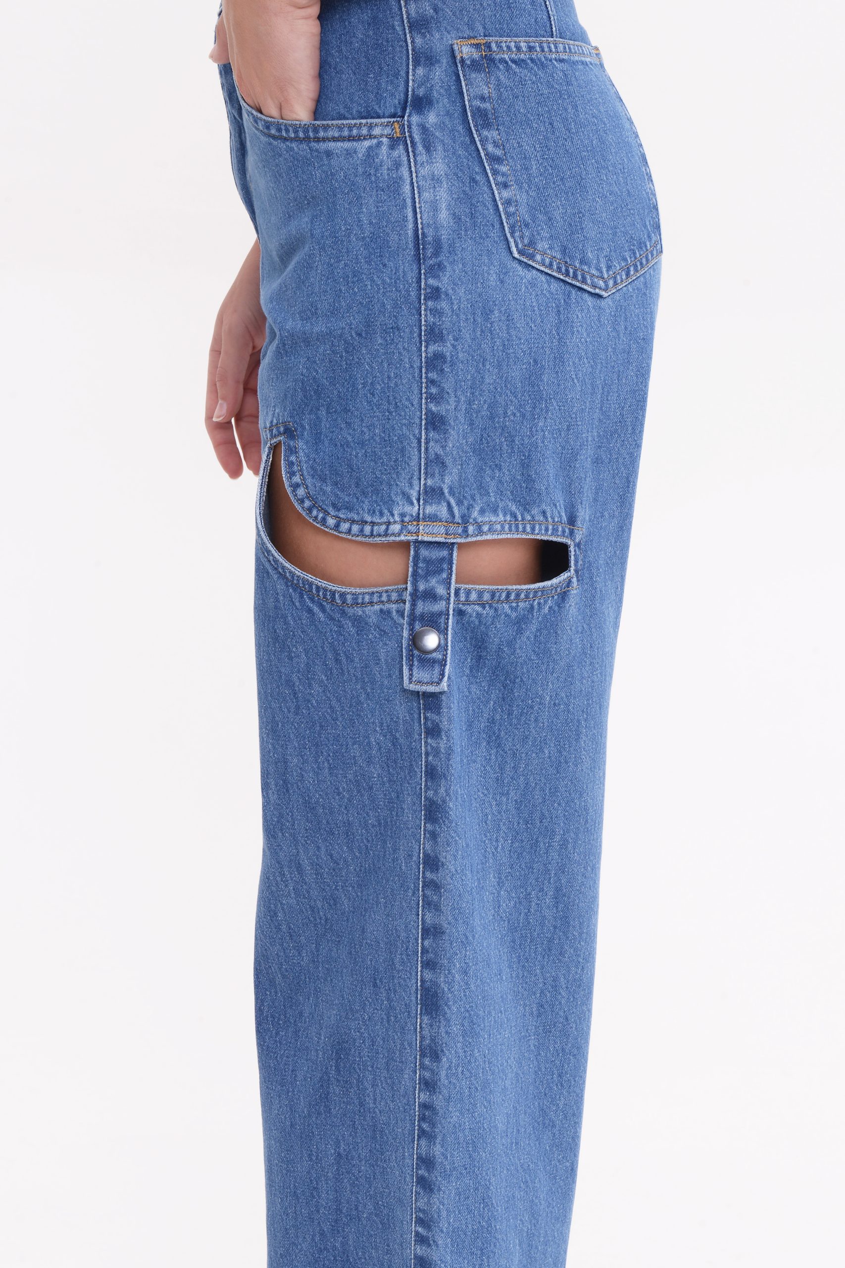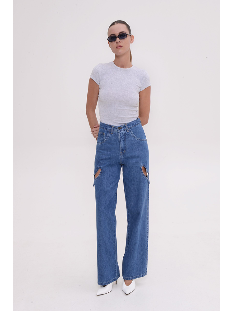 These jeans feature a high-waisted fit and a relaxed wide-leg silhouette. The standout detail is the unique cut-out panels on the thighs, secured with a strap and button accent. Finished with traditional five-pocket styling and a clean hem.