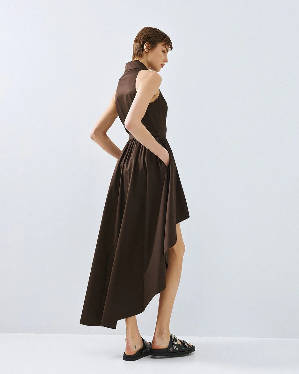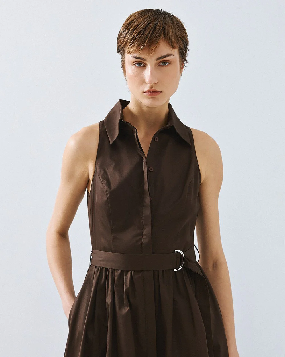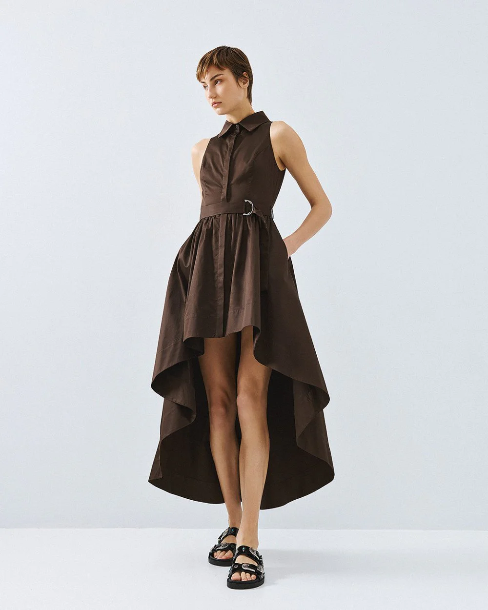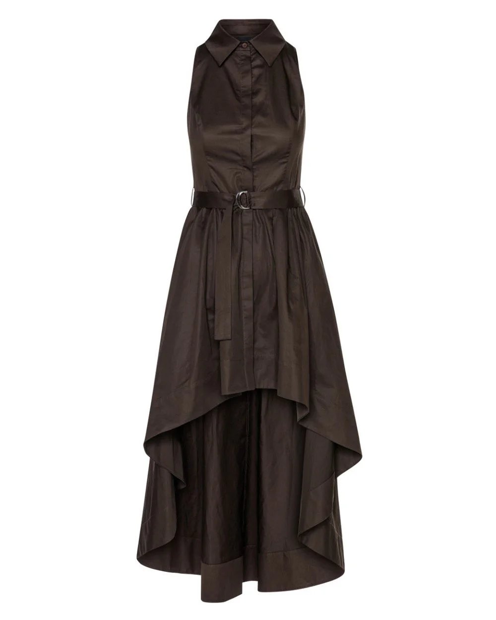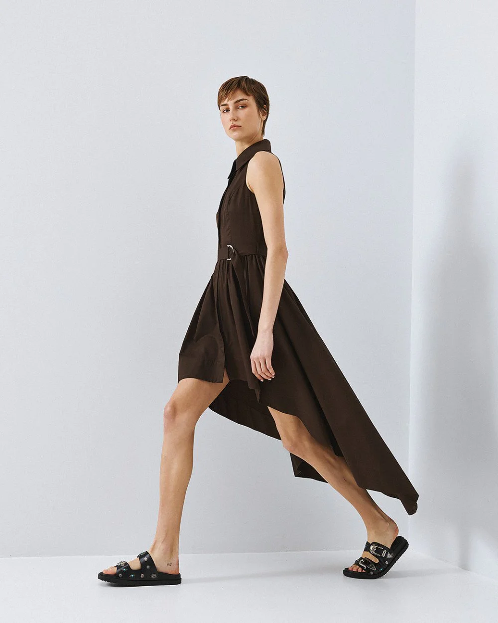 Cotton sleeveless shirt dress with an asymmetric length and a collar. Features a front closure with internal buttons, belt loops and a removable tie belt with a metallic buckle.
