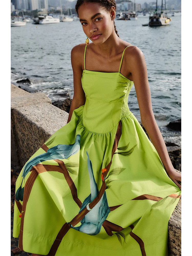 Embrace effortless joy with the Green Birds Smocked Maxi Dress from FARM Rio. Featuring a whimsical bird print in vibrant green hues, this dress captivates with its playful smocked bodice that gently hugs the silhouette. The square neckline adds a touch of vintage charm, while the flowing skirt sways gracefully, inviting movement and ease. Perfect for sunny days, it blends softness and spirited elegance in every stitch.