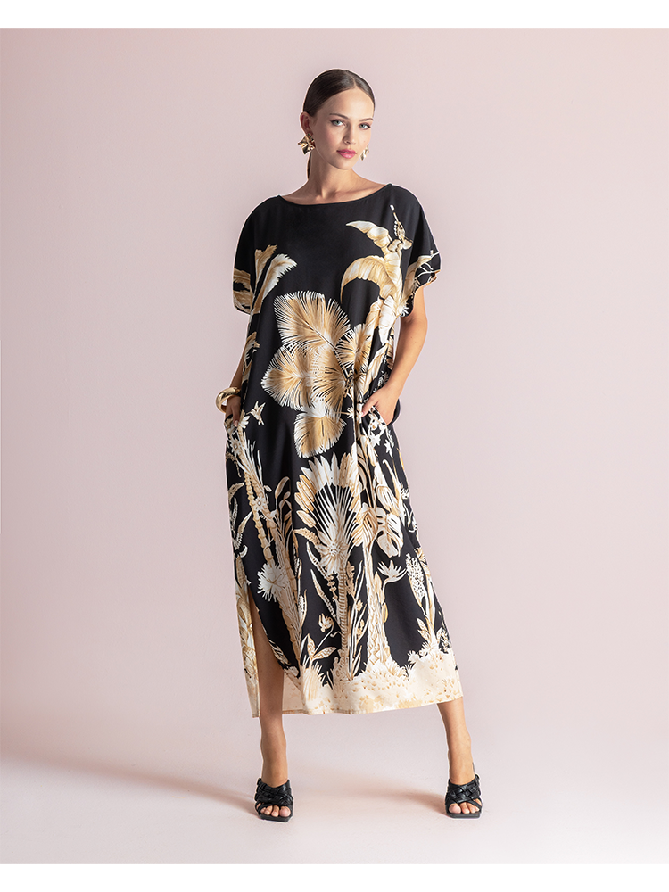 Flowing kaftan midi dress, designed in a rich black tone with soft beige botanical motifs. With relaxed silhouette, short wide sleeves and side pockets.