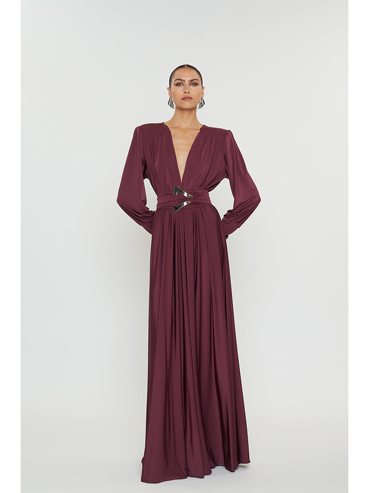 – Wide cinched waistband with a striking triangular metallic accent