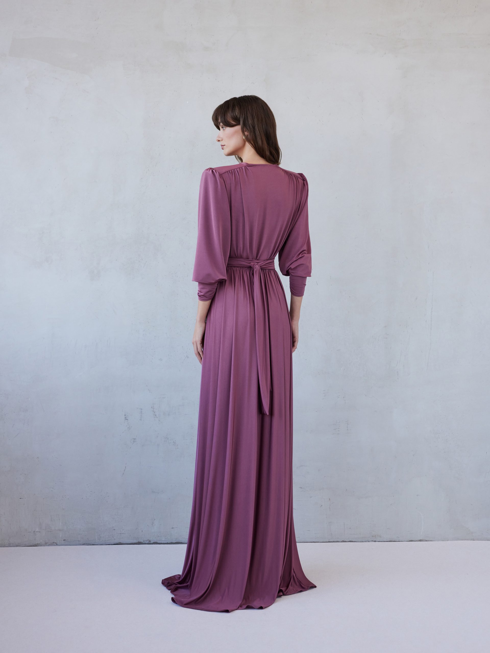 This elegant maxi dress is designed with a fluid, graceful drape. The deep v-neckline, while the softly structured shoulders and voluminous sleeves create a modern look. A wrap-style waist with a decorative metallic buckle defines the figure, and the flowing skirt falls beautifully to the floor, making it an ideal choice for formal occasions or evening events.