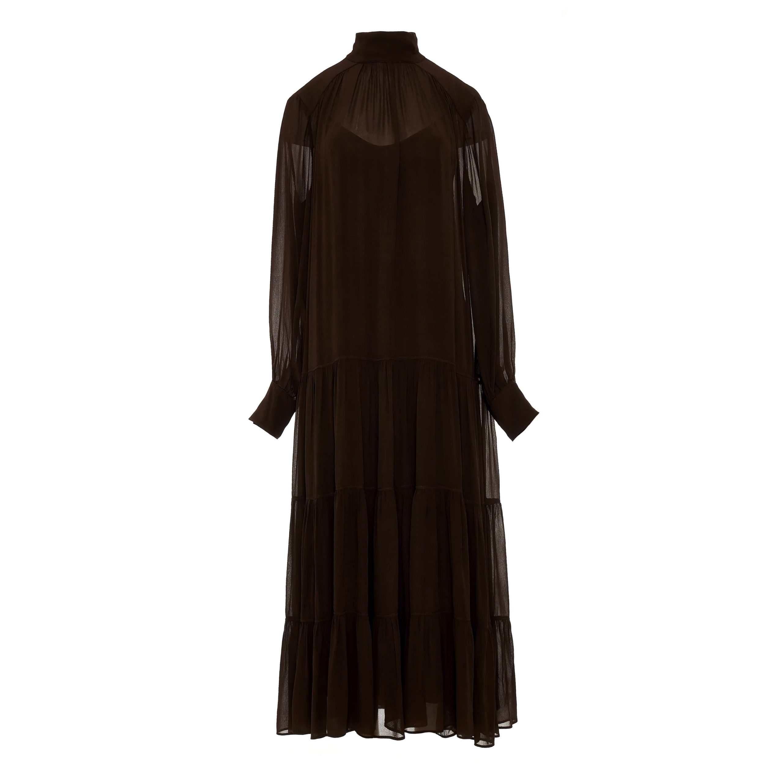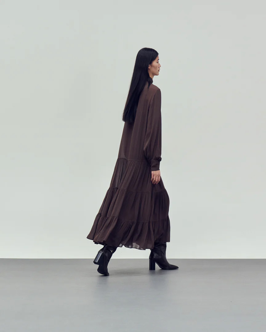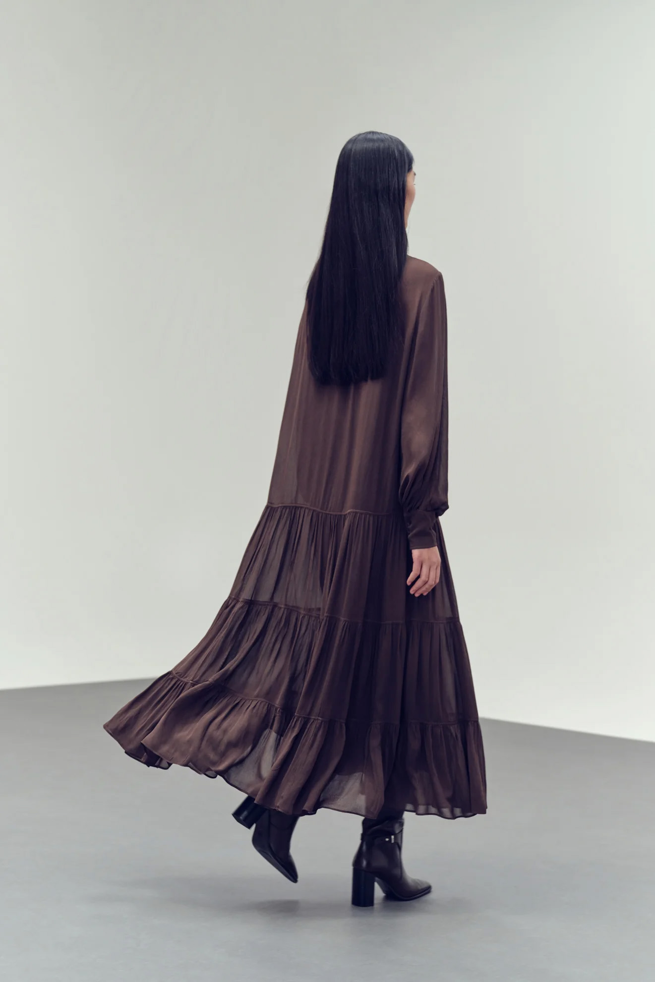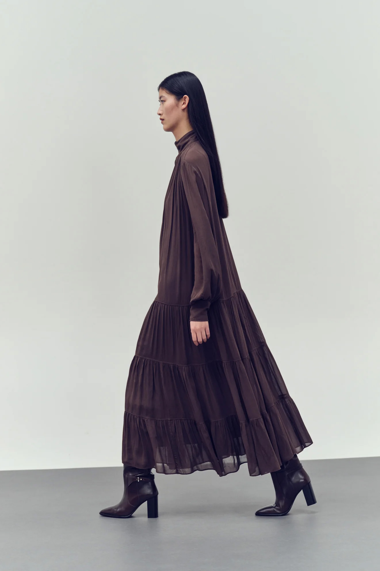 This long brown dress with its flowing silhouette and refined details, designed with a soft turtleneck and long sleeves. The tiered ruffle panels create graceful movement, adding depth and femininity to the relaxed cut. Crafted from a lightweight, fluid fabric, this piece transitions seamlessly from day to evening.