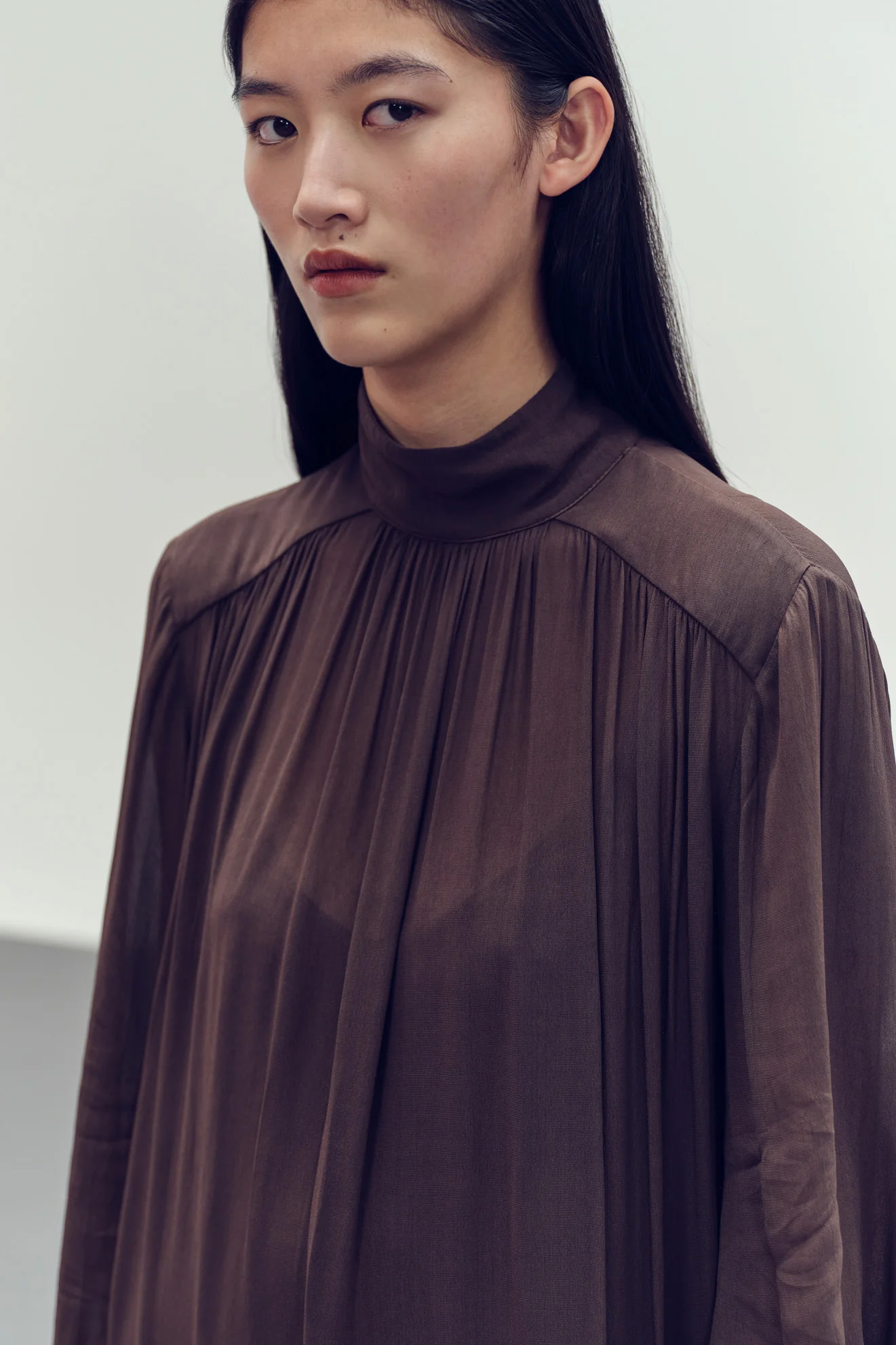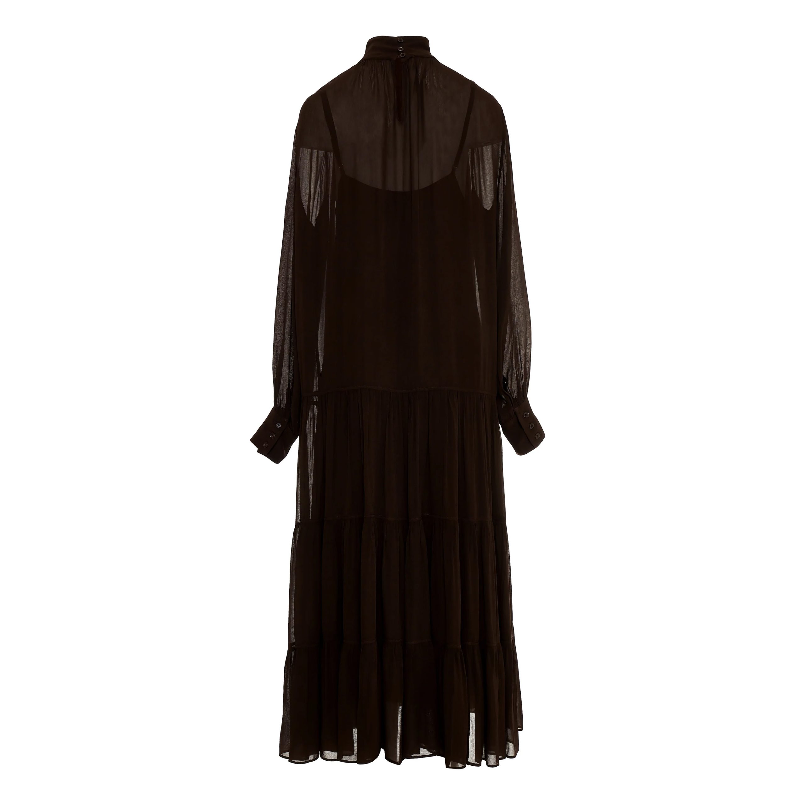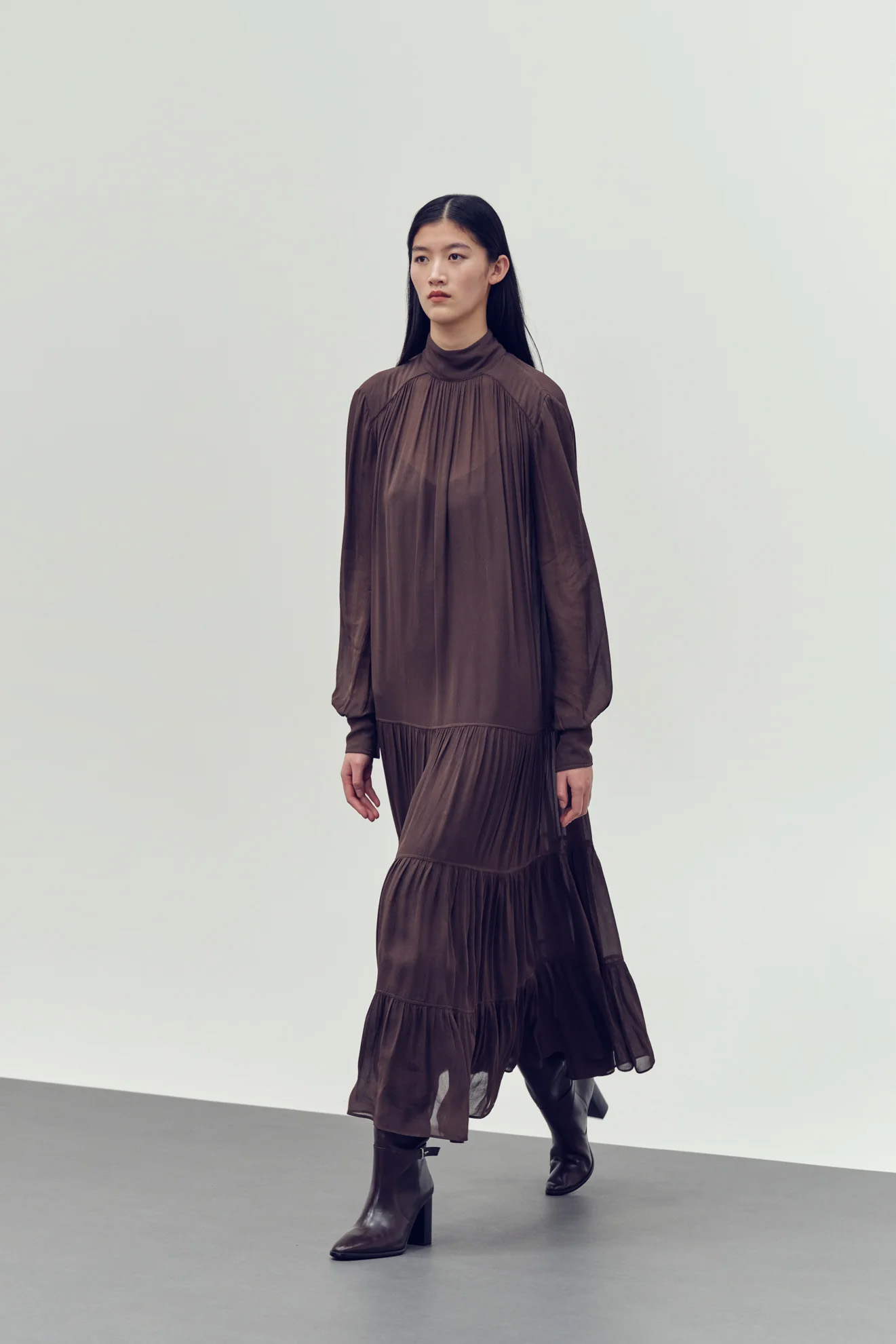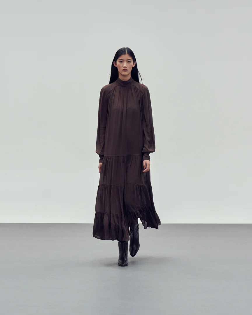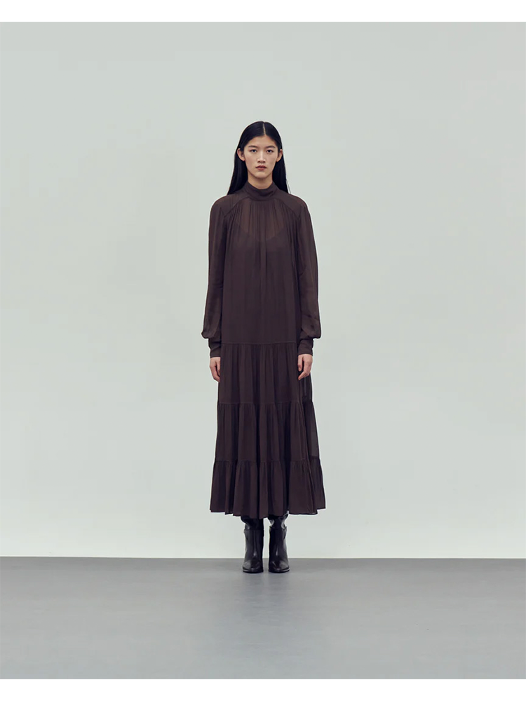 This long brown dress with its flowing silhouette and refined details, designed with a soft turtleneck and long sleeves. The tiered ruffle panels create graceful movement, adding depth and femininity to the relaxed cut. Crafted from a lightweight, fluid fabric, this piece transitions seamlessly from day to evening.