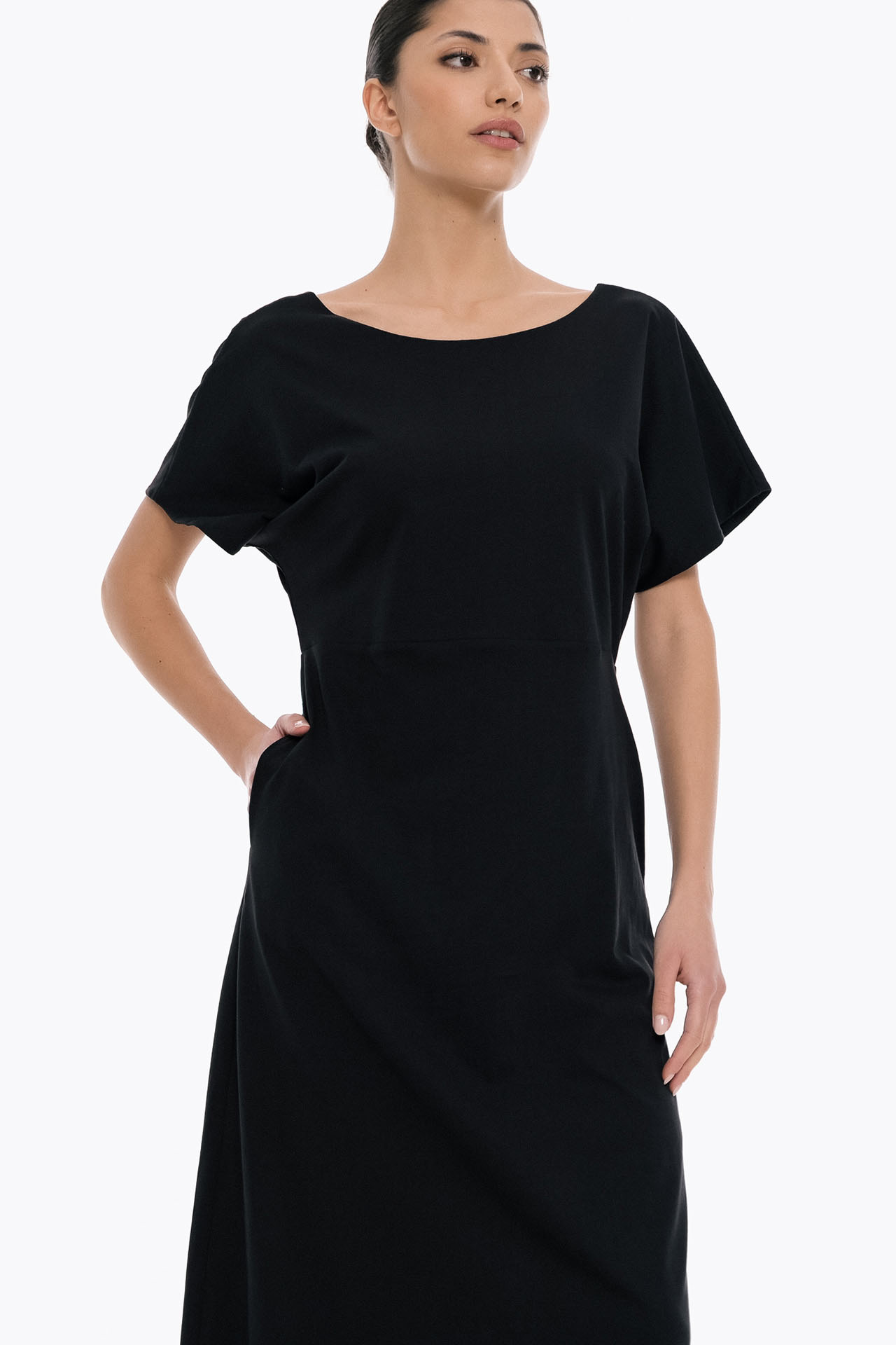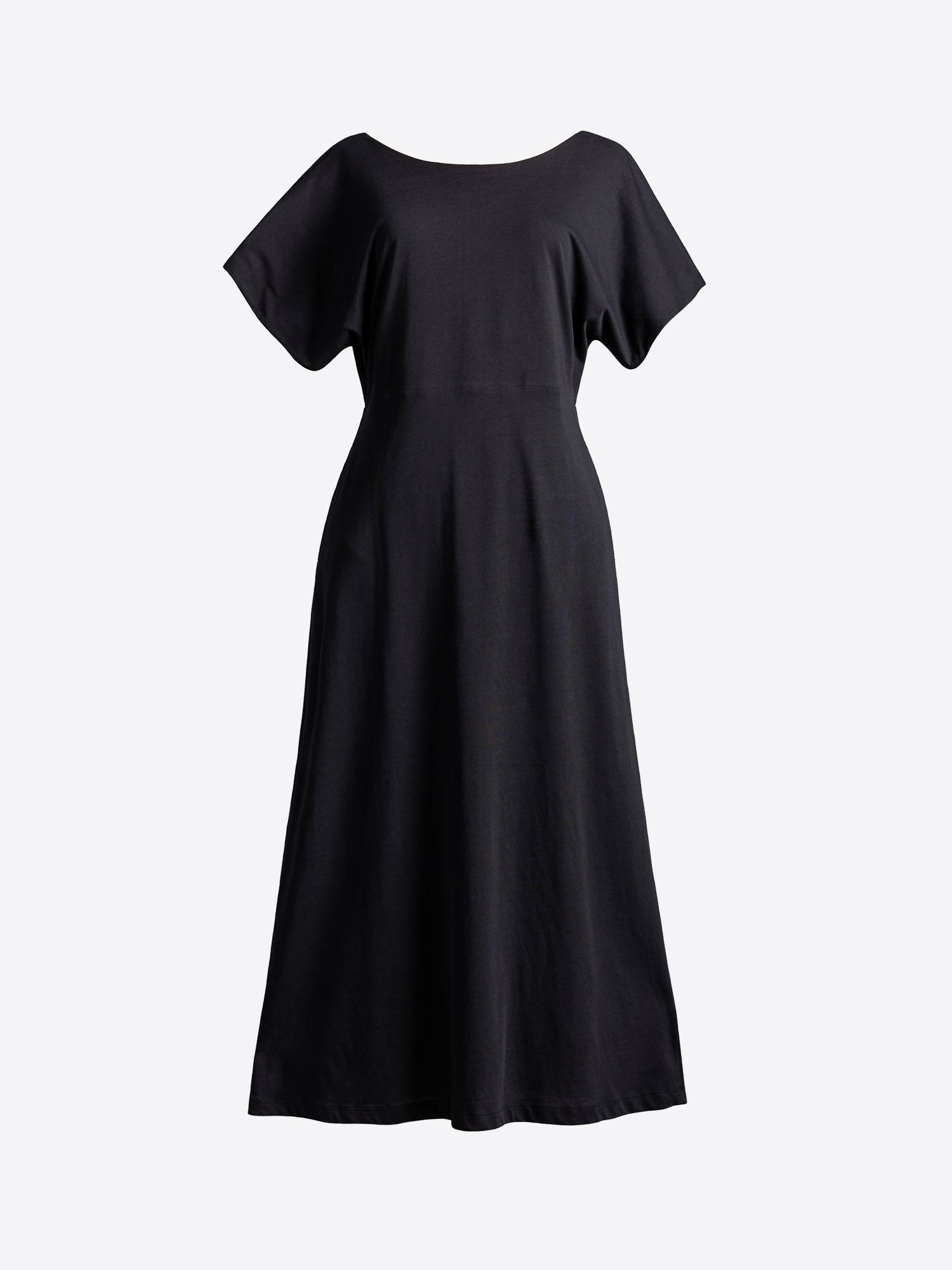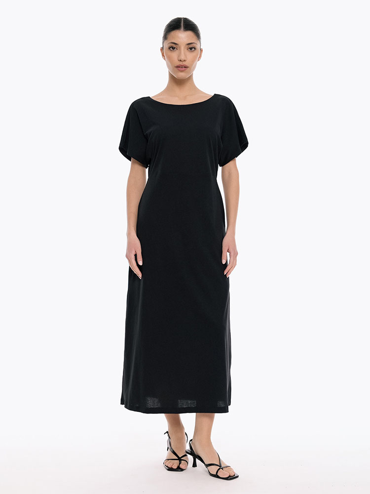 A refined yet effortless dress that balances elegance with ease from 4Tailors. The clean boat neckline contrasts beautifully with the open back detail, while the soft jersey fabric and A-line silhouette offer comfort and fluid movement—perfect for all-day wear with a modern edge.