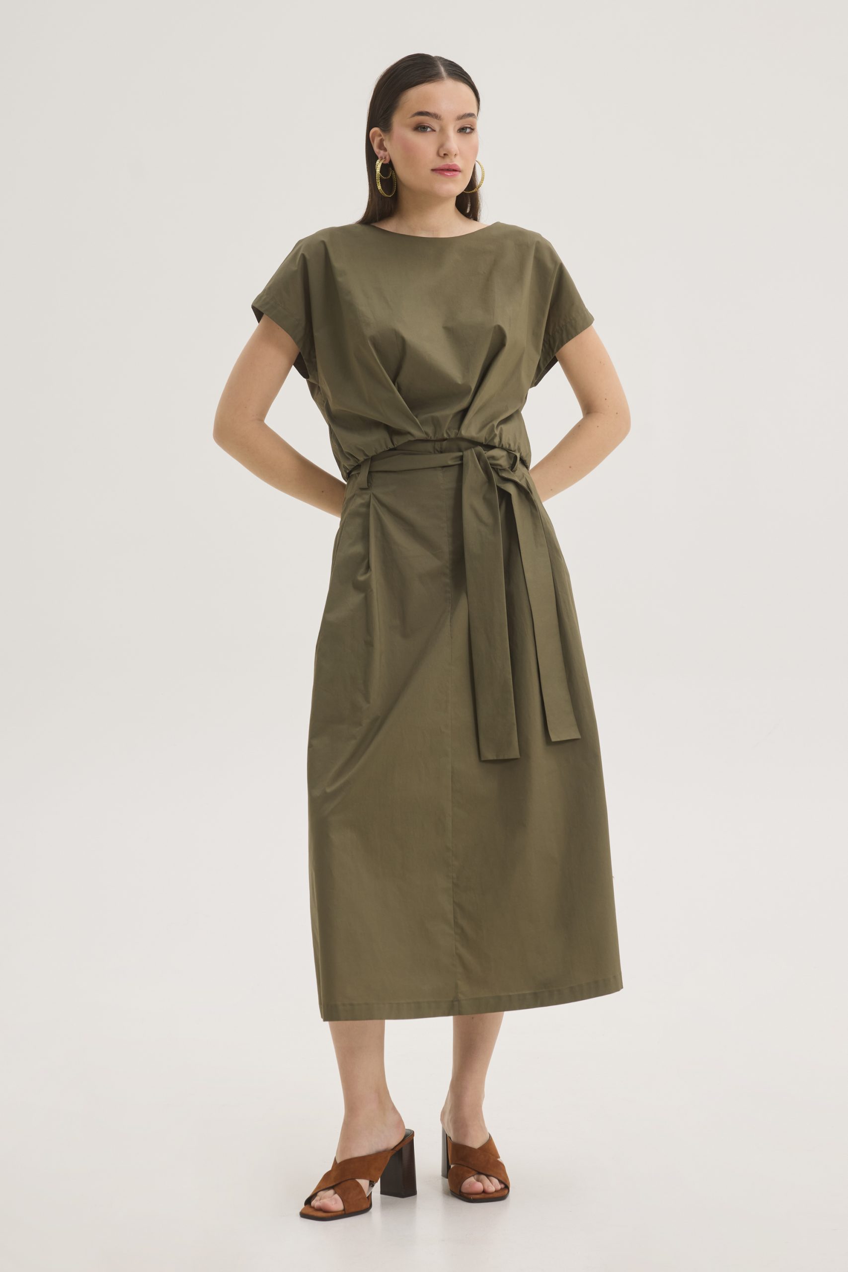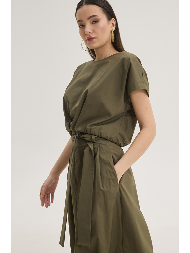 Cotton blouse crafted from smooth, breathable cotton features a relaxed silhouette. The round neckline and clean short sleeves create a minimalist aesthetic, while the adjustable waist tie defines the figure and adds soft draping detail at the front.