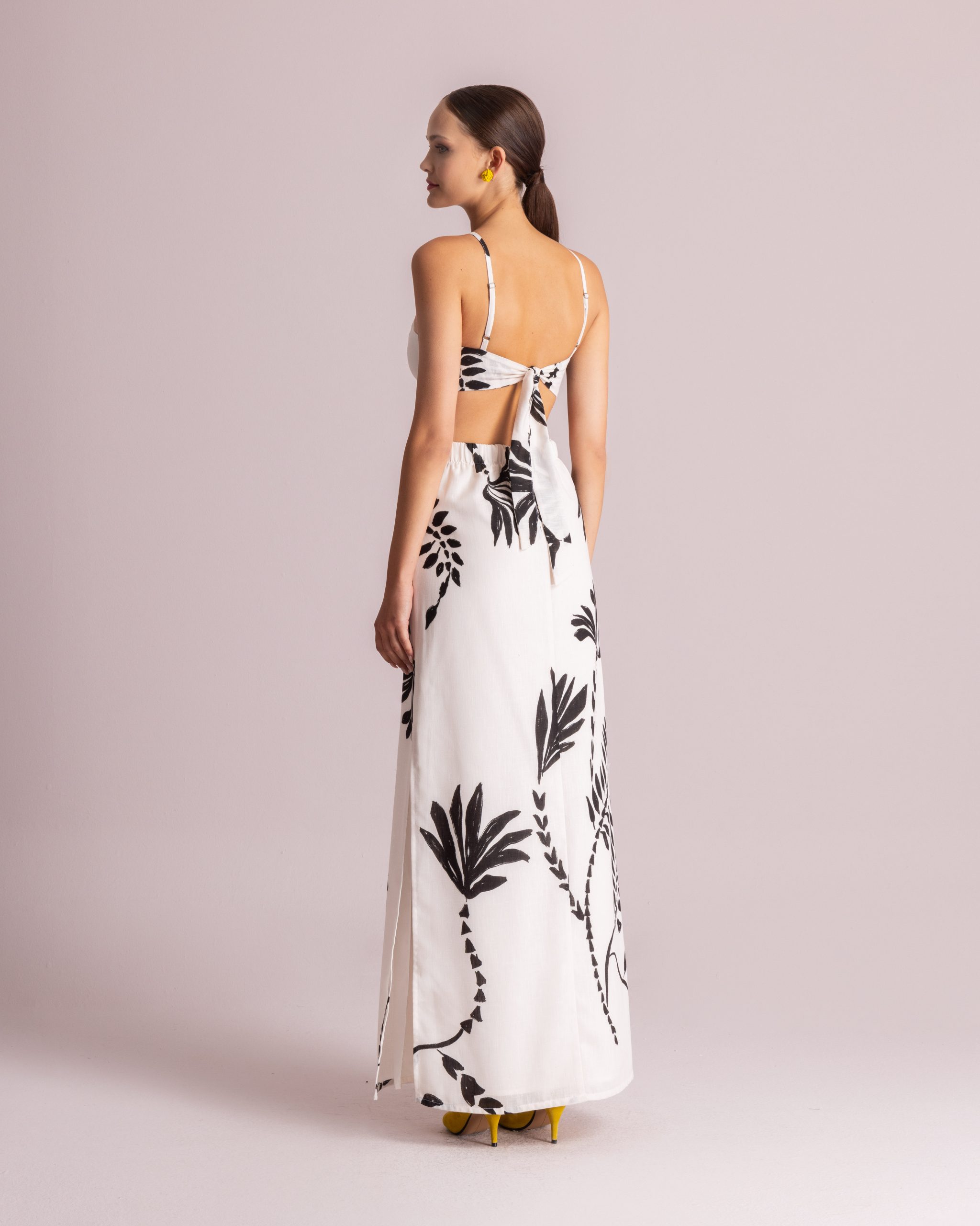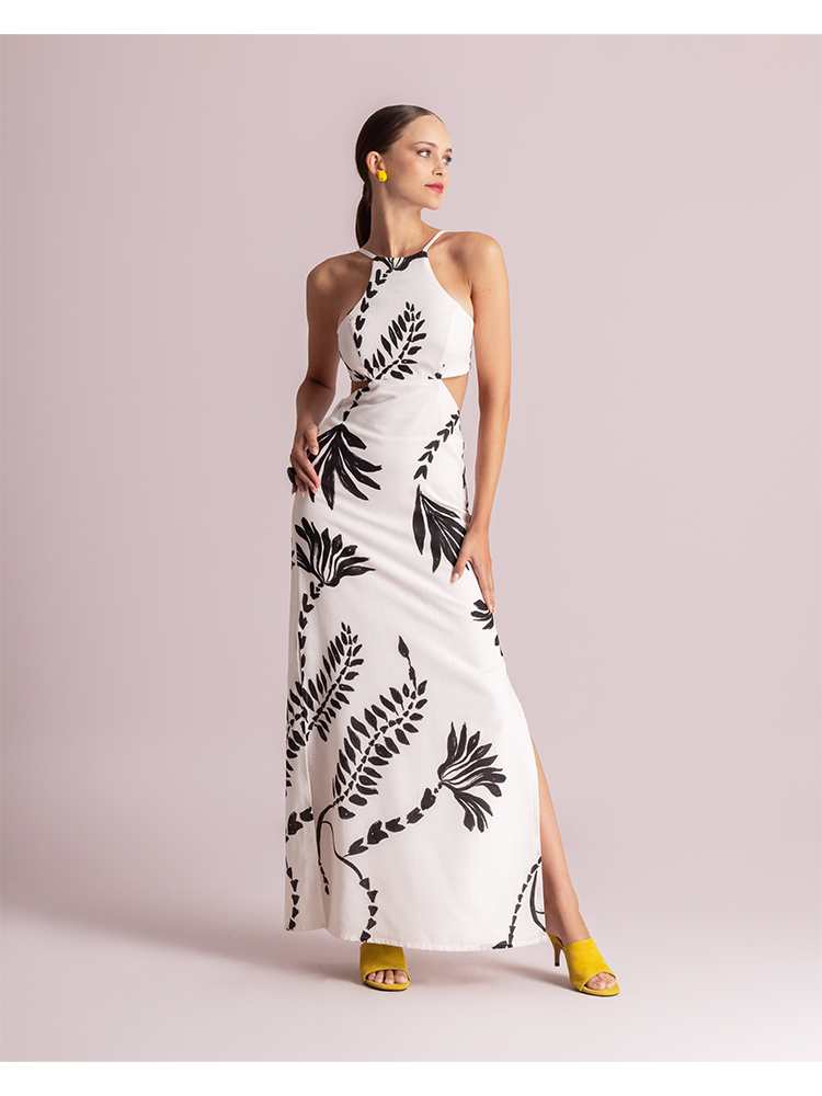 This maxi dress is crafted from a lightweight fabric and features a bold black botanical print. Designed with a sleek, body-skimming silhouette, it showcases a halter-style neckline and subtle side cut-outs that enhance the waist. The dress falls to a full-length hem with a side slit.