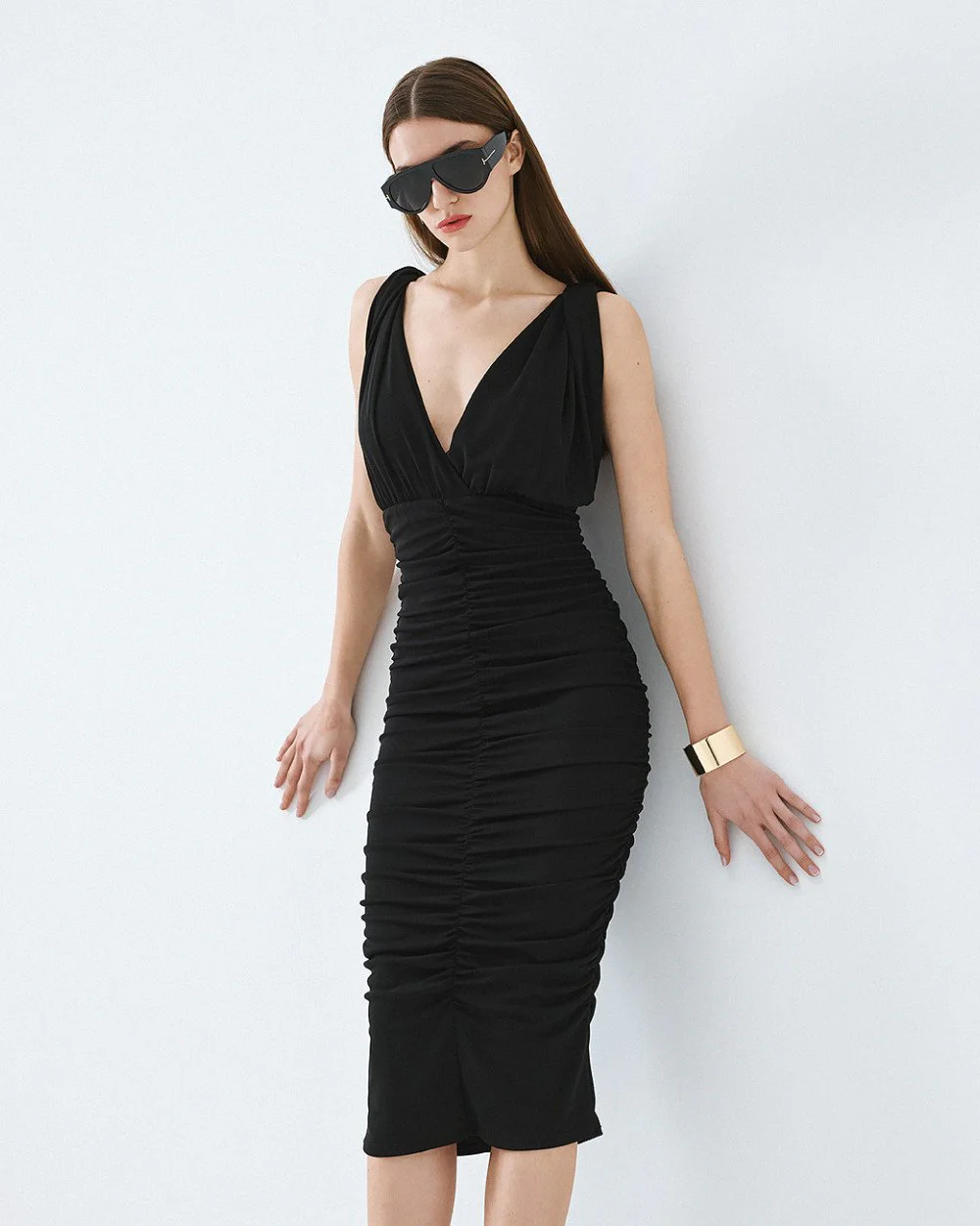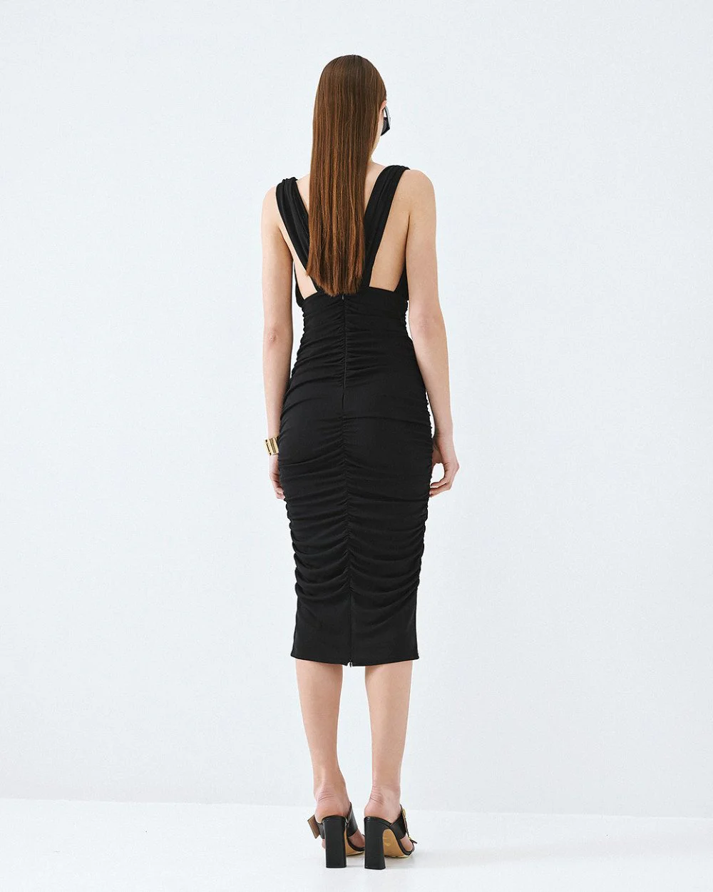 Sleeveless midi dress with a v-neckline and gathered details. Features a back zip closure and inner lining.