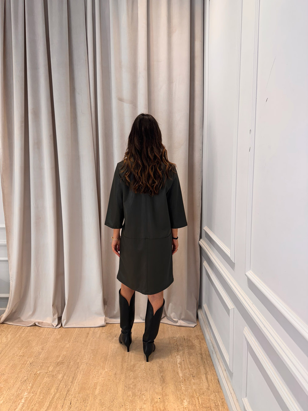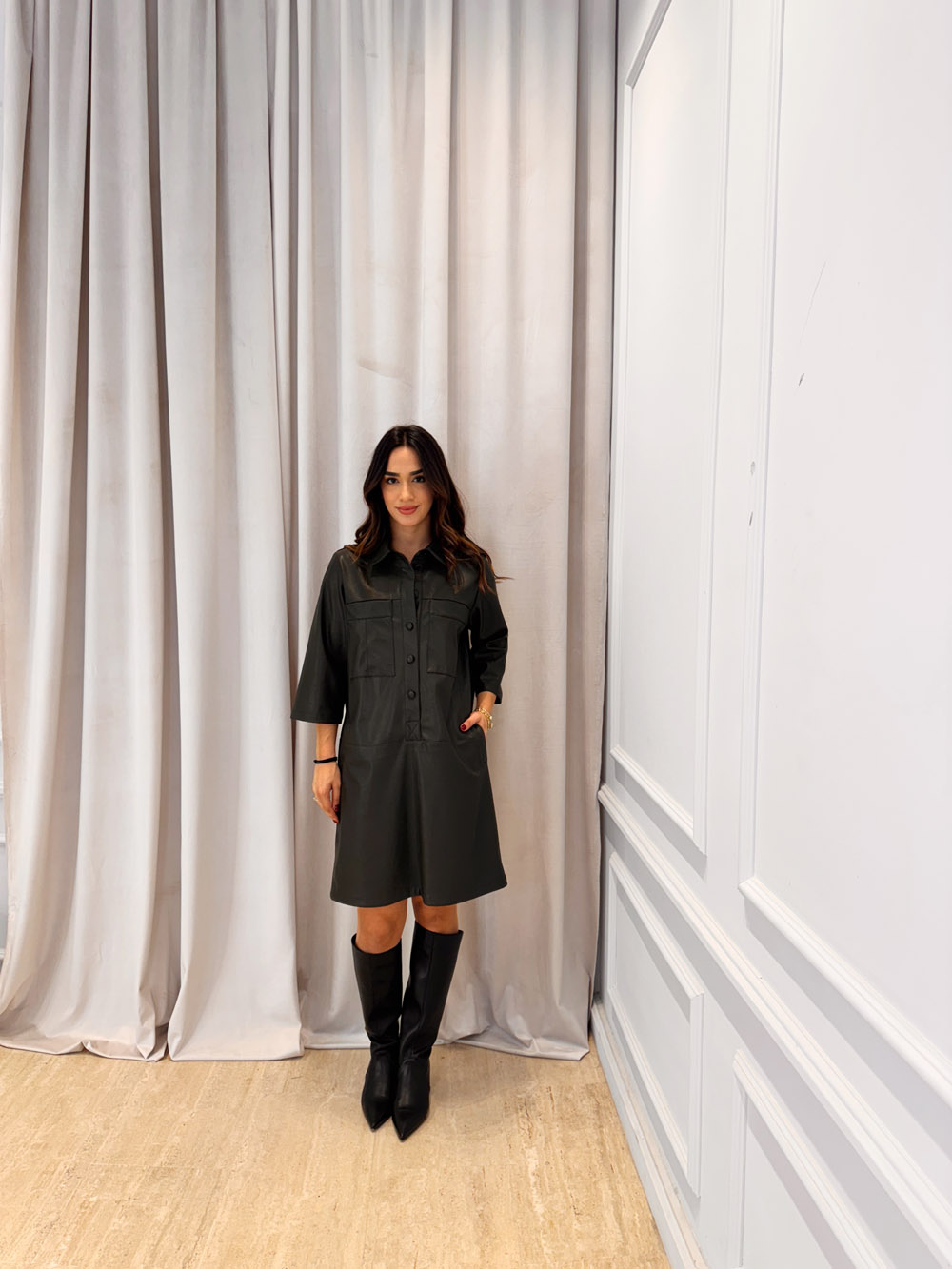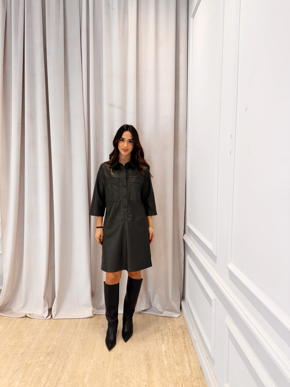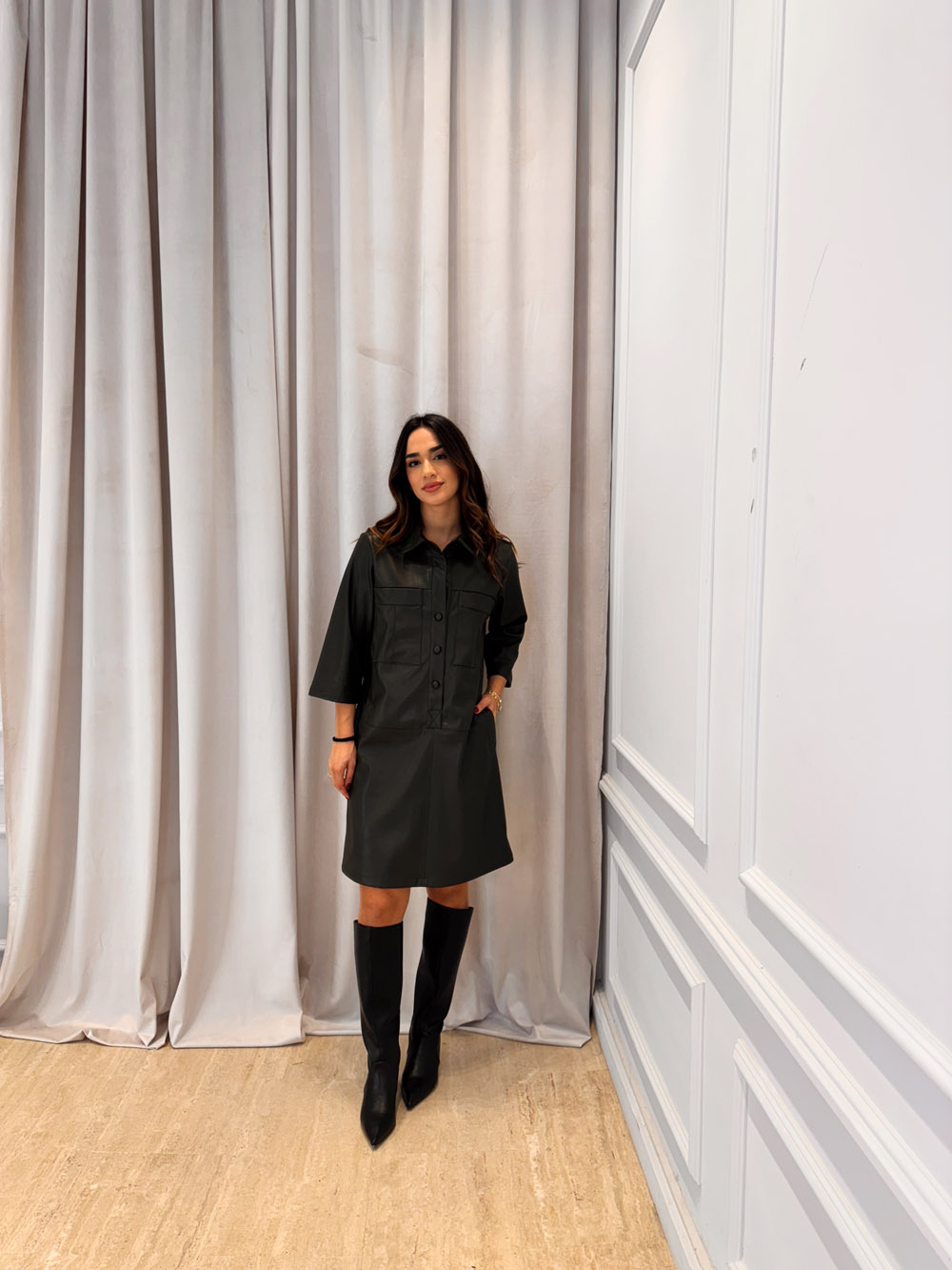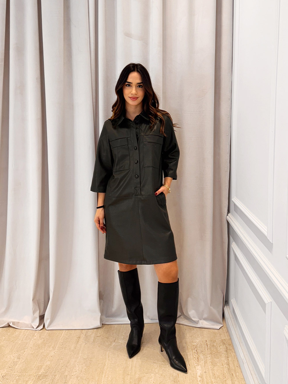 Eco-leather dress featuring a shirt-style collar, front button closure, and chest pockets. The straight fit, 3/4 sleeves, and knee-length cut make it a versatile option for both daytime and evening looks.