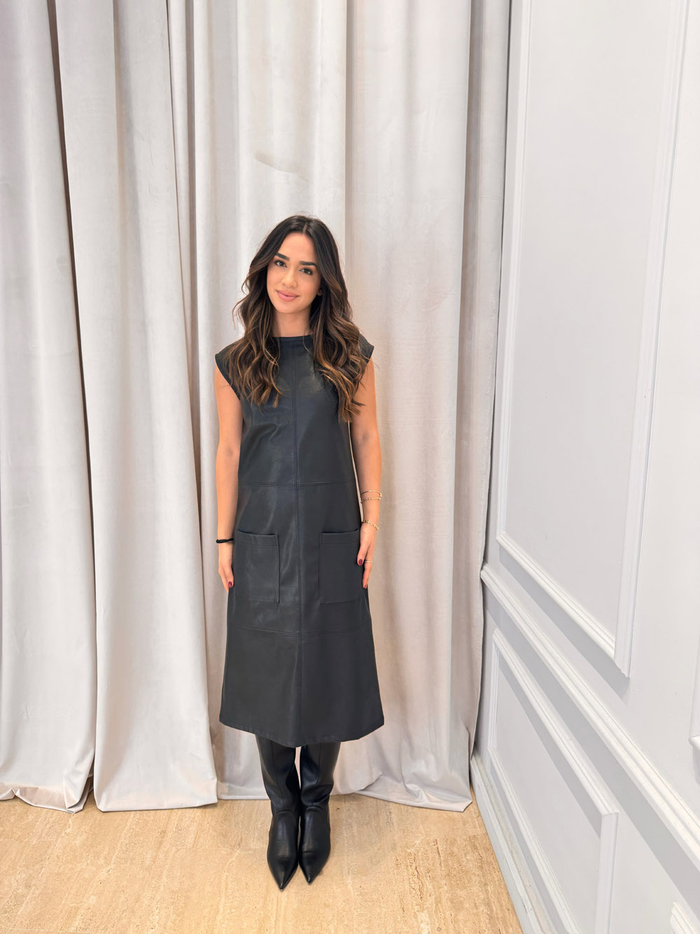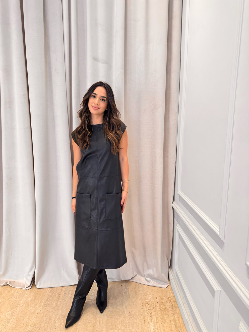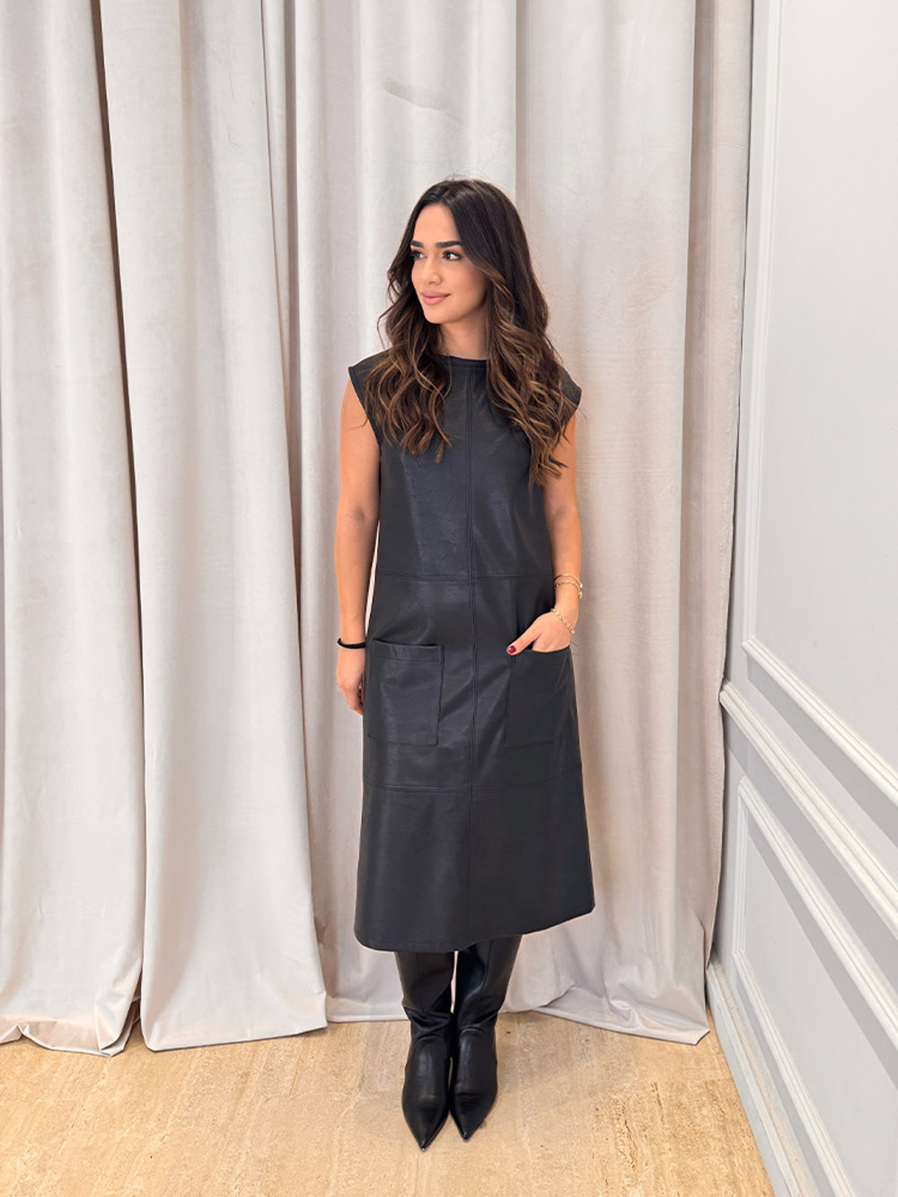 This eco-leather midi dress crafted from high-quality eco leather, the sleeveless cut adds a contemporary, minimalist touch, while the straight body shape creates a clean, polished line. Front patch pockets introduce a practical yet stylish element, and the back slit ensures ease of movement.
