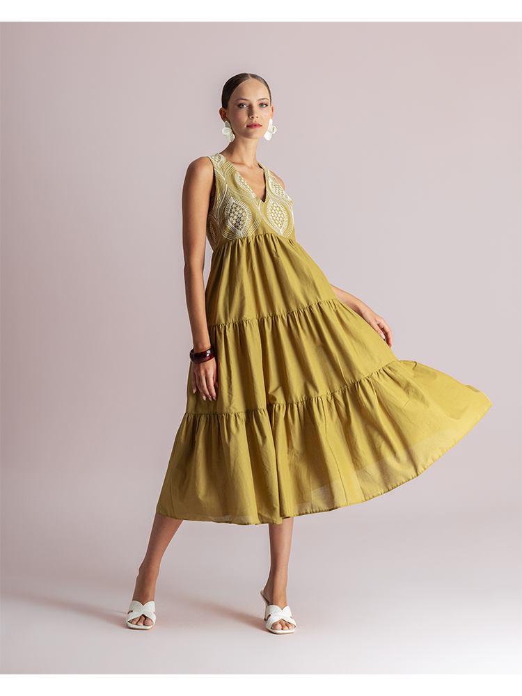 This midi dress is crafted from a lightweigh fabric and features a beautifully embroidered bodice with intricate geometric patterns. Designed with a sleeveless cut and a soft v-neckline, it flows into a voluminous, tiered skirt that creates graceful movement.