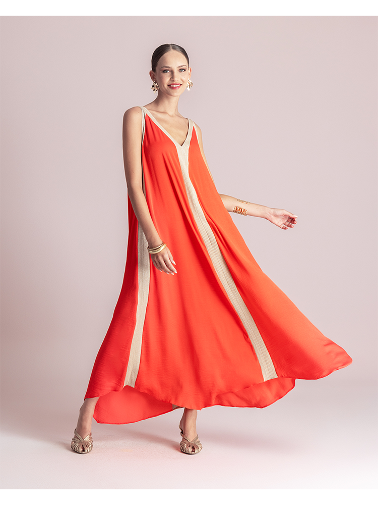 This flowing maxi dress is crafted from a lightweight, airy fabric. Featuring a relaxed, loose-fit design with a v-neckline and slender shoulder straps. It showcases contrasting vertical panels in a soft neutral tone.
