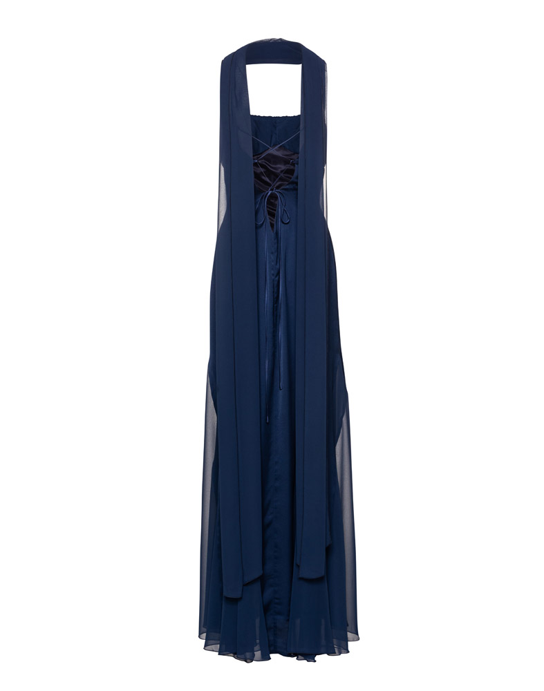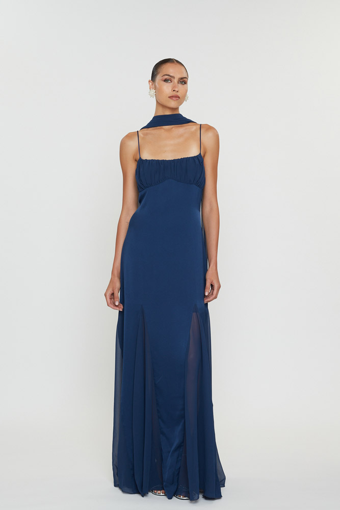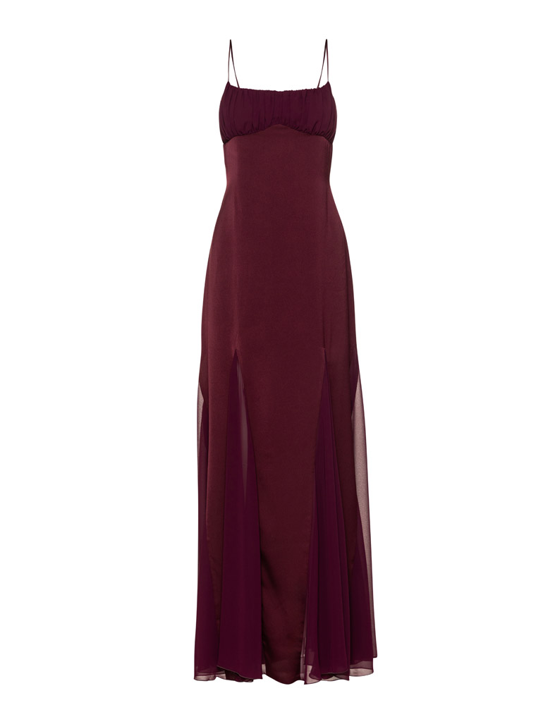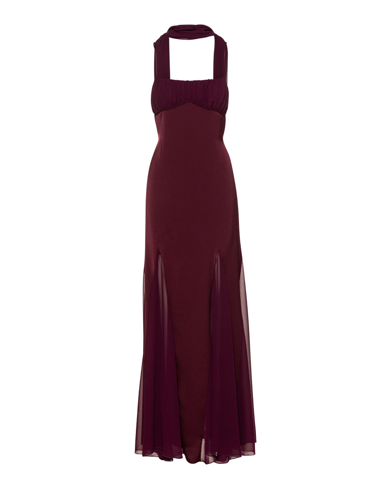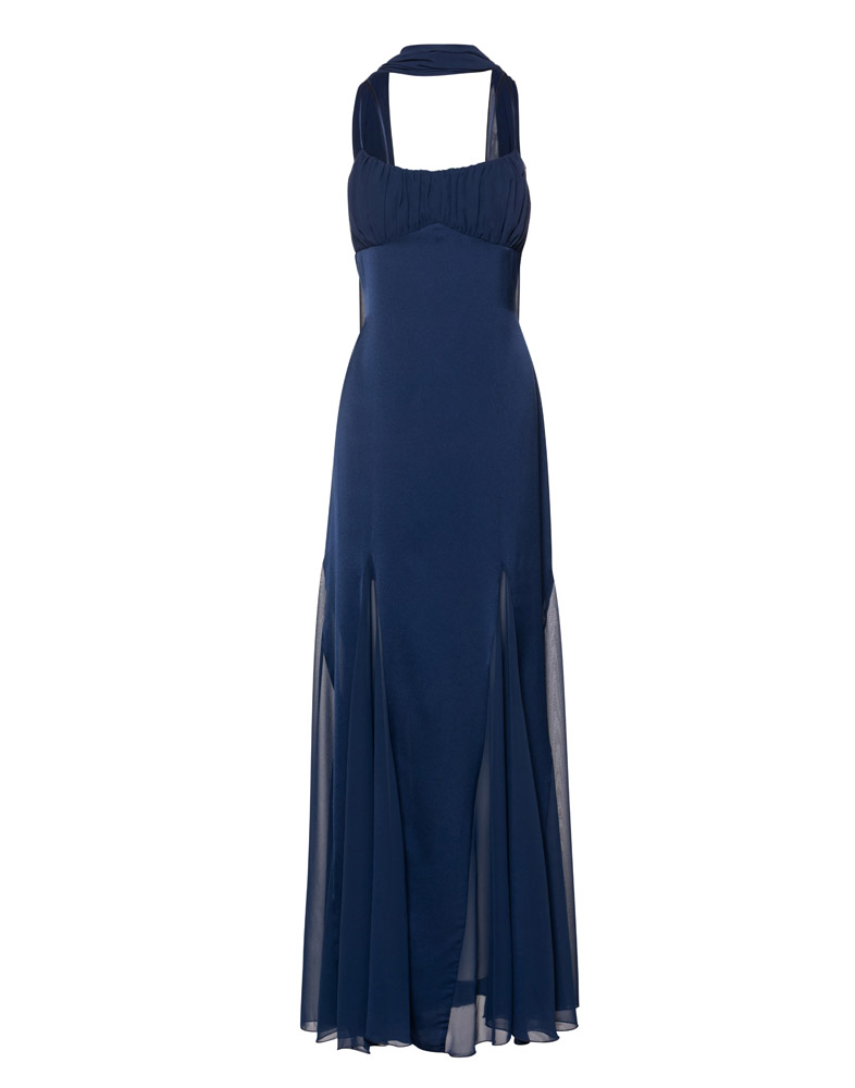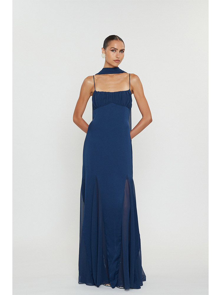 A sophisticated evening dress from Mix & Match crafted from lightweight, fluid fabric, designed to move beautifully with every step. The Gabrielle dress features a softly gathered bust, slim spaghetti straps and a detachable scarf detail that can be styled around the neck or left to fall along the back. The low open back is finished with delicate criss-cross straps, while the semi-sheer panels through the skirt add subtle drama. A refined choice for special occasions and elegant winter events.