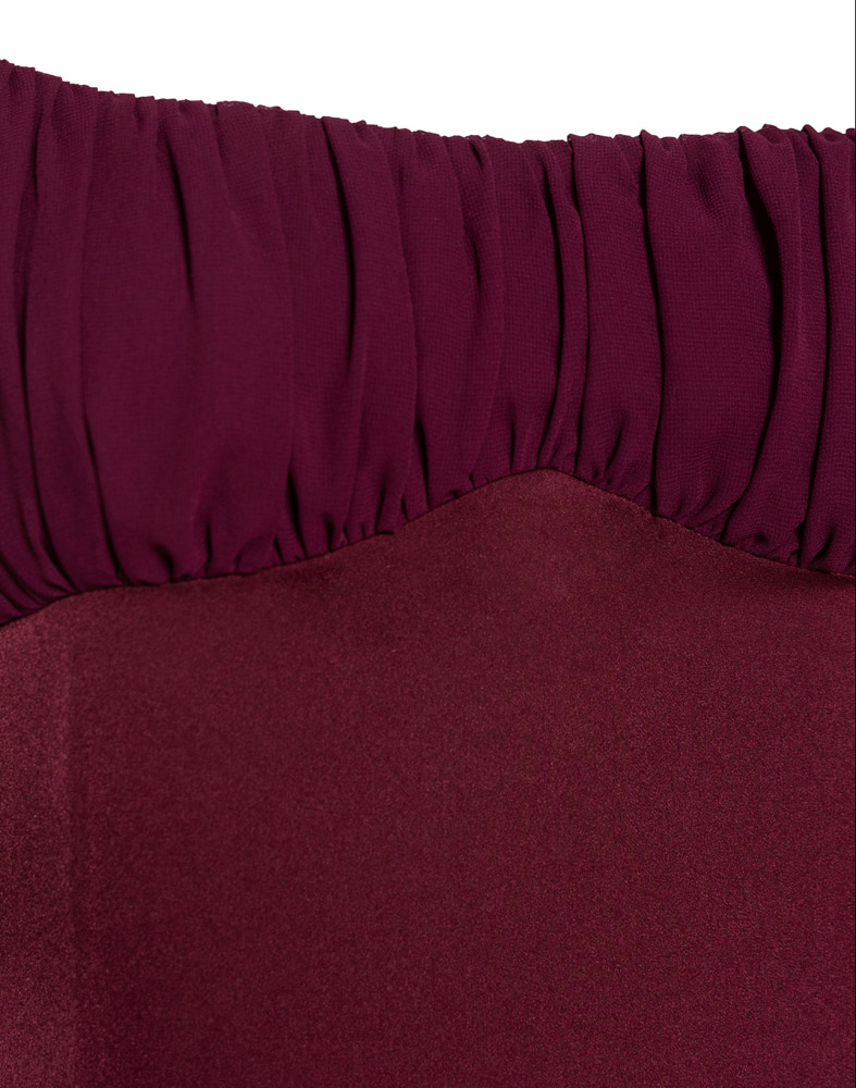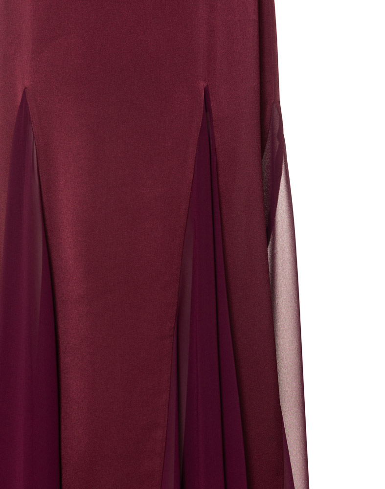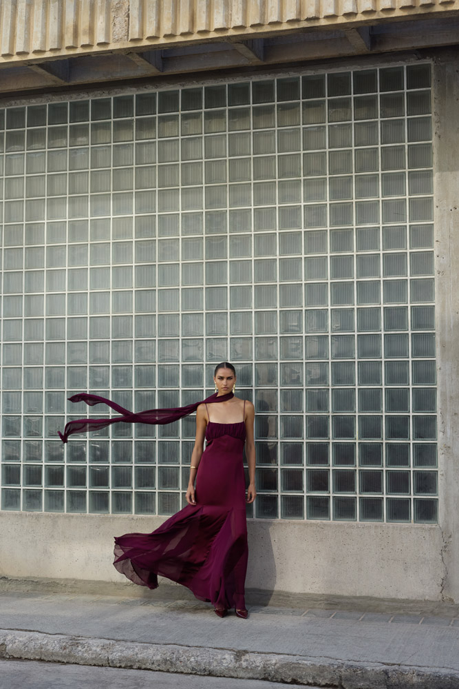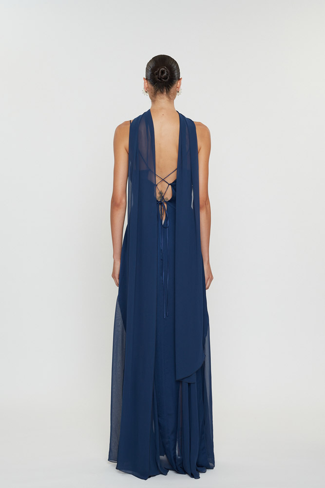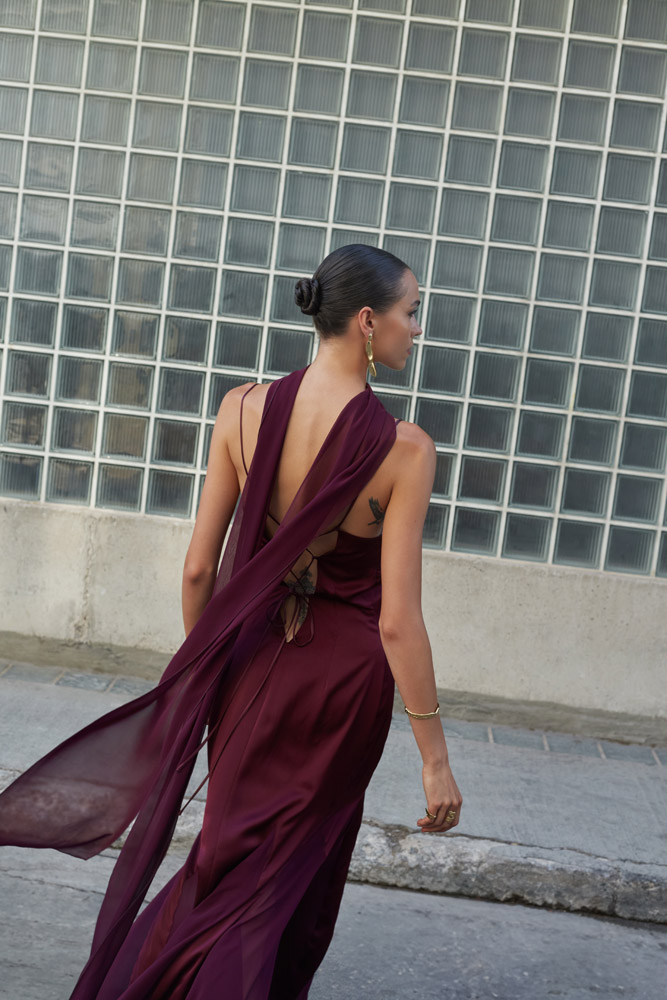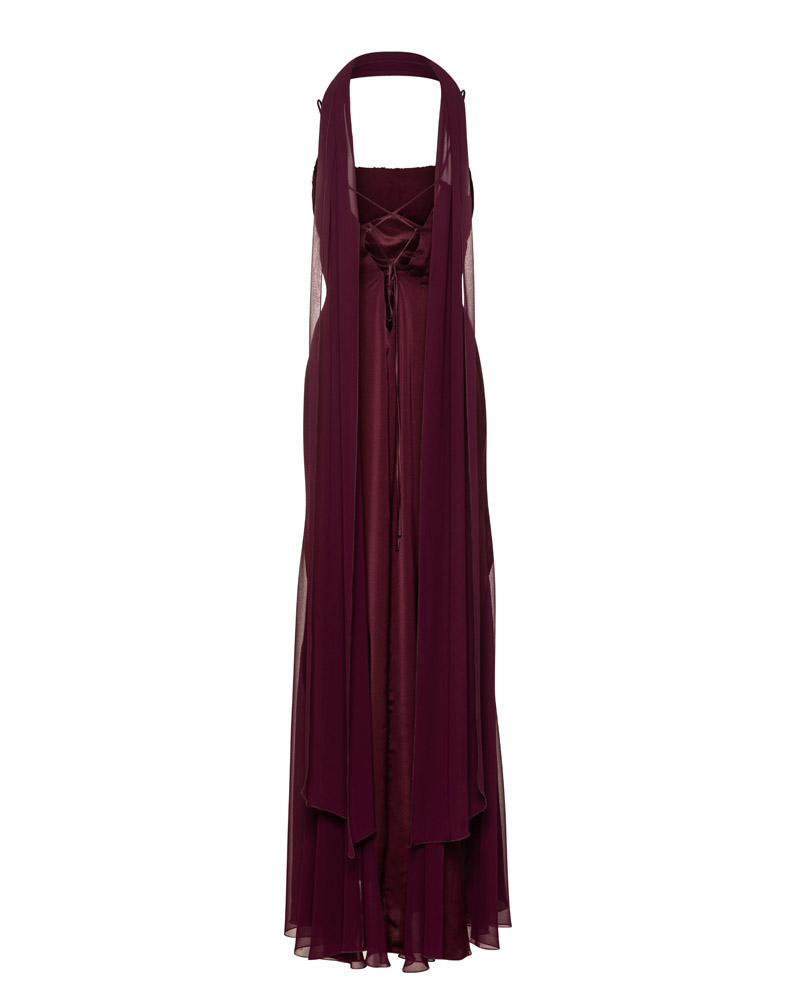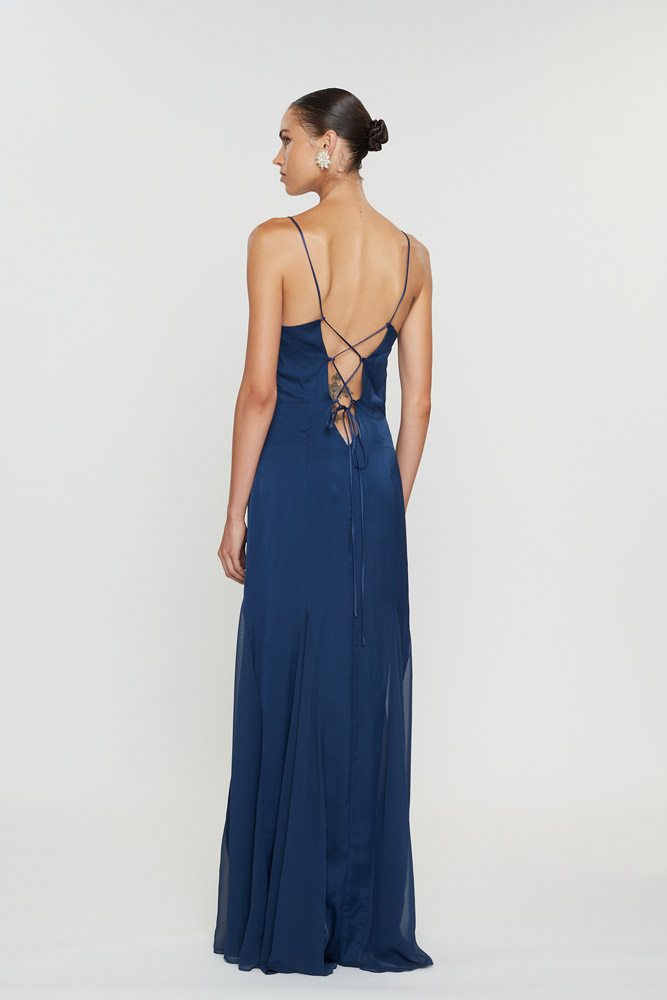 A sophisticated evening dress from Mix & Match crafted from lightweight, fluid fabric, designed to move beautifully with every step. The Gabrielle dress features a softly gathered bust, slim spaghetti straps and a detachable scarf detail that can be styled around the neck or left to fall along the back. The low open back is finished with delicate criss-cross straps, while the semi-sheer panels through the skirt add subtle drama. A refined choice for special occasions and elegant winter events.