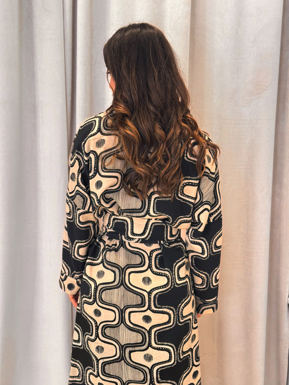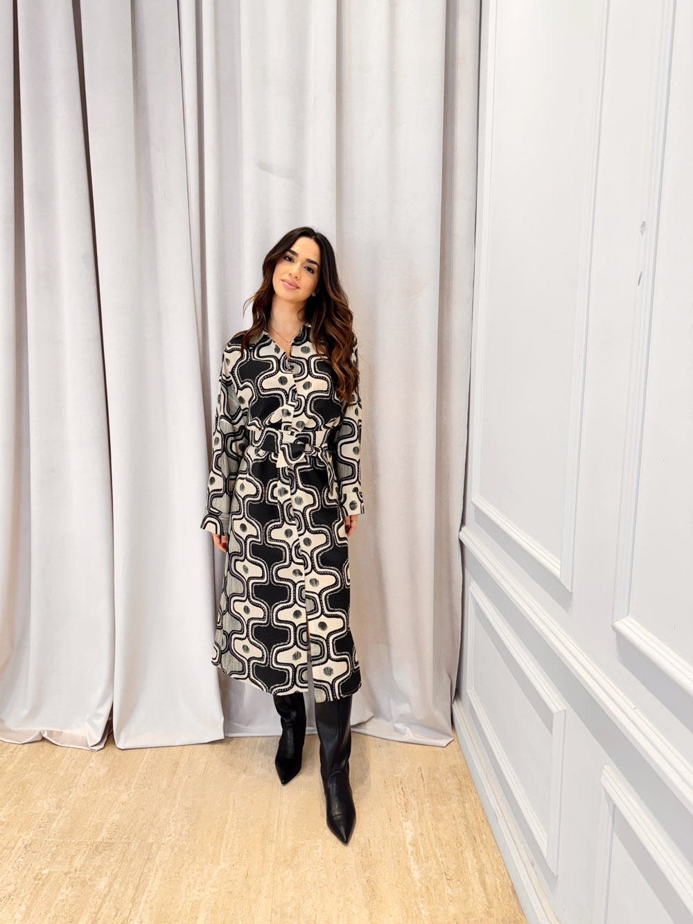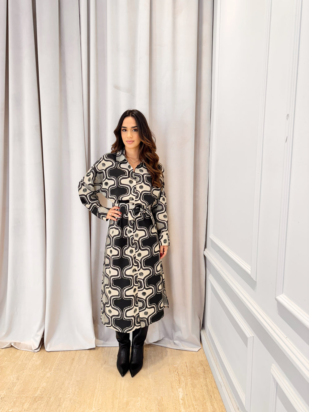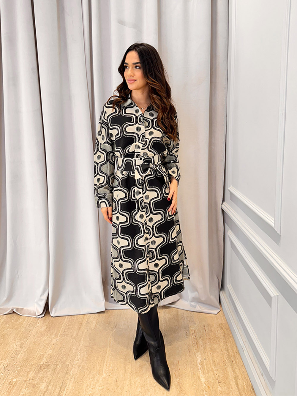 Geometric print shirt dress featuring a statement geometric pattern, the dress is designed with a collared neckline, button-down front, and a matching fabric belt that cinches the waist for a flattering fit. Its midi length and long sleeves make it versatile for both professional and casual occasions.