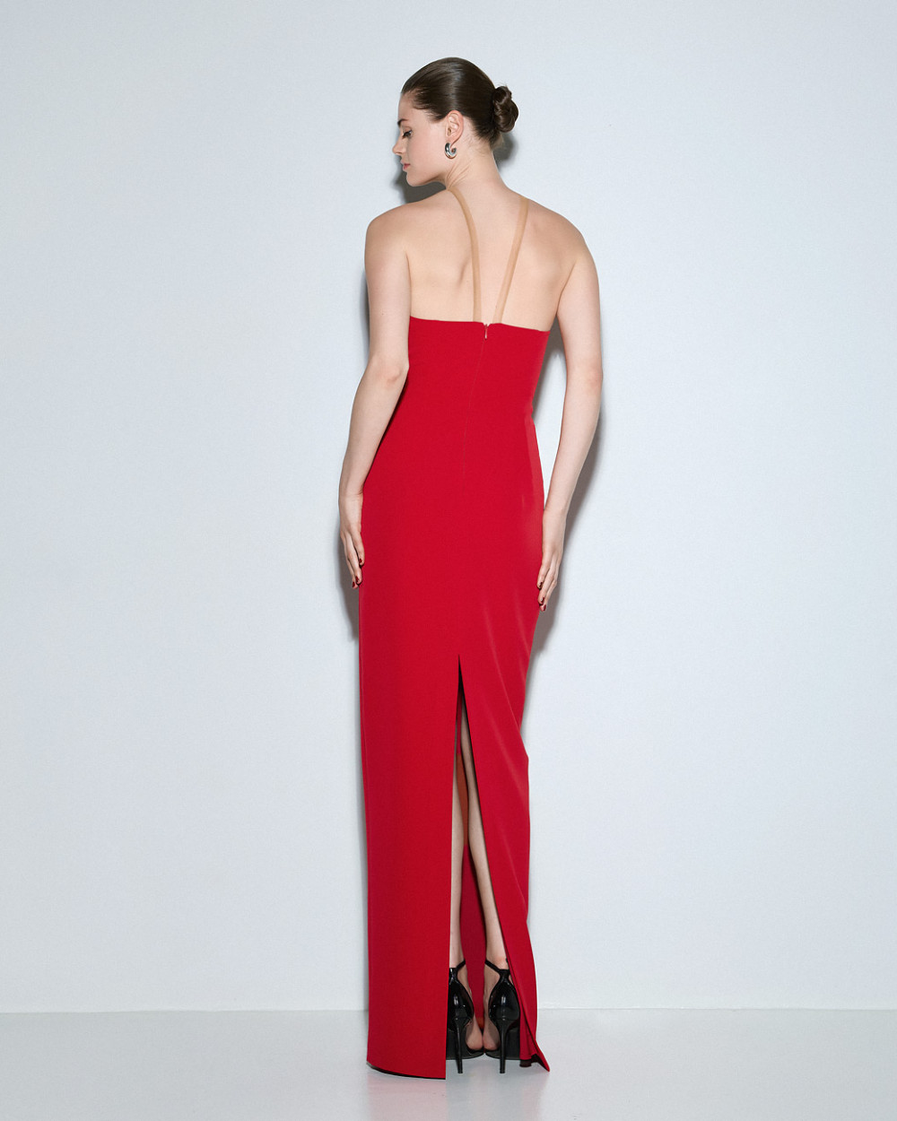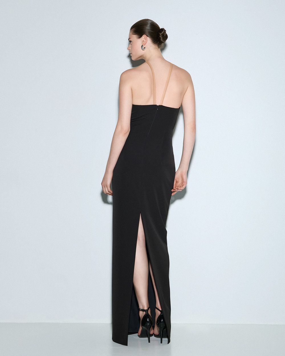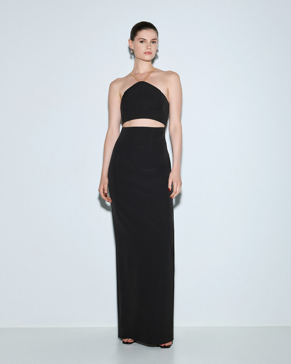 Long dress with a halter neckline. It features a striking front cut-out and a back slit. It is an ideal choice for stylish looks.