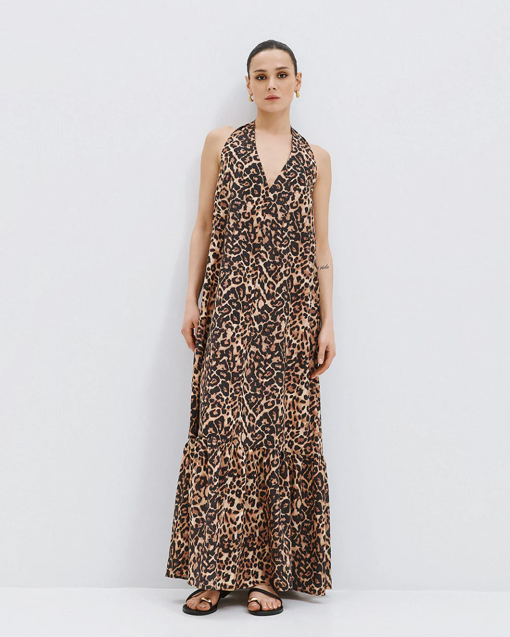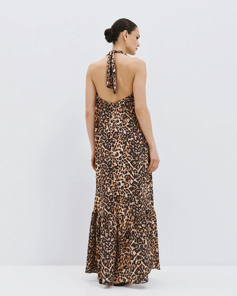 Maxi halter dress with a leopard print and a V neckline. Features an open back with elastic at the upper part and a ruffle detail at the hem.