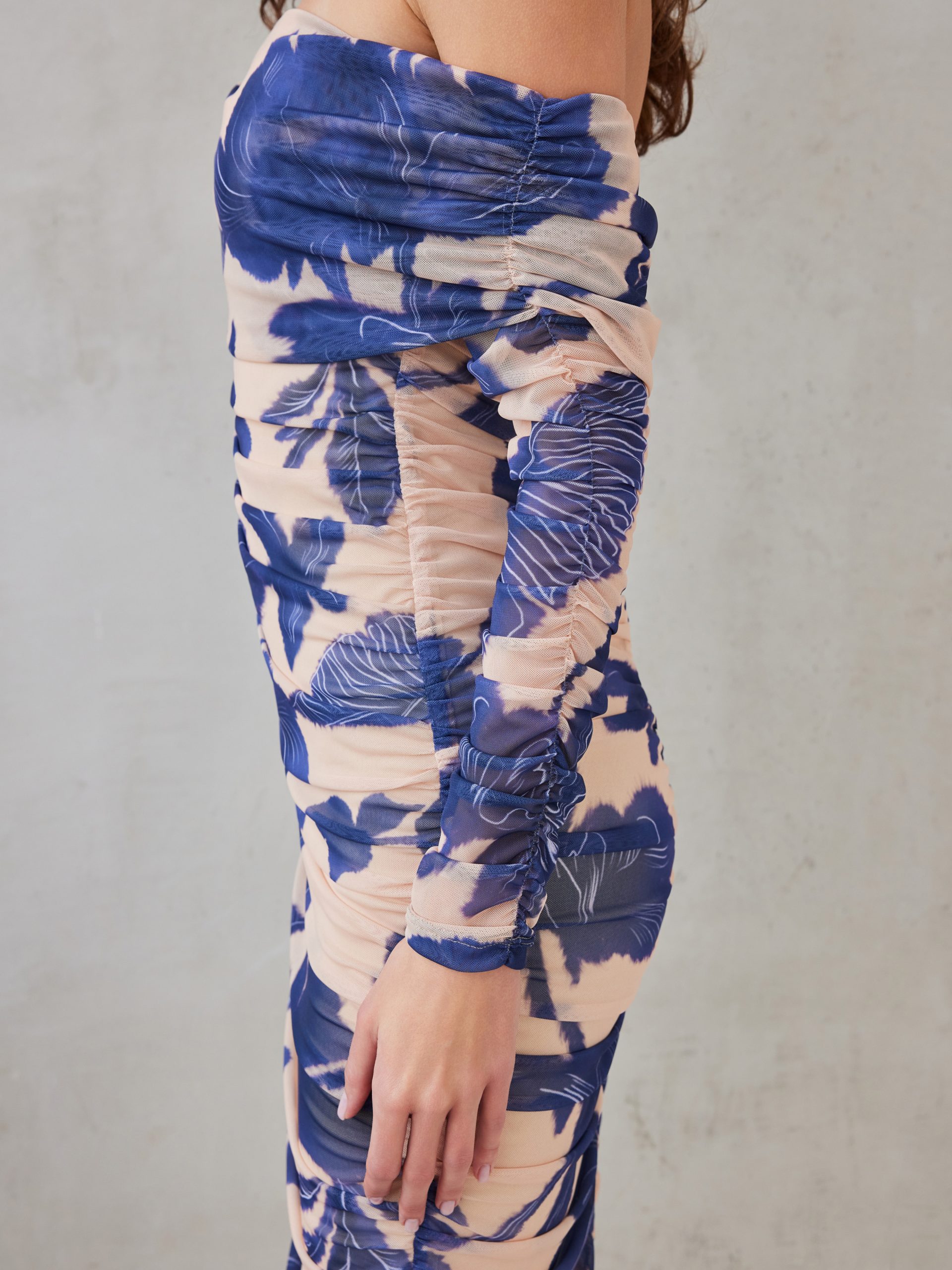This elegant off-shoulder midi dress crafted from a lightweight, stretchy fabric, the design hugs the body while the ruched detailing enhances the silhouette. The off-shoulder neckline and long fitted sleeves bring feminine touch, making it perfect for evening events or special occasions.