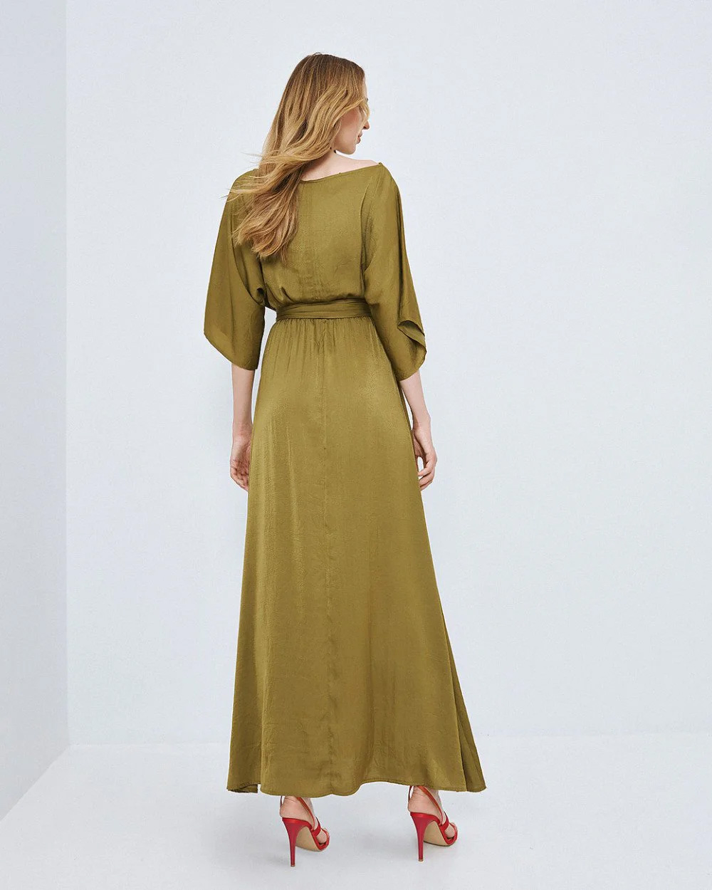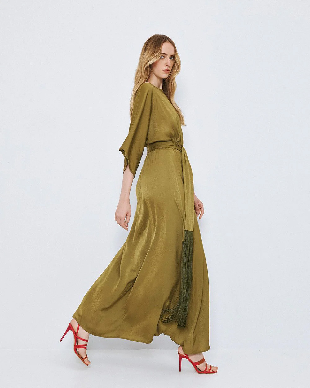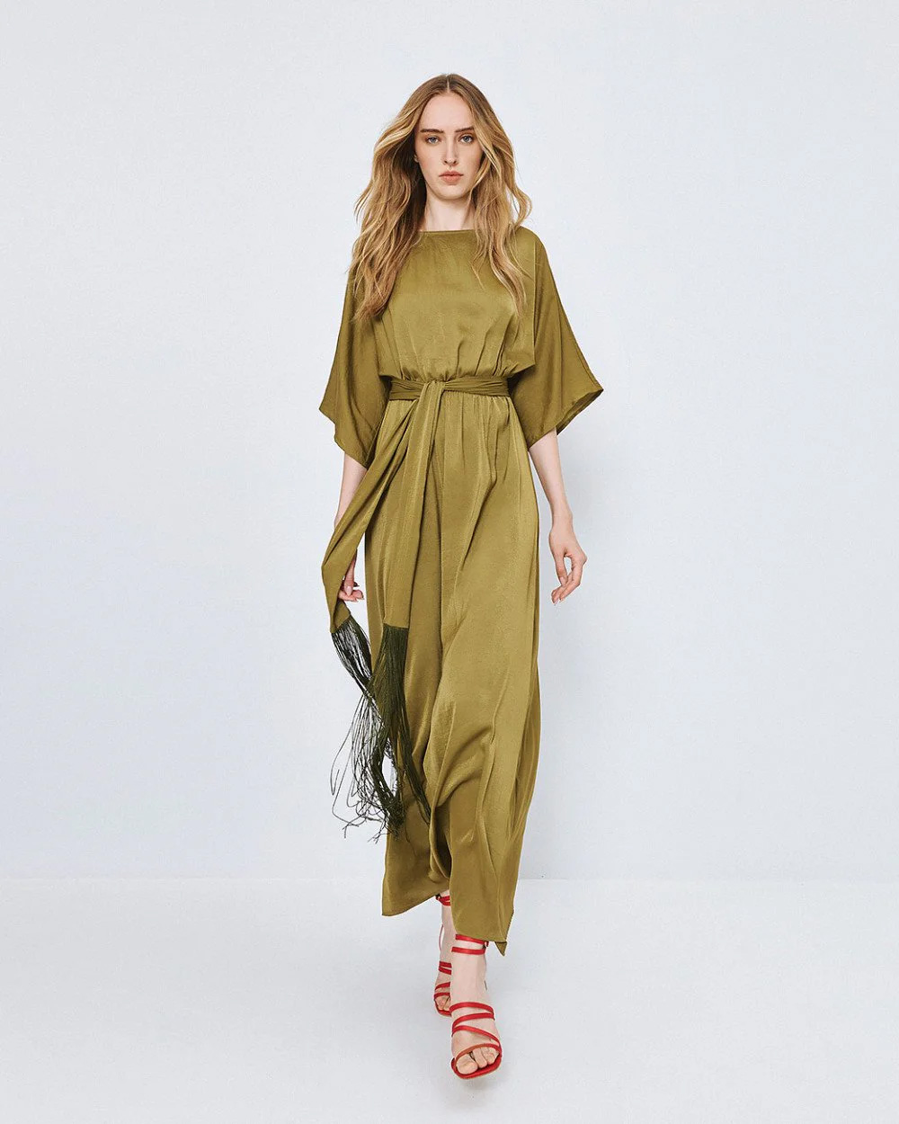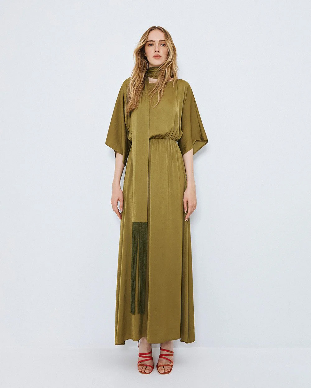 Long dress with a boat neckline and wide 3/4 sleeves. Featuring an elastic waist and a detachable belt with fringes.