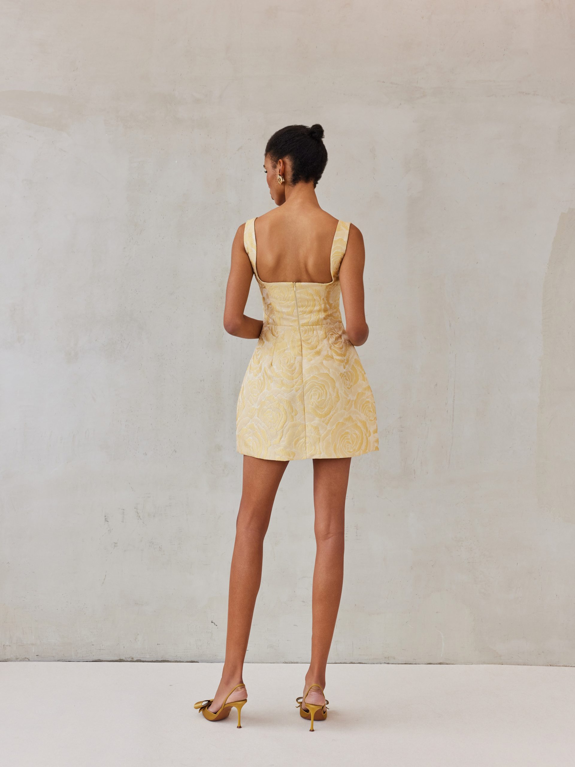 This elegant mini dress is crafted from textured jacquard fabric in a soft pastel yellow shade with a rose pattern woven throughout. The structured silhouette highlights the waist while the square neckline and wide straps create a feminine look. Its slightly flared skirt adds movement and balance, making the dress playful.
