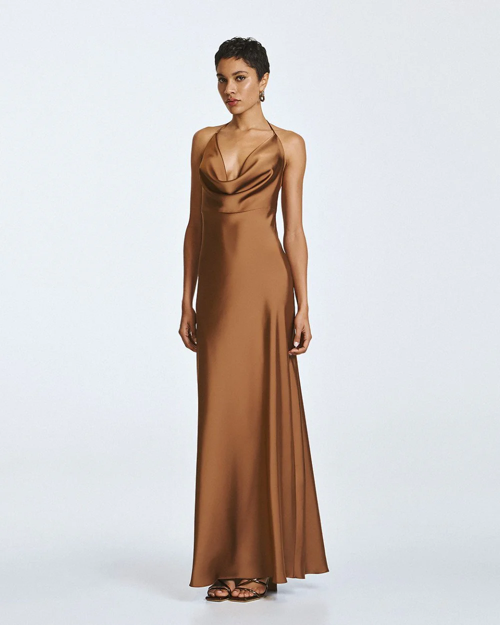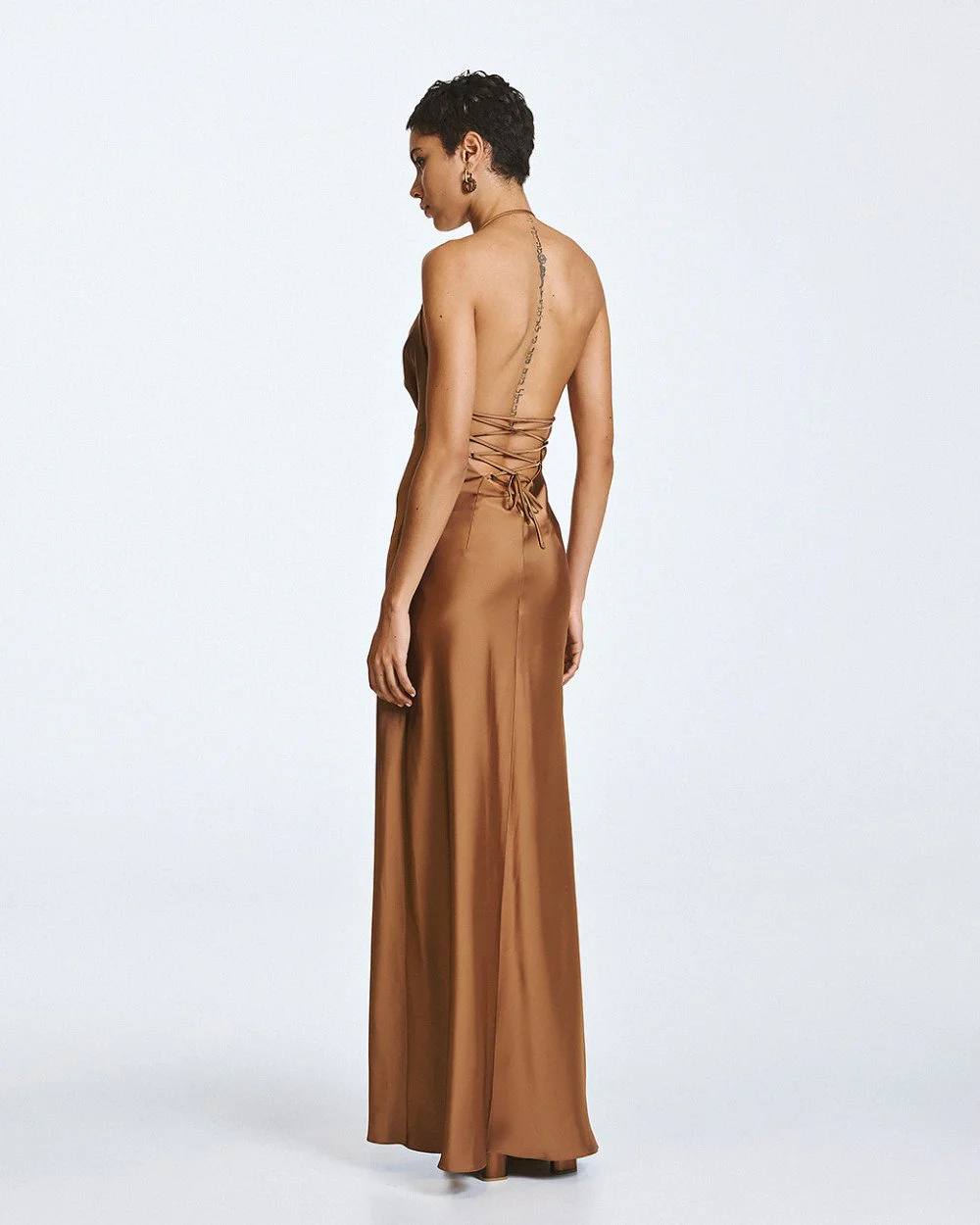 Maxi satin dress with draped detailing at the front and an adjustable halter neckline. Features an open back with criss-cross tie fastenings.