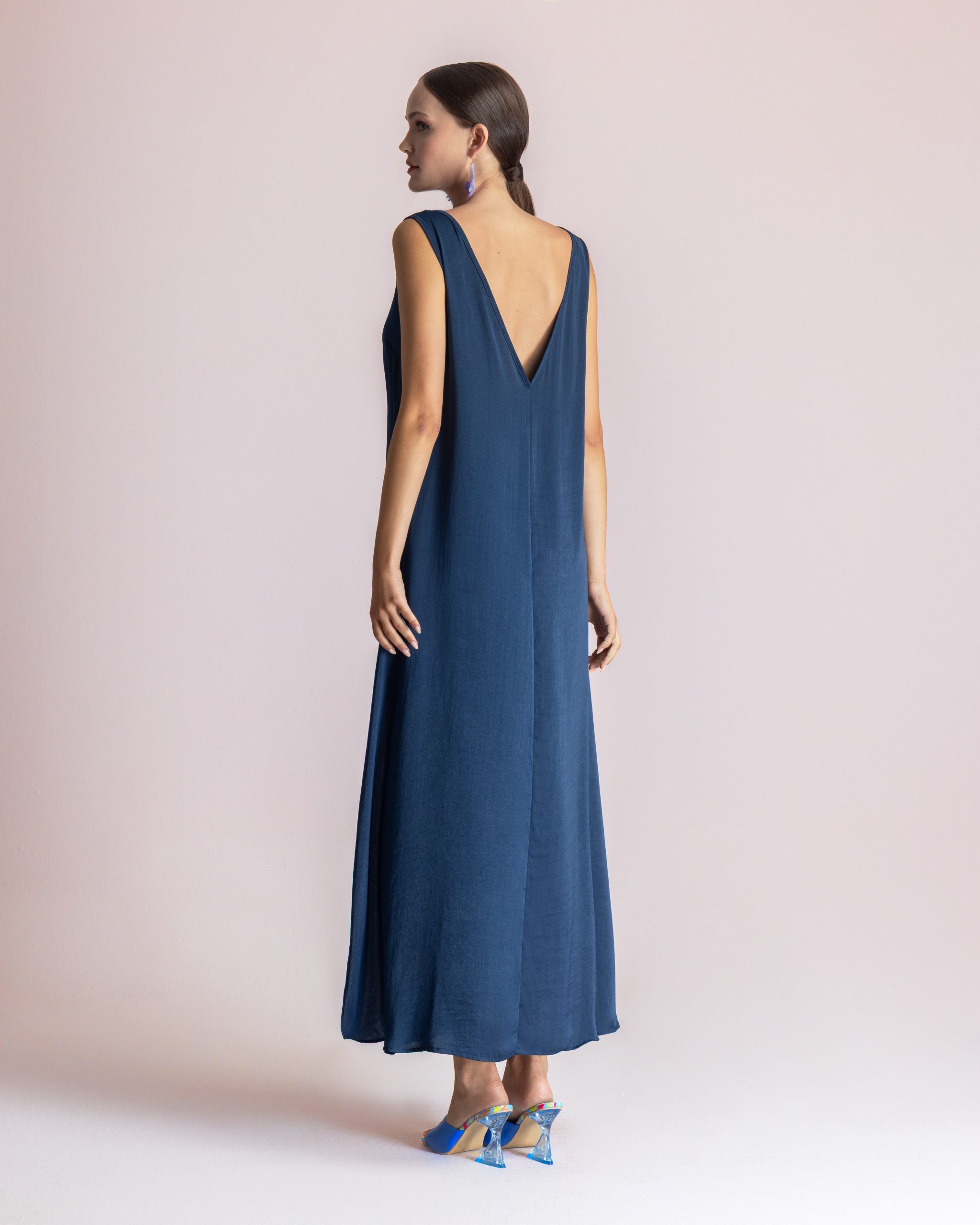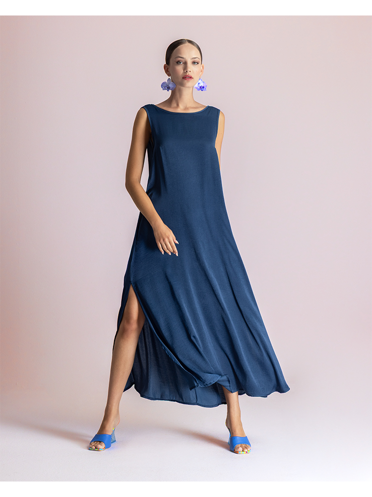 Maxi dress is designed with a fluid silhouette, featuring a sleeveless cut and a graceful side slit. The detachable belt allows you to define the waist or wear it loose for a more relaxed look.