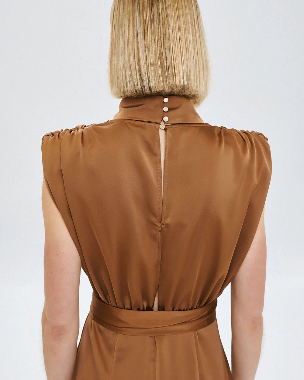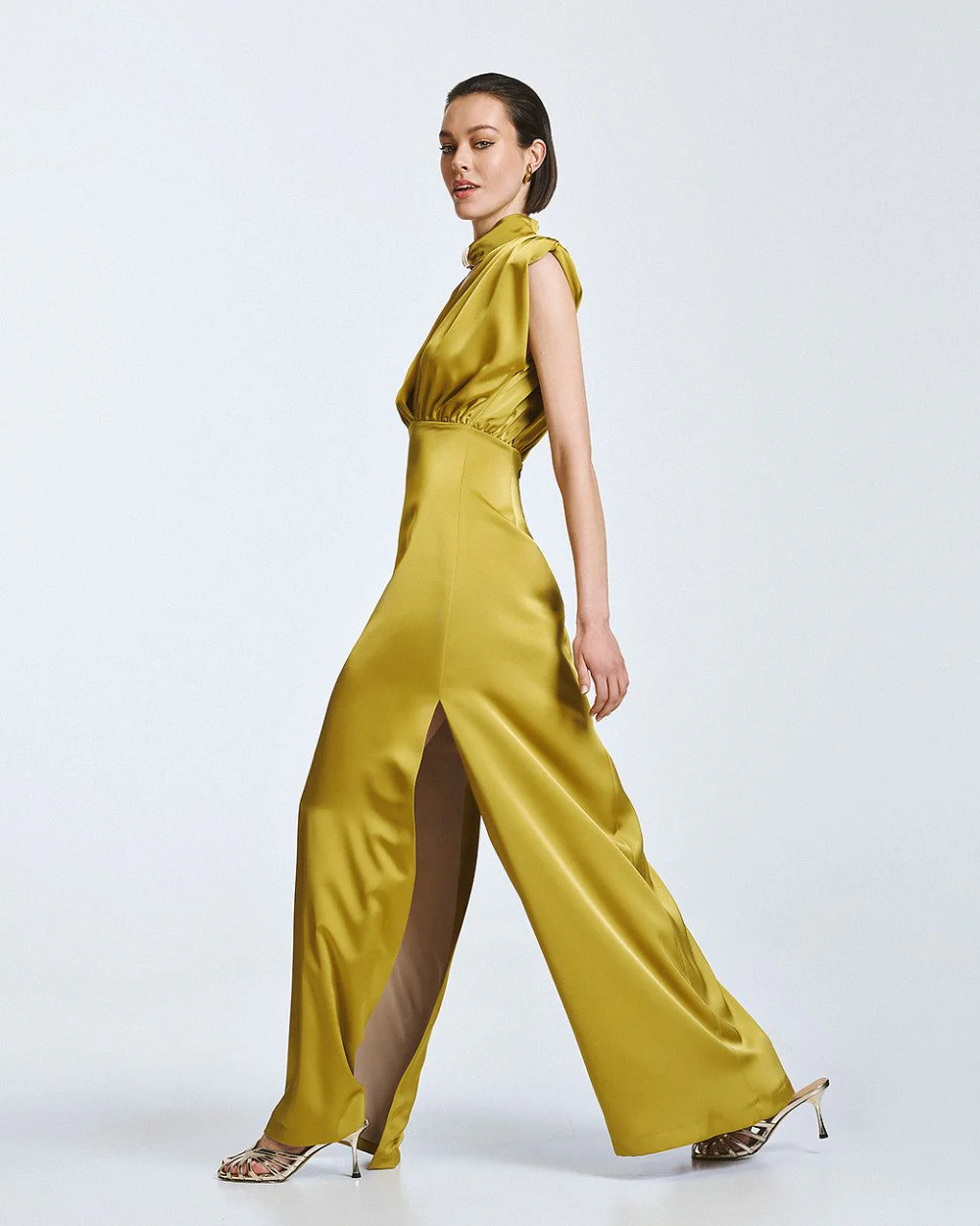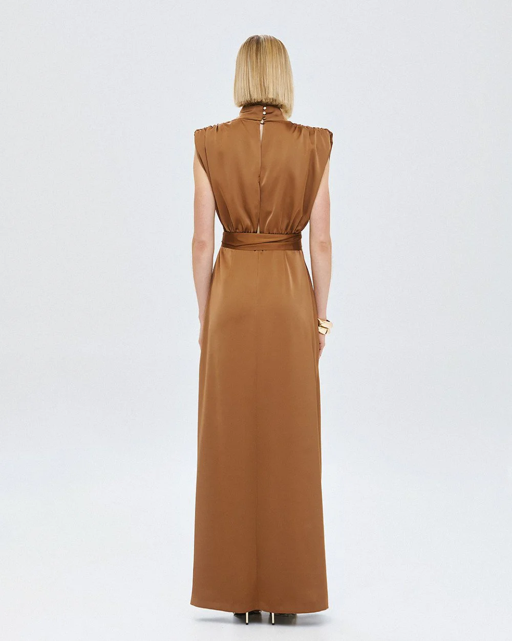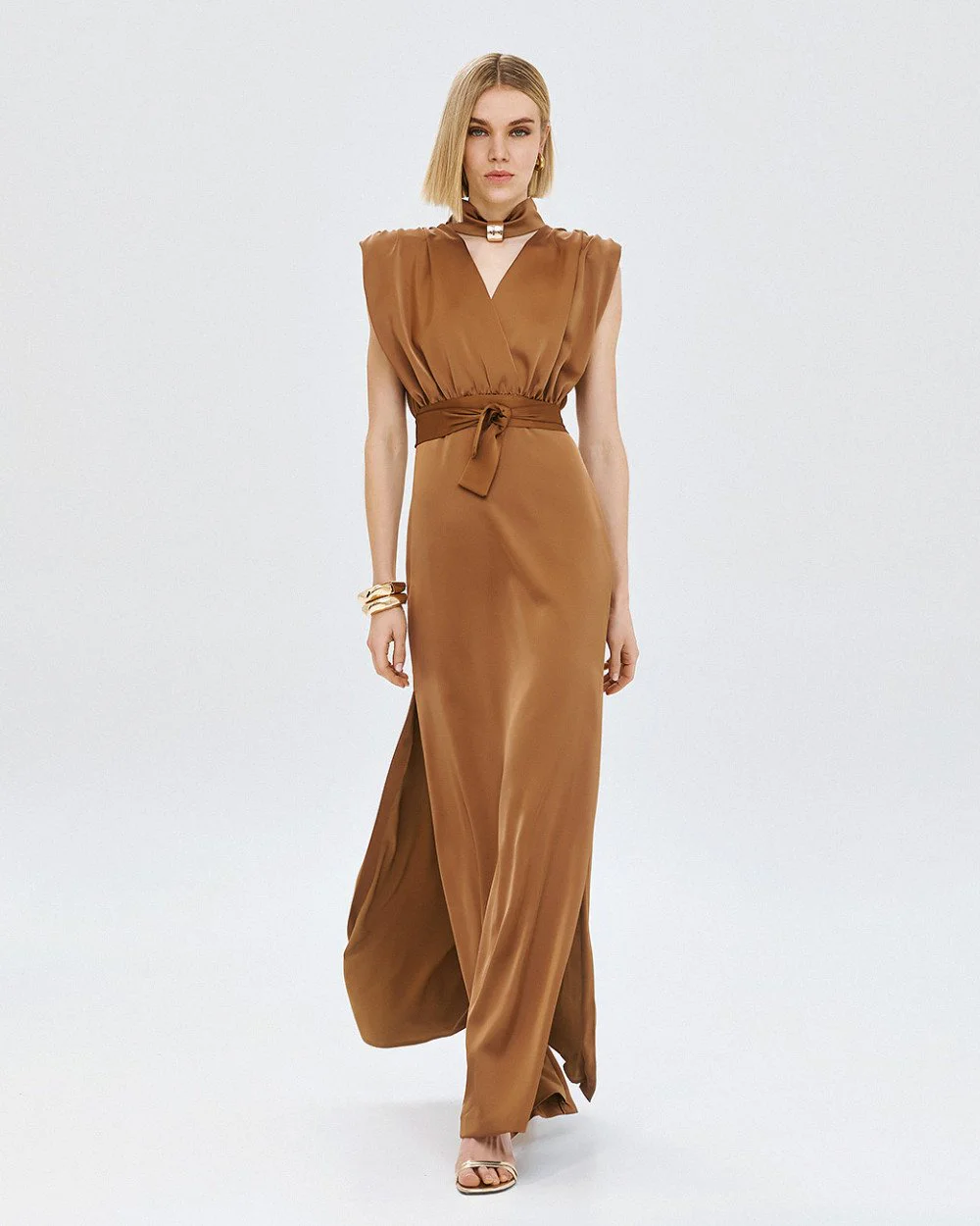 Maxi satin sleeveless dress with a v-neckline at the front, padded shoulders, and gathered details. Features side slits, a metallic detail at the neckline, a detachable self-tie belt, and zip and button fastening at the back.