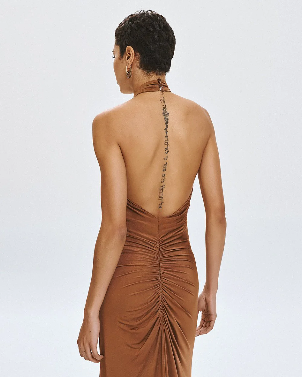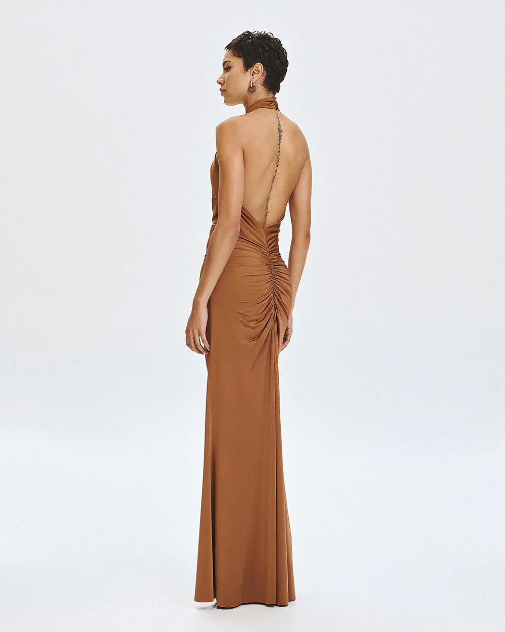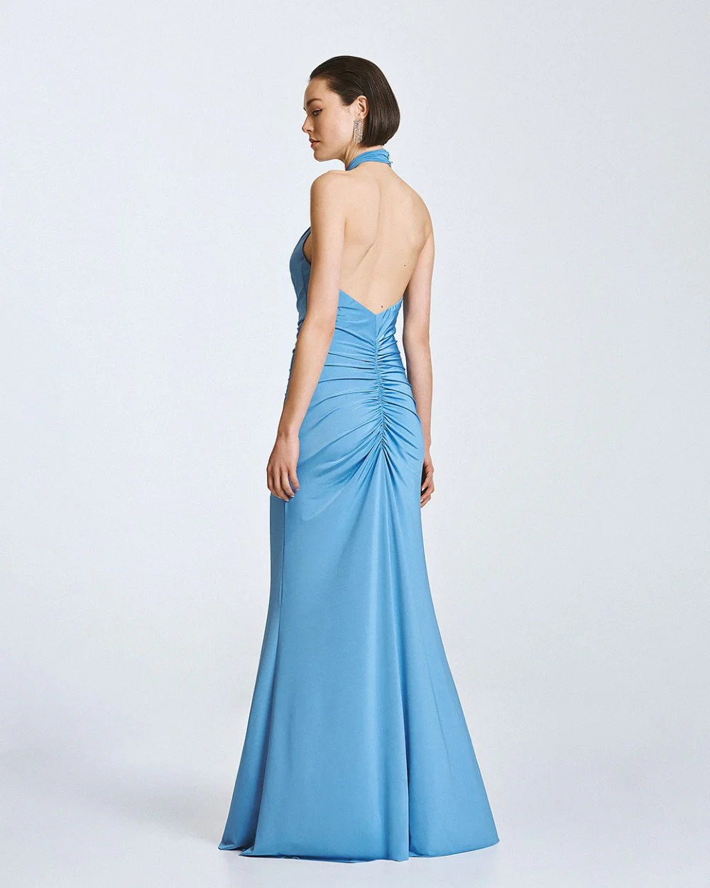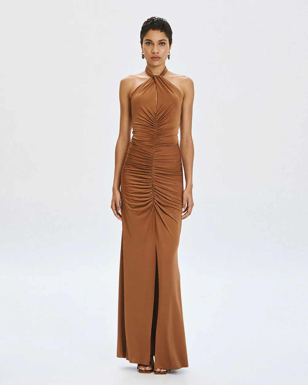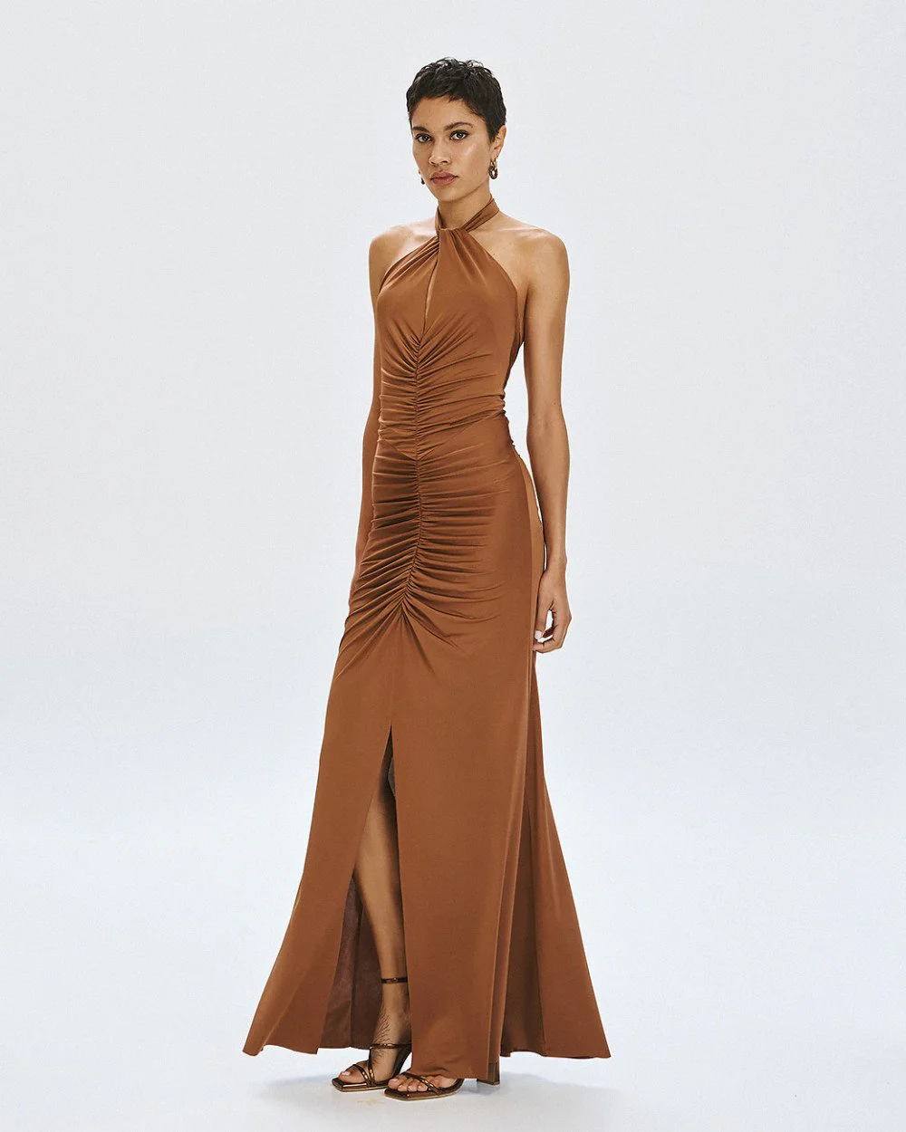 Maxi halter dress with distinctive gathered details, an open back and a front slit.