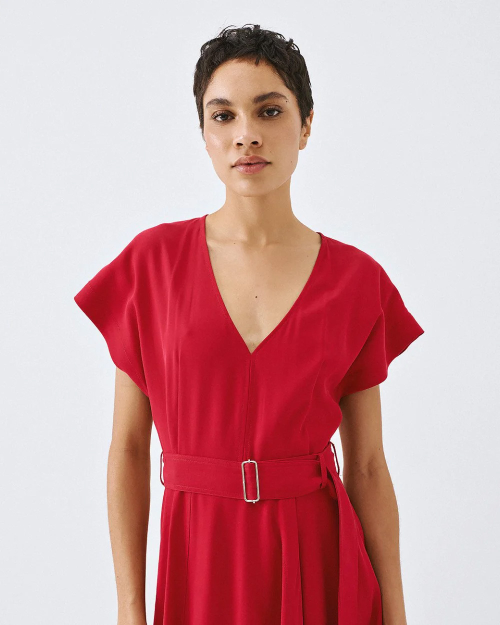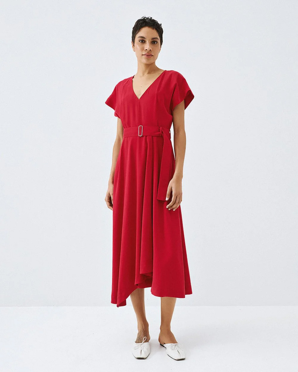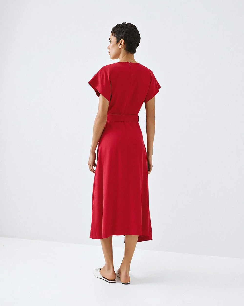 Midi flared dress with a V-neckline, short sleeves, and a front opening at the hem. Designed with belt loops, a detachable tie belt with a buckle, and a back zip closure.
