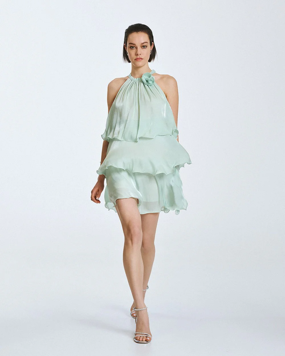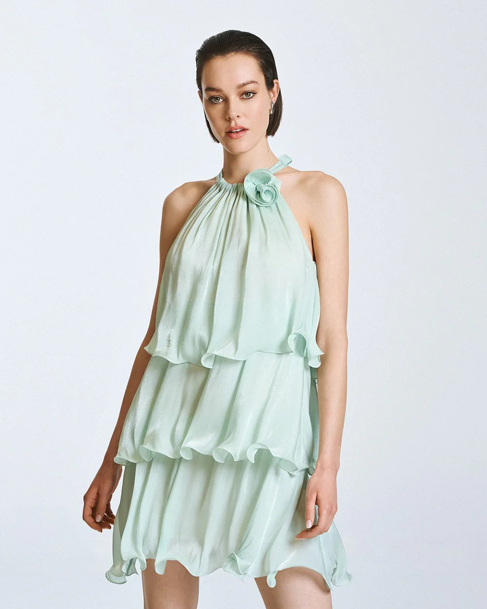 Mini halter dress with a shiny finish and tiered ruffles. Features gathered details at the neckline, a decorative flower and a tie fastening at the back of the neck.