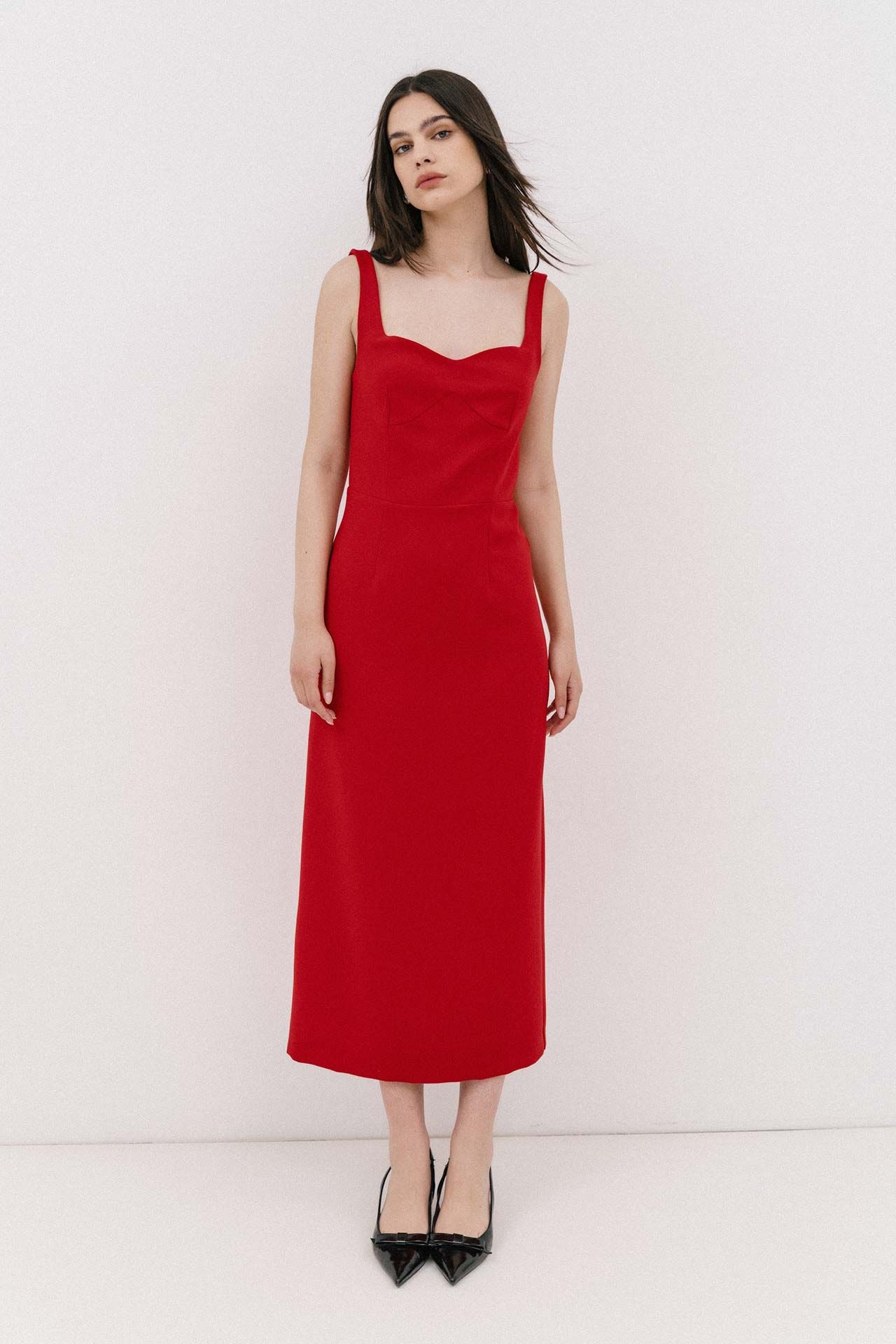 Midi dress crafted from a smooth, tailored fabric, it features a subtle sweetheart neckline, low scooped back with zip closure and wide shoulder straps. The fitted bodice and straight-cut skirt elegantly contour the figure, while a back slit ensures ease of movement.