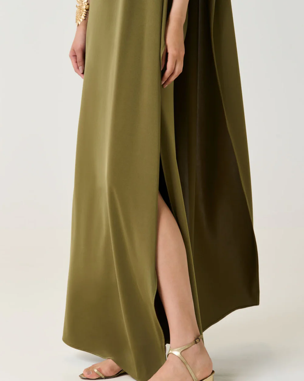 Maxi one-shoulder dress featuring an integrated draped cape-style detail that softly wraps around the shoulder and flows down to the hem. Designed with a side slit and a metal accent with gathered detailing at the shoulder.