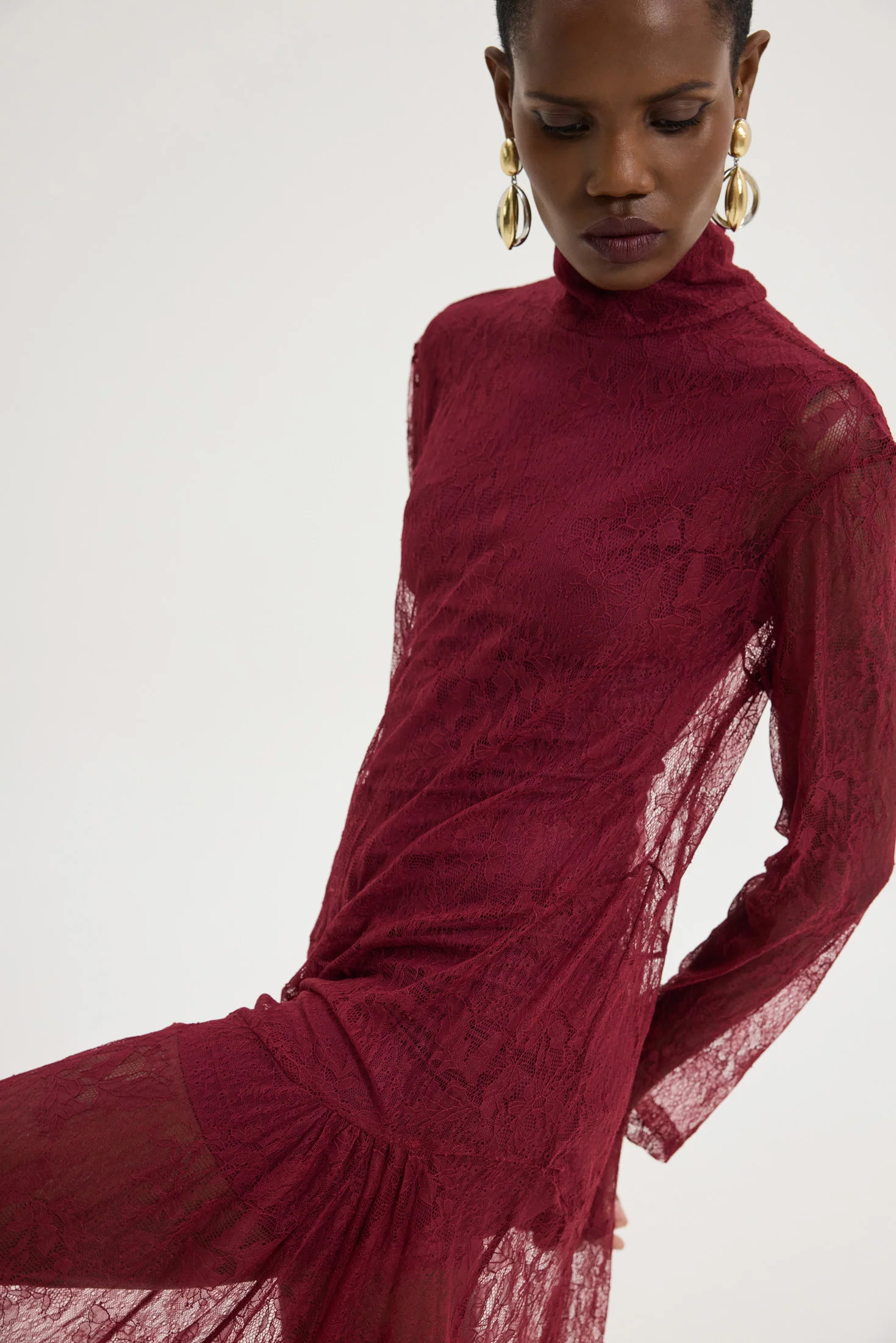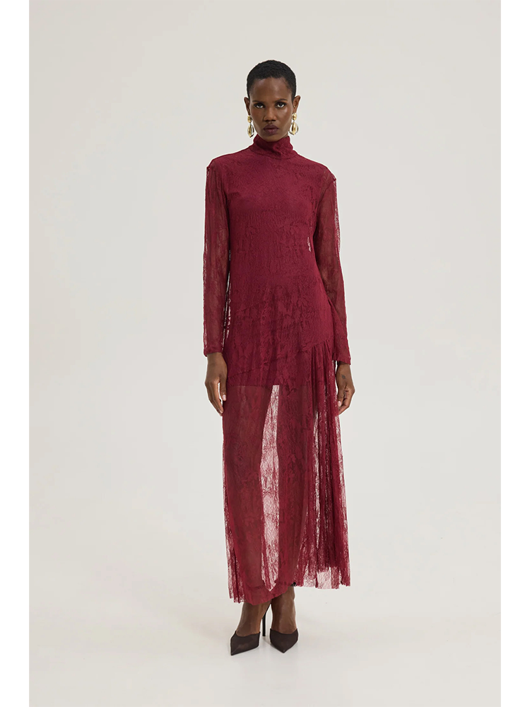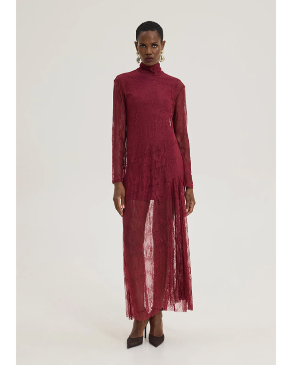 Lace maxi dress with long sleeves, volants, and triangular cuts in the pattern for perfect movement, it offers both elegance and versatility. Wear it with its inner lining as a full dress or without as a sheer lace top.
